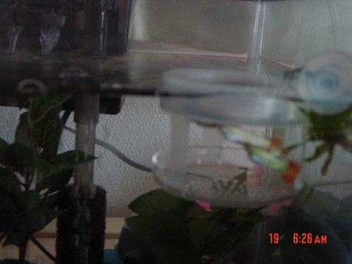 土曜日に生まれたグッピーの赤ちゃん♪全部で4匹でした>゜)))彡とりあえず2Lペットボトルをちょんぎってふたの部分に穴を開けてエアーが入るようにして・・・旦那がやってました(爆)1センチ位のが4匹、元気に泳いでます♪わかりにくい写真ですね~~~(苦笑)エアーのほうがでかく見えるところがポイント?(^^;2Lペットボトルも結構長さがあるので、上に下にと泳いで遊んでるため写真には2匹しか写っていなかったのでした(笑)食欲も旺盛で、バクバク食べてます(^^;1週間位したら、どれくらい大きくなるのかしらん?