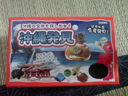 トイザラスに行ったらこんなものを発見しましたこういうの大好き♪(笑)中はこんな感じです「沖縄発見」のわりに、japanとは書いていますが沖縄は見つけられません(爆)ちなみに何が欲しくて買ったかというと・・・・ジンベエザメ希望(o_ _)ノ彡☆ばんばんでもこちらに書いてある商品は、いい商品のほうで・・・それ以外は・・・・いまいち商品(爆) 特に貝は絶対いらない(^^;早速作業開始♪・・・・し、しばらくすると・・お約束で、いまいち商品ゲット(爆)あまりに悲しかったので、慰めるために旦那が残り砂で作品作り(笑)その1偽ジンベエザメ(爆)その2たぶん、トロ(o_ _)ノ彡☆ばんばん約500円で遊ばせてもらいました(>3