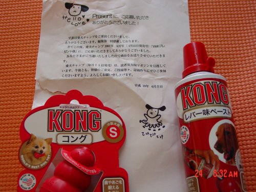 先日、帰宅したところ宅配の不在通知が(^^;どうも見覚えのないところからのお荷物らしい(・_・?)ハテで、再配達してもらって、中身を開けたところ・・紙がぐちゃぐちゃで、さらに破けているのは・・当選した喜びの表れで(誤)、かふぇおれが破いたからですヾ(ーー;)ォィ応募したのはなんとなく記憶にあるけど、まさか当たるなんて♪お留守番必須アイテムのコング、何個あってもいいので助かりますv( ̄ー ̄)vさらに使ってみたかったけど高くて買えなかったレバーペースト♪興味津々さんは、早く開けて欲しくてo(^o^)o ワクワクです(笑)コングにレバーペースト塗って渡したら、喜んでベロンベロンしてました(^^;愛犬チャンプさん、どうもありがとうございましたm(__)m今月も応募したのでよろしくお願いしまぁ~す♪(笑)