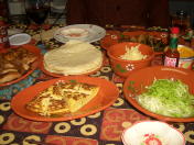 こじんまりと、いつものM夫妻と3人で新年会。メキシコに旅行へ行った友人から、メキシコ食材のお土産をいただいたので、『メキシコ大会』にした。東京の友人から、高級ワインをいただいたので自宅からワイングラスを持ってきて飲んだ。いつもはちっちゃいグラスで飲んでるのに、、、メキシコ料理といえば『タコス』しか思いつかなくてラテン大会とダブってしまったけど食べた。でも、やっぱりおいしい。考えてみたら、この辺にメキシコ料理の店って無い?無いものは仕方がないから、自分で作って食べる。M夫妻もおいしい物には妥協しない方たちなので、食べ物の話は、尽きることなく延々と。。。水面下で(?)話題になっている『アムプリン』を持ってきてくれた。素焼きの容器に入って届くプリン。大きい。直径20cmもある!しっかり焼かれてるの。食べ終わった後の容器は、直火もオーブンもOKで、複数個あっても重ねられるつくりになっている。M夫妻は毎月このプリンをお取り寄せしているらしい。私が知らない事もたくさん知っているので、話をしていてとても楽しい。M夫妻以外の大会メンバーも、おいしい物大好きだから勉強になりま~す。ところで、昨日はまた津波で避難勧告が出た。どうなってるんだろう?地球。