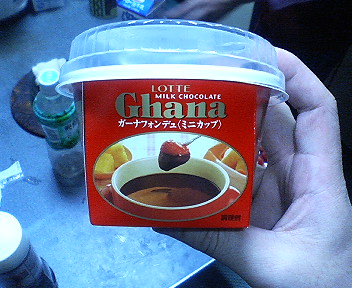 前からも記していますがσ(´ω`)は大の甘党でしかもフルーツ大好き先日も買い物に行った時スーパーの入り口の近くにあるイチゴが真っ赤に色づいて無意識のうちに4パックほどカゴの中に入れてしまいました (*゚∀゚)・∵.ブハッ!!・・・でいつもならそこで終わるのですが気になった物が横に置いてありまして(;´・ω・)ン??・・・これは何なんだ?と手に持ってみると(´・ω・`)"ホゥホゥ チーズフォンデュと言うのは聞いたことあるけど、なるほど!デザートをチョコにつけるのかぁ・・・チョコバナナもあるんだし面白そうだと言うことでご購入(^^)今夜の晩飯の後で早速試してみましたまずは容器にチョコを入れて・・・沸騰直前にまで暖めた牛乳を注いでチョコを溶かす勿論忘れちゃいけない!イチゴ様の登場溶かしたチョコをたっぷりとつけて イタダキマス((美´~`味))モグモグイチゴを食べた後の残ったチョコでバナナも試してみたりして(^^) ( ´З`)=3 ご馳走様でした