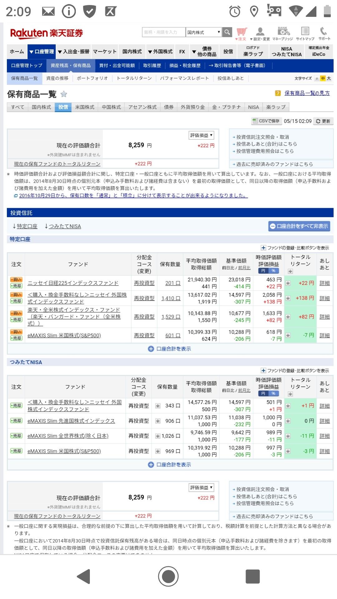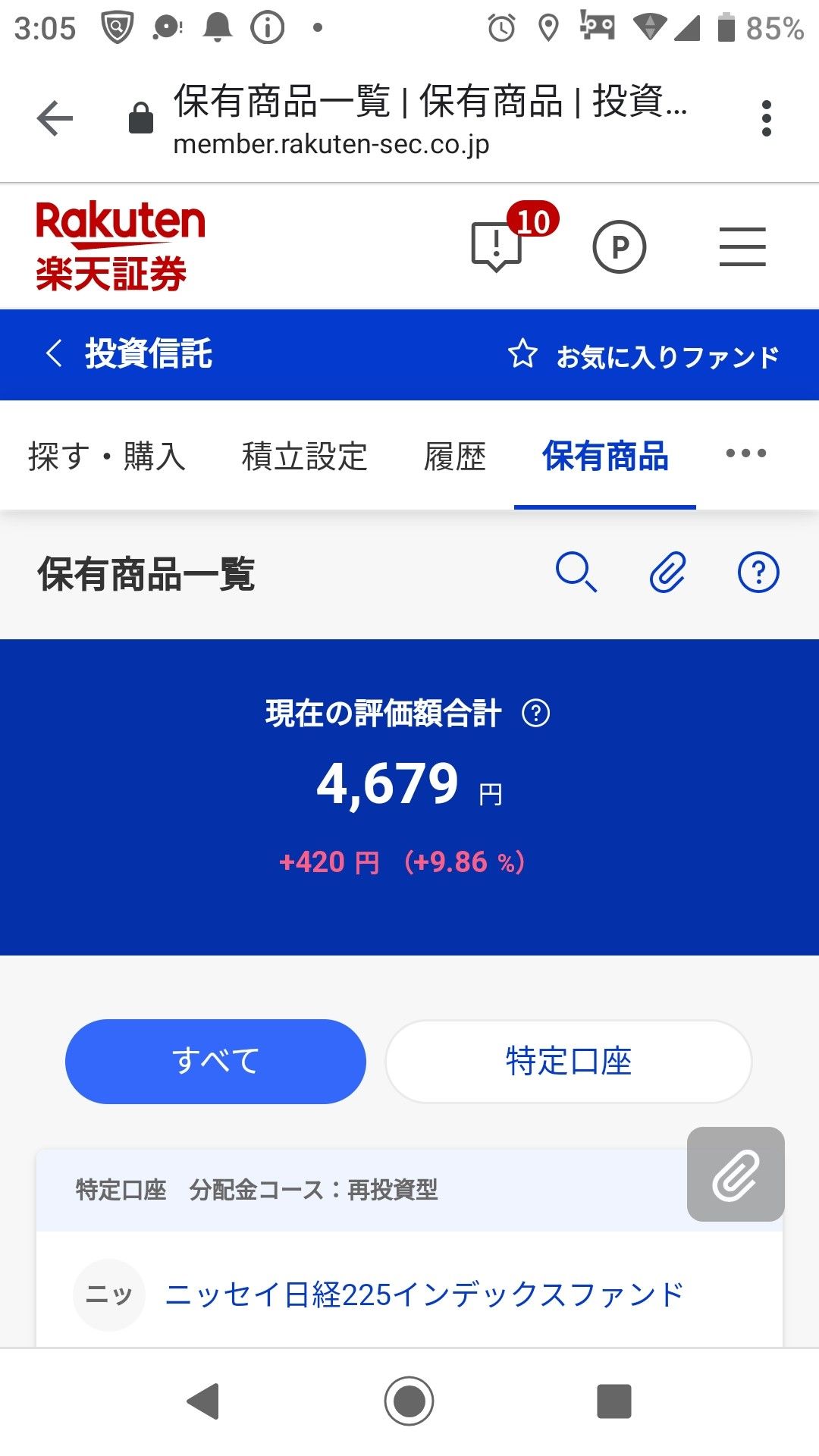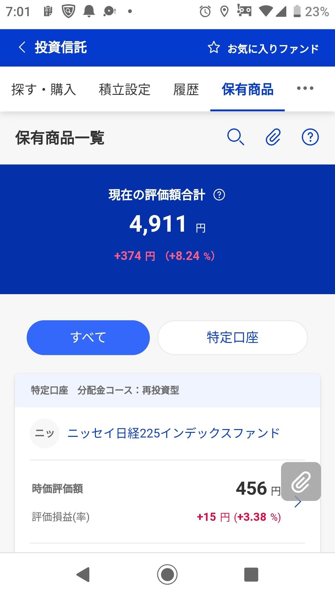 ニッセイ日経225インディックスファンドを145円ぶんスポット購入したところ 評価益が少しあがりました。 〈追記〉 最近、眠くありませんか? 私は眠いです。 子供たちの学校がはじまり 家族の目覚まし時計でもあるので 朝4時から5時ぐらいの間に 起きています 起きて家事をするでもなく1時間は 自分の好きなことをして それから子供たちを起こしています 今日は雨が降るから傘を持っていくように 子供にいうと 「雨は降ってないし、誰も傘を持って 歩いていないから持っていかん」 と言われました(>_