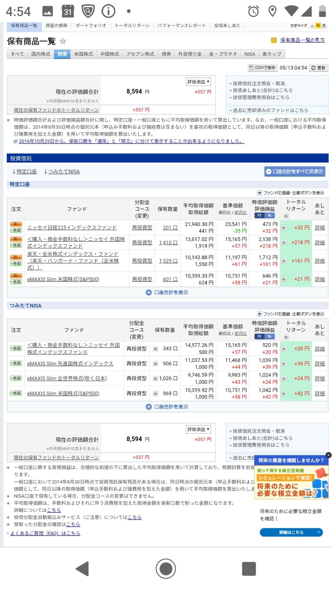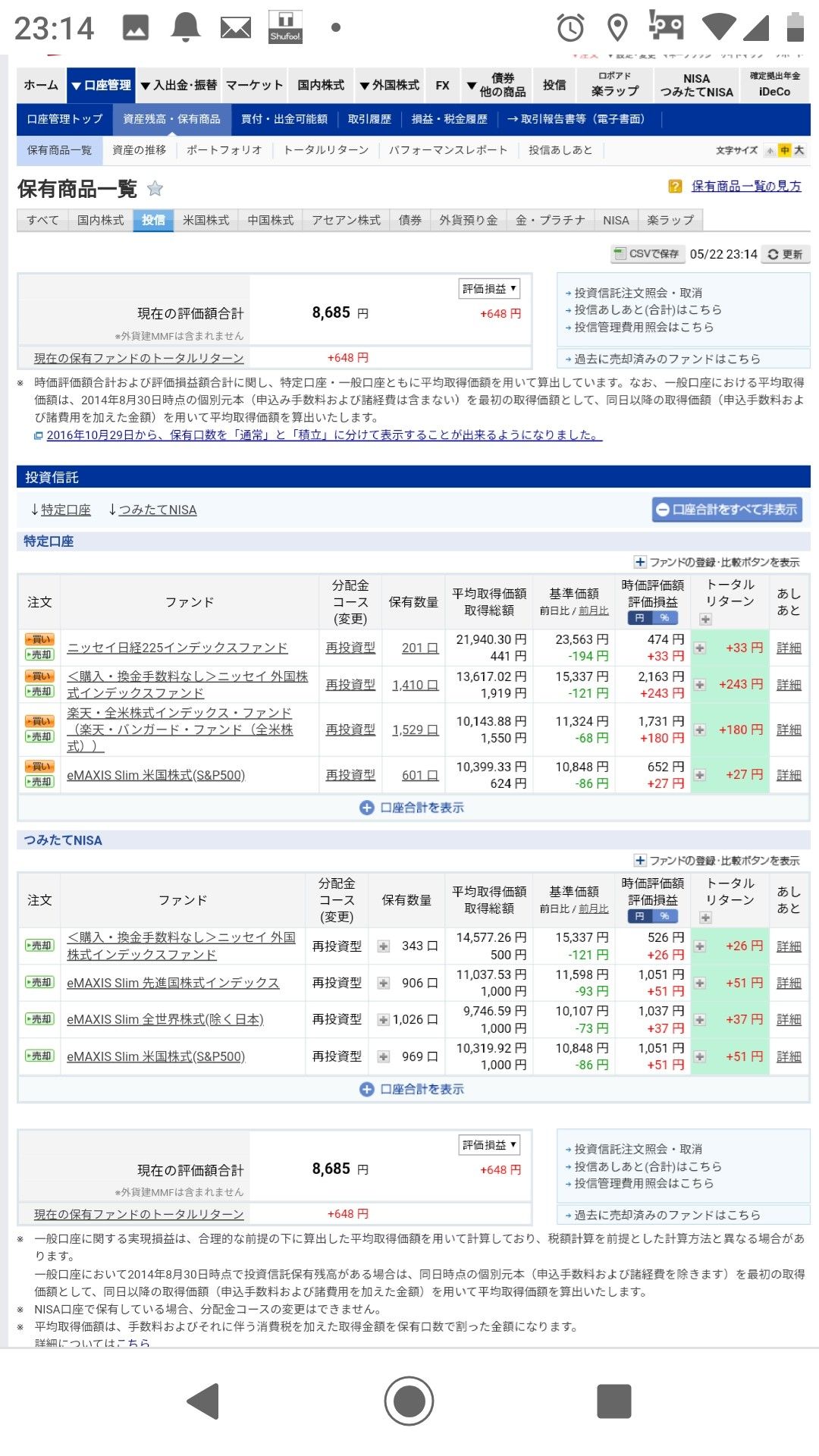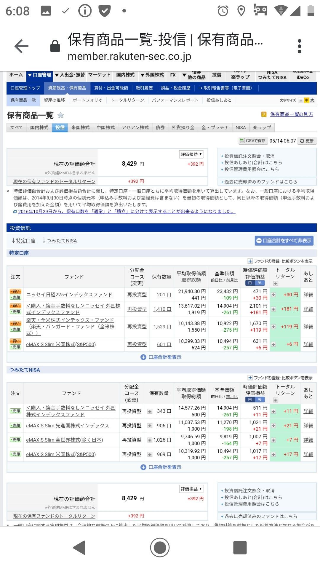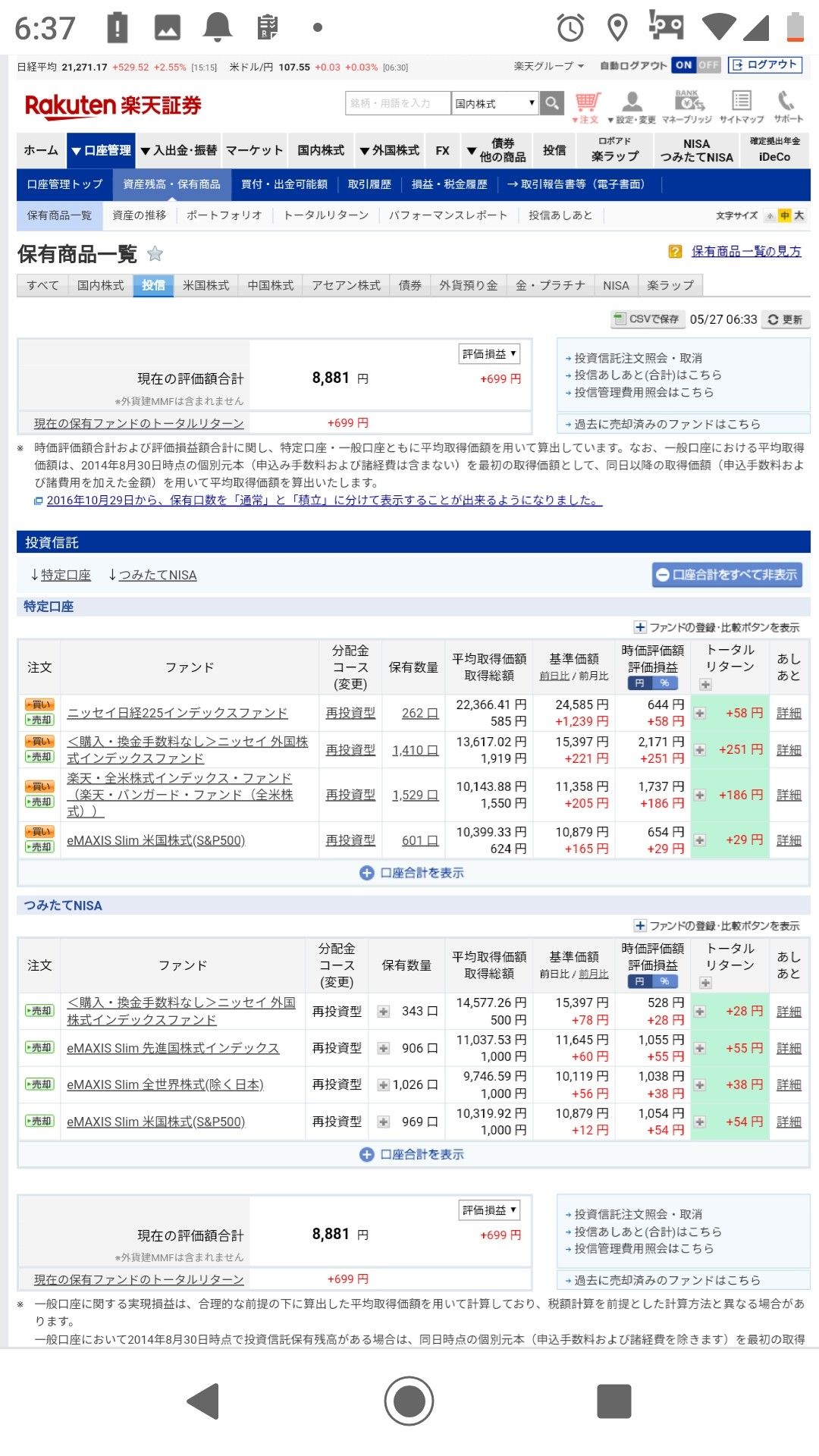 おはようございます 今回は、 eMAXIS Slim 米国株式(S&P500)を 278円追加購入しました。 全体的に下がってはいますが 評価損益が約8%です つみたてNISAも5月1日に カード決済で購入しましたが 今のところ反映されていないようです これからが楽しみです☆