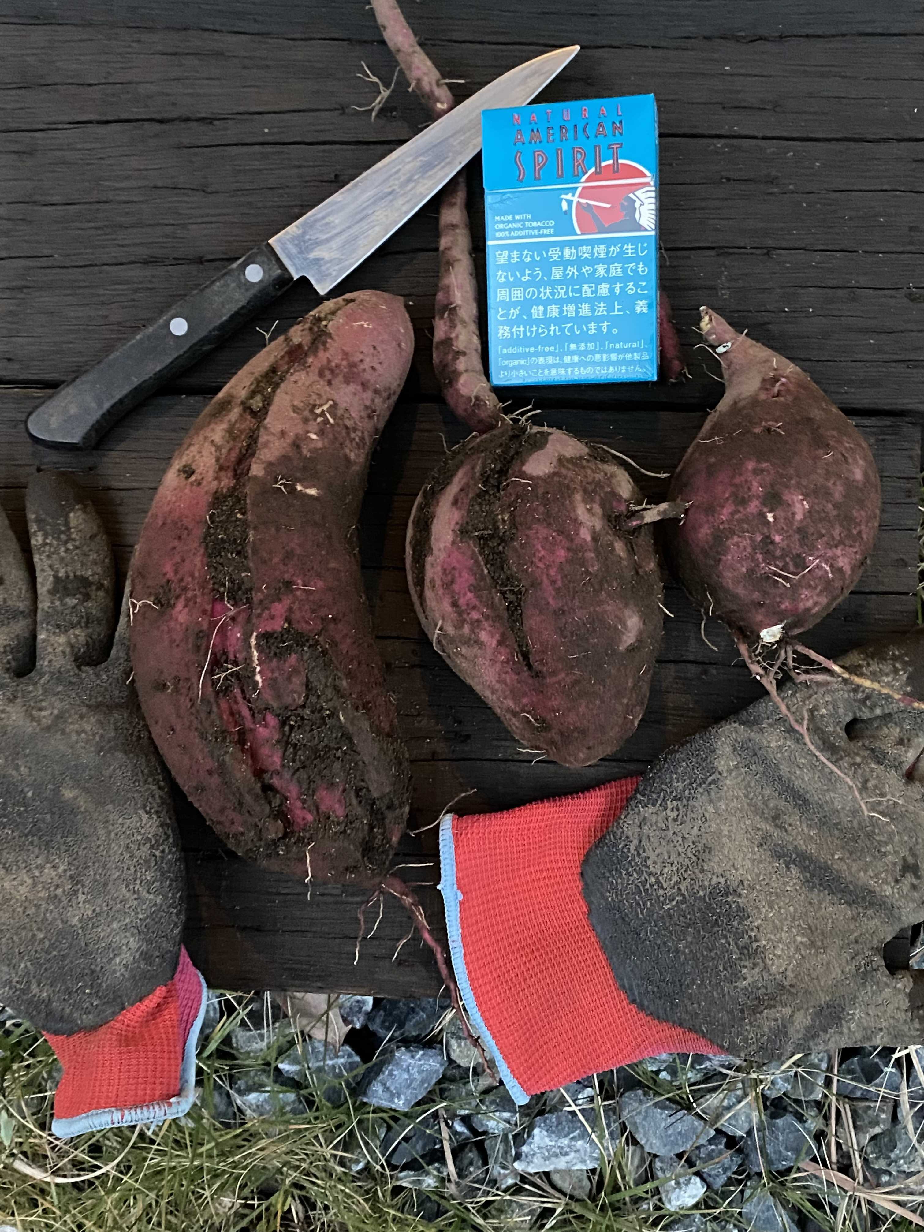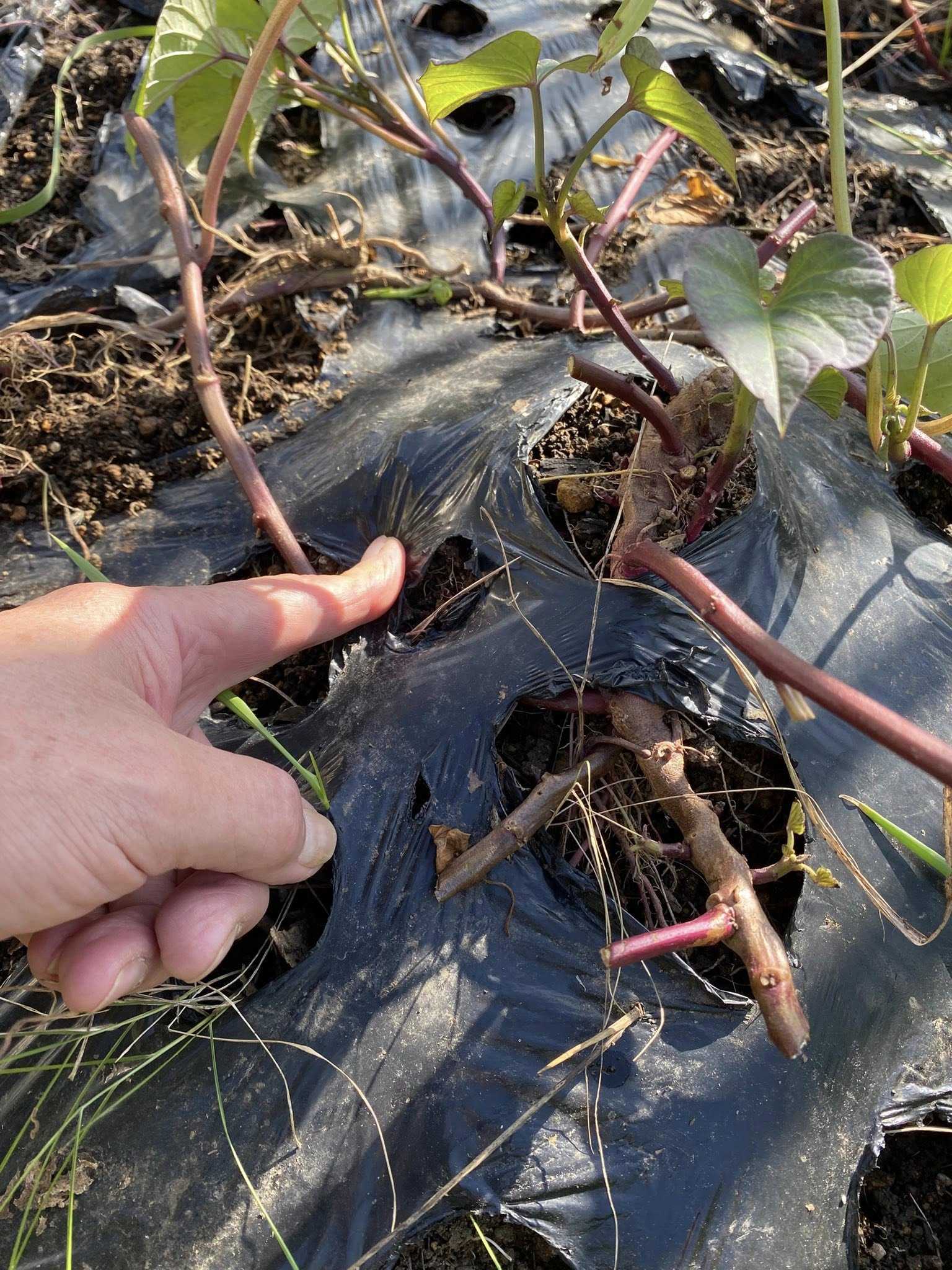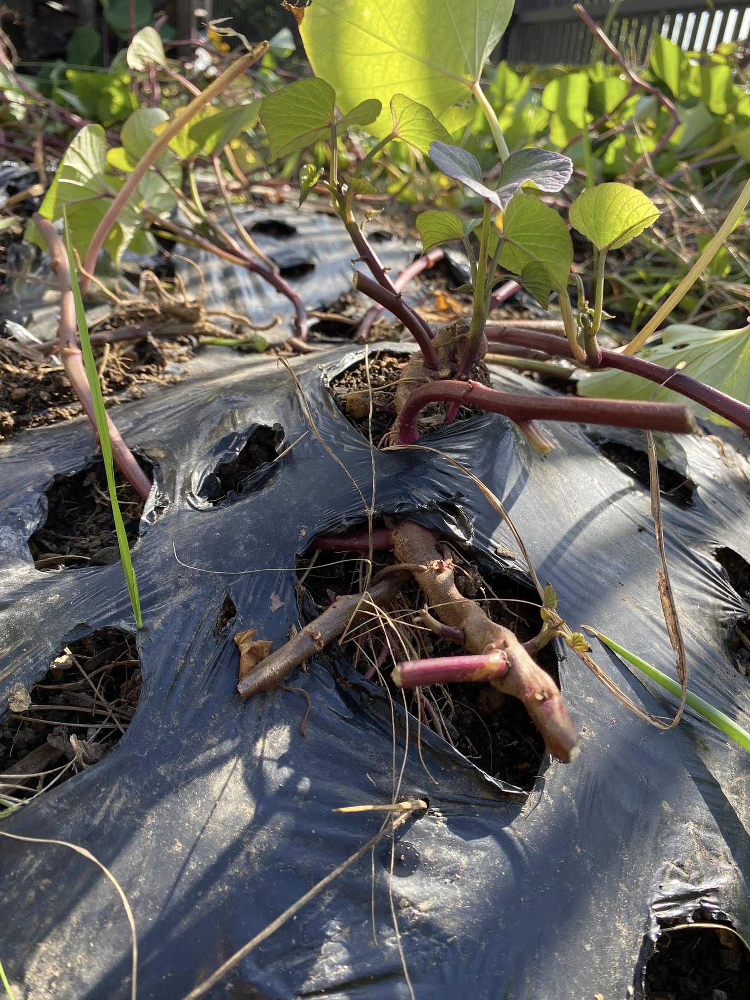 サツマイモは収穫の2週間前に蔓を20cmほど残してカットしておくと、デンプンが芋に戻って糖度が上がる、という話🤔