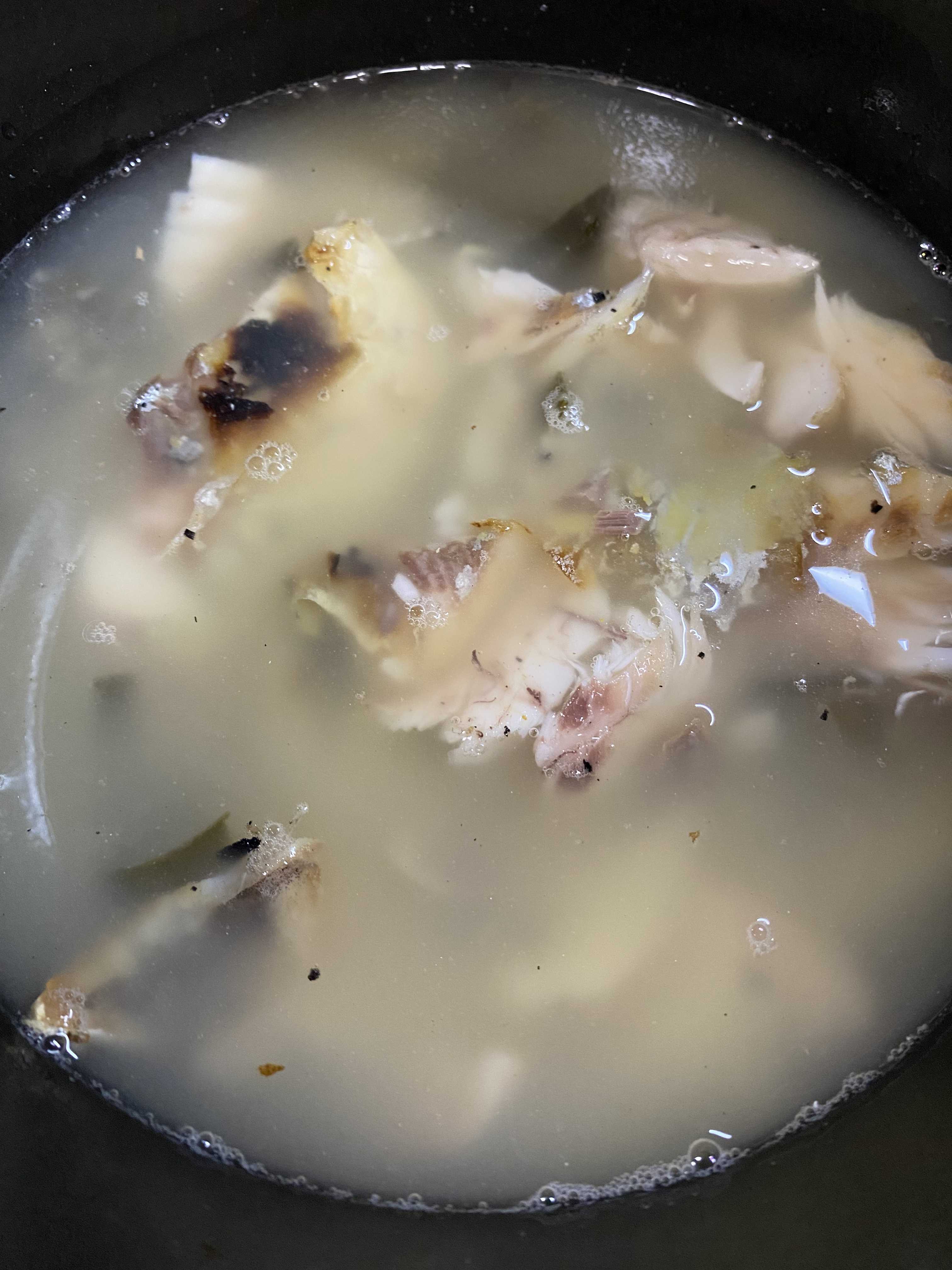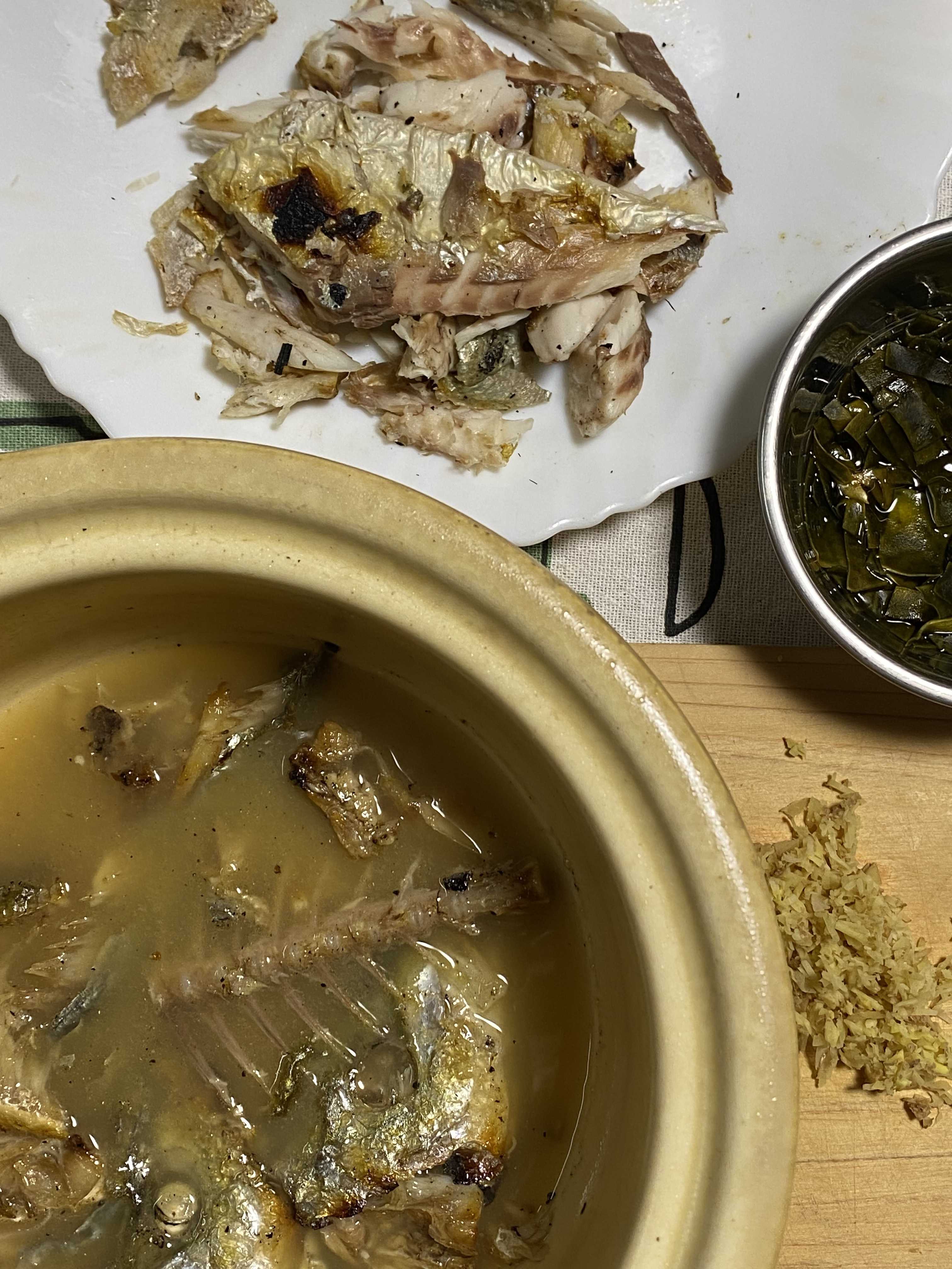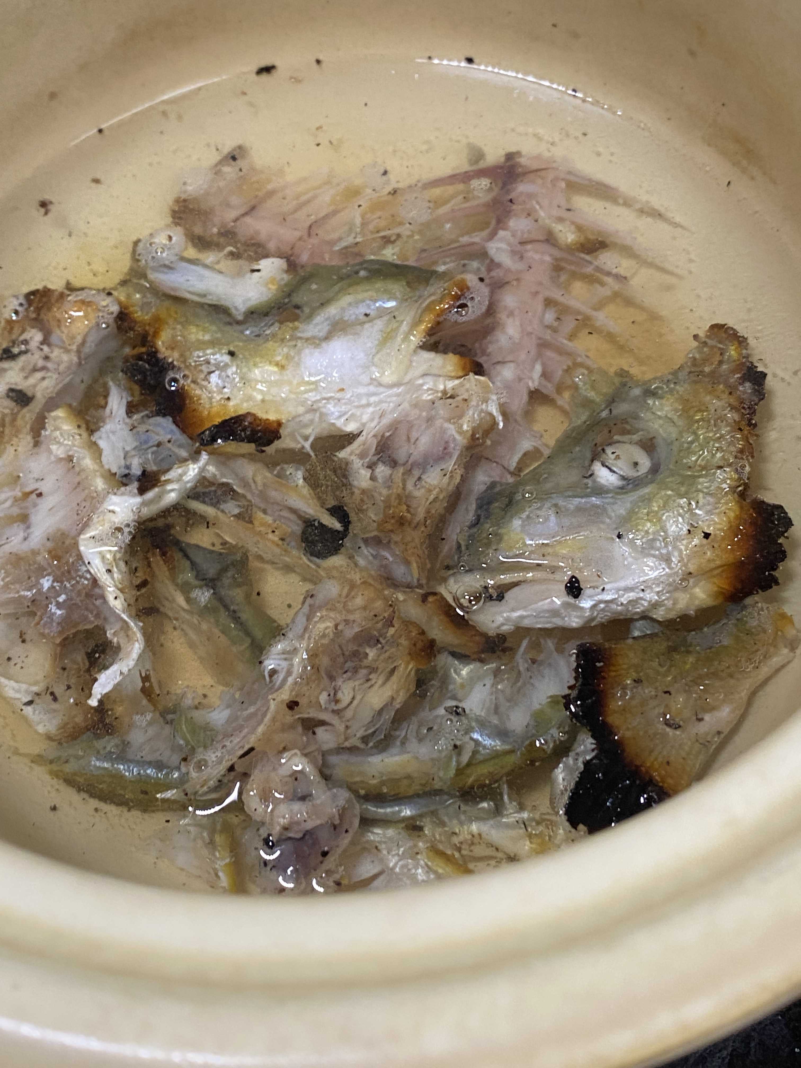 骨を外して、ガラの塩焼きと共に土鍋に水と味醂を入れてダシを取ります