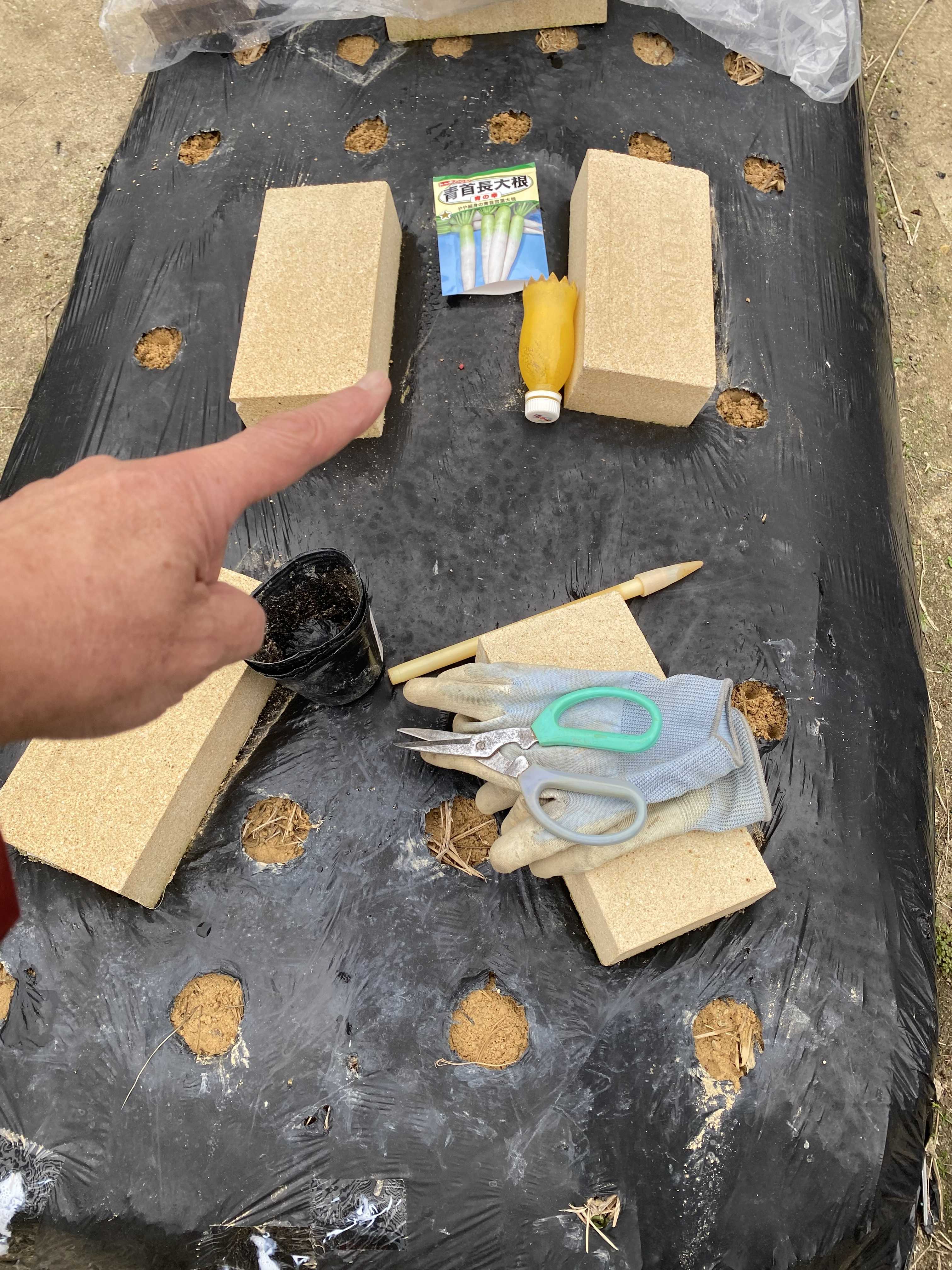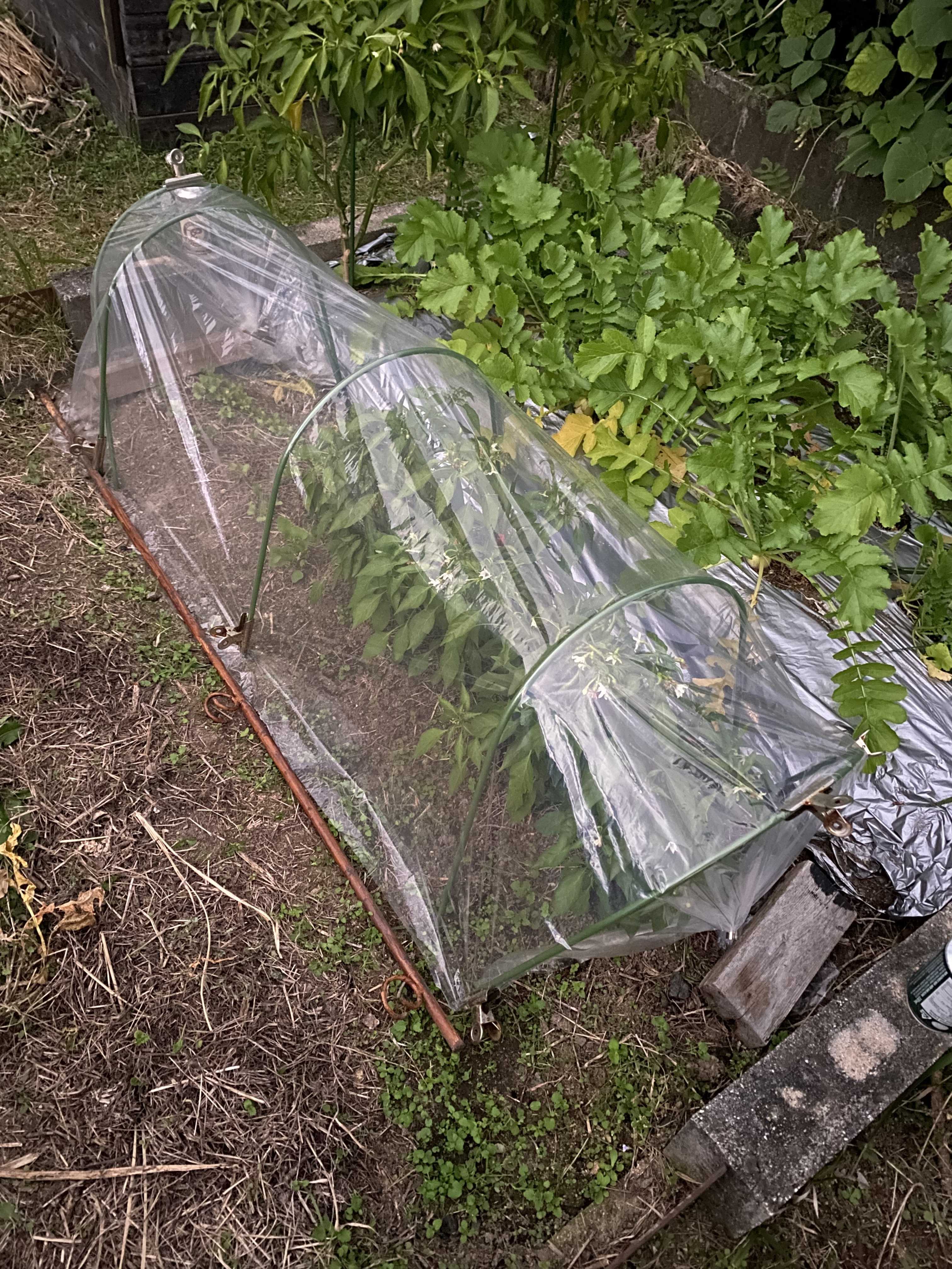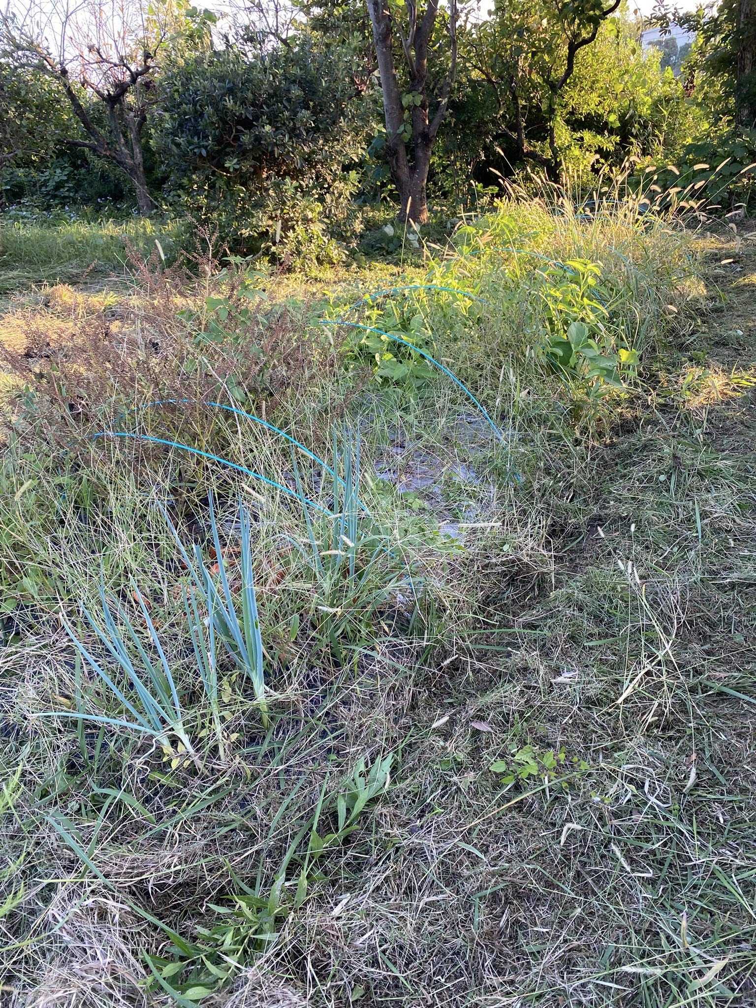 芝エリアの菌ちゃん畝真ん中、大根用と思っているので、タイミングを遅らせて収穫分散を狙ってたけど、遅すぎかも💦青首と時なし、紅白はつか大根、、東西向きと、通路寄り縦方向にも真ん中へ縦に3つこれは東西向きに最後に軽く灌水して、畝ごと透明マルチをじかに被せて保温ねらい。来週寒そう!発芽が揃ったら透明マルチでトンネルにして暖かくして生育補助狙おう。ニンニクもそうだけど、フミンとかリキダス、ねのひらさんの液肥をあげるといいかもな?追加。11/15夜になって、昨日探していた「秋大根のタネ」が見つかったので、無理矢理あちこちに割り込ませました。写真を撮っておかないと、区別が付かないでしょうね、、なので、画像がいっぱいwもう少し引かないとどこら辺なのかわからないwここら辺。3箇所あと別畝、オクラあと。左は内藤唐辛子🌶️これも植え付けが大きく遅れたので今、結実はしていますが、赤くならないうちに霜にやられて枯れてしまいそうなので対策を、、、、考え中なのでアーチの準備。先ずは透明トンネル、そして寒冷紗かな。午後からは草刈りをしないと。11/14-15まずはせっせと草刈りやってます、明日の日曜も朝から草刈りw唐辛子はもちろんですが、大根の苗も、温かくしたほうが初期育成には有効みたいなので発芽してきたら、透明マルチでトンネルにしようと企んでいます。11/19追記:大根生育の応援策、、💦温室育ち、ならぬ トンネル栽培の模倣。なにしろ、いきなり季節がひと月先に進んだのでこりゃいかん! 慌ててやりました。もともと、発芽段階でマルチ穴に種を入れて+その上に透明マルチを直に被せていますが取り敢えず、今日のところは畦側の両サイドから囲い込み。風除けになるだけでも意味はあるかも。画像だとわかりにくい、、黒マルチの上から透明マルチを直載せしてあります。左右の畦側からそれぞれ畝を囲い込む形で真ん中は開いてます。❶PPテープで貼り合わせるくらいが丁度いいかも? そうするとその段階で直載せマルチは不要になる。❷直載せのマルチを上に載せ直せてクリップ留めにすれば開閉自在になるから、その方がいいだろうな🤔ふむふむ🤨🔶夜になって冷え込んできました。 これは放射冷却すごいなと、、閃いた。空いている天面に寒冷紗を被せてあげると喜んでくれるかも?ゴソゴソ.....画像がボケピン、、これでヨシ❣️