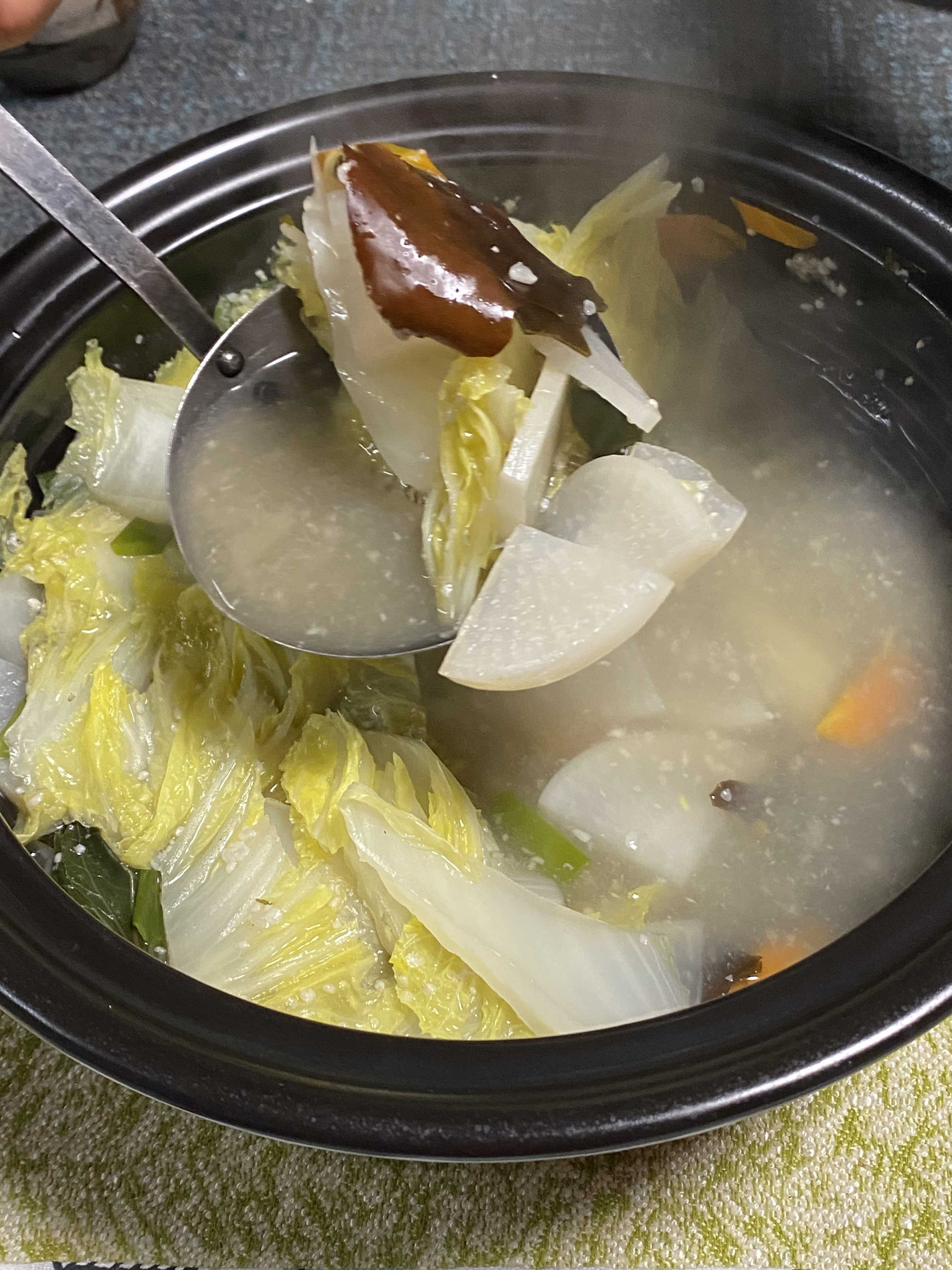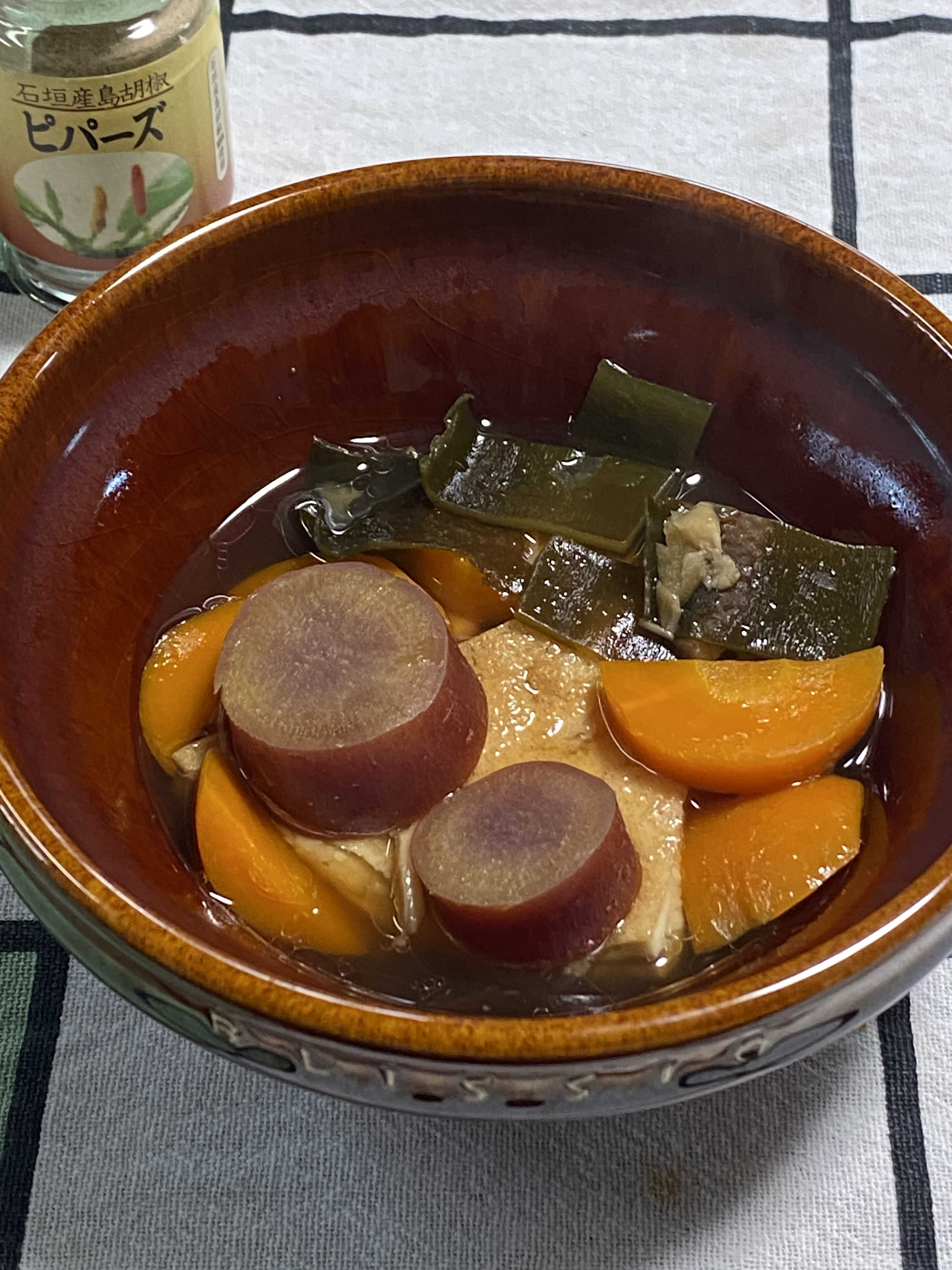 今日も雨降りで肌寒いので、お昼に沖縄風おでん?てぃびちはメインじゃなくて出汁のつもりなので、盛り付けに豚足の姿はないですw、 ニンジンとサツマイモはフクムラサキ。ニンニク+生姜に昆布をいーっばい!味醂としょうゆの薄味です♪🔸沖縄のおでんのダシは昆布と鰹節といいます、私の場合混合削り節とかナムプラーをダシにすることが多いですが、尿酸値低減措置として、このところプリン体削減中のためあしからずっ💦そうそう、空芯菜の代用でサツマイモの葉柄を入れました。夏のあいだ中、毎食なんでもかんでもウンチェー(空芯菜)だらけでしたが、うちのウンチェーはそろそろ終盤を迎えていて花芽がつき始めて徒長しまくり。そろそろ終わりです。 【第一部】昼の部の仕込みというか、朝からお昼の準備でした。❶別鍋でまず豚足を水から下茹でです、塩を少しだけ入れました。しばらく沸かしてアクが出たところで湯から引き揚げて、お湯は熱々のままお外の雑草枯らしにw❷これもまず、水から沸かします、ニンニク+生姜になぜかローレル❸沸いたところに醤油みりんと豚足に米酢少々を入れて25分高圧、タイマー便利💕 ここからはトロ火。❹火が消えたら自然減圧で 人参、紫芋に厚揚げと水もどし昆布を水ごと入れ、ぬちまーすを少しだけ足しました。味付けはそれだけ。もう一度高圧でゼロ分加圧して完成~❺できあがり。豚足の本体は入れていません、昆布と人参サツマイモと厚揚げと煮汁だけです、極めてあっさり(^^♪【第二部】夜の部お昼の延長をリメイク。 鶏むねミンチと粗びきポークミンチを買ってありました、 鶏と豚のミンチを合わせると旨みの合併症になりますw🔸以前、尾鷲のスーパーshuhunomiseで見た「合い挽きミンチ」をよく見ると鶏と豚だった、、ちょっとカルチャーショックで買ってきて使ってみたら漁師町の常識はスグレモノだと思いました。最近はおうちグルメ情報なんかでも取り上げられ始めました。鶏と豚の合い挽きミンチ、あるいは鶏肉と豚肉の両方使い💕というわけで、鶏と豚のミンチを合わせて、ヨーグルトのホエイも足します。おから、なんとなく食べたくておからの炊いたんでも作るかな?って昨日買った、特に何を作るかイメージしていなかったけどミンチに混ぜたらヘルシーに増量。・オカラだけを混ぜたらパサパサで混ぜにくい・ホエイを使うからそれで湿度調整もできるさー♪まじめな材料でまじめな調味料なら、なんくるないさ。❶鶏豚ミンチ合わせてローズマリーも練り込み、最後は胡椒すこし。❷豚足を高圧で25分加圧すると、骨はゆるゆるに外れてコラーゲン汁になります❸豚足の骨拾い、これを取り出さないと新たな具材が入らないし、ジャマです💦❹んー、丸っこいこの匙を使おう♪ スモールスクープっていうのかな??❺そうでした。昨日採ったサツマイモの葉柄だけ入れます❻改めてゼロ分加圧で完成~。うまそうじゃん、もうお腹すいたー!もう一品、❼できたw 今夜もベジファーストで焦がしキャベツ。さつまいもの葉柄と葉っぱにギョニソを一緒に炒め、今回は味付けもスパイスもなしどうせ私の場合なにかしらこういう事をするしw青パパイヤ茶とココナツファインパウダー案外健康的?? お試しを!