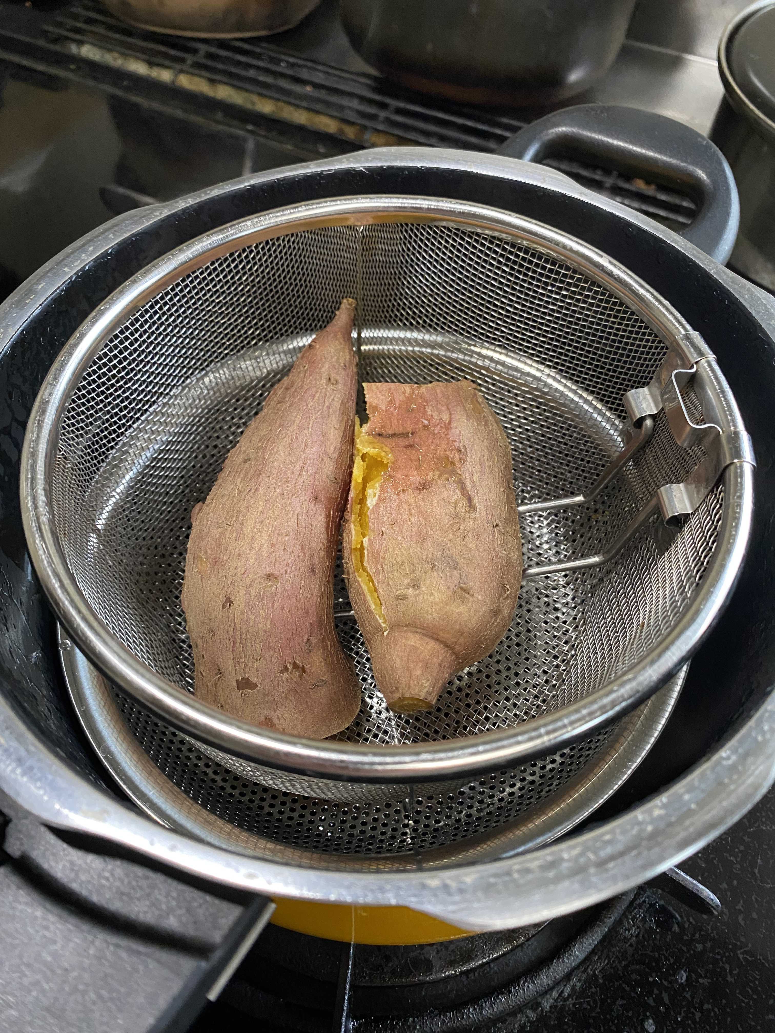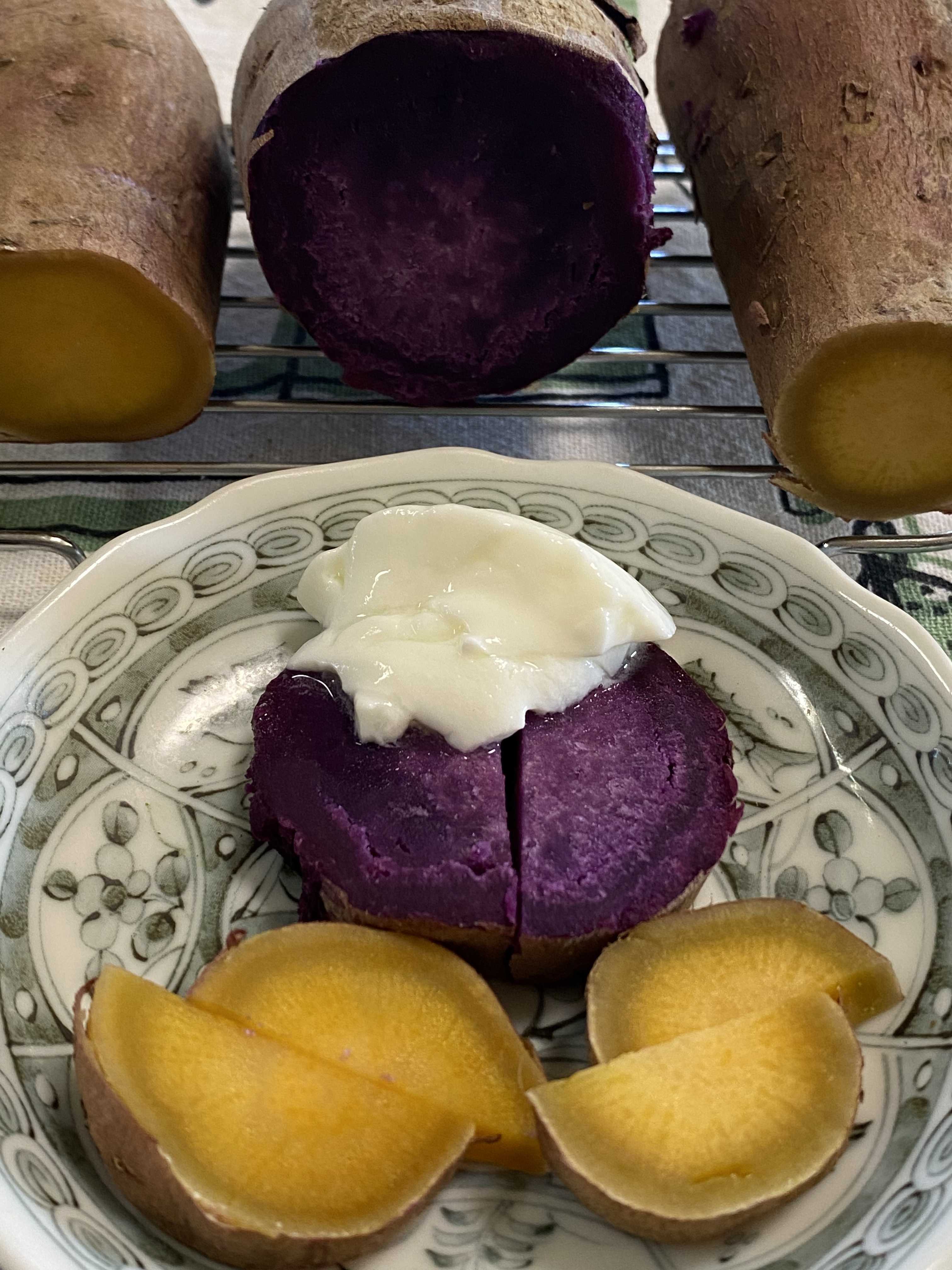 サツマイモマイブームといえばヨーグルトと、最近はサツマイモ🍠5種類集めてストックしてます。うちでまだ収穫していないサツマイモはシルクスイートだと、土曜日に明らかになりました。今回は、手早く圧力蒸しで、おやつ...の巻。紫芋と安納芋💛ヨーグルトを載せてみたら、甘みの弱い芋は酸味と一緒になると甘さを感じる。サツマイモの香りも際立つかんじ。そもそも好みの問題です、ヨーグルトが苦手な人には無理?安納芋はねっとりして甘みがある、紫芋はややパサで淡白。夏の終わりあたりから茨城産に始まって、それ以降 地物をいろいろ買い集めていますが、アズマ・はるか・シルク・安納・紫、5種類。他にもある?ちょうど、いつものfarmersmarket/A-Coopに行ったらこんなの貼ってありました、なになに、、ふむふむ、、ありがたや..あやこまち? 知らない😐あいこまち? 知らない😐2枚とも右下は知らない品種。あやこまち、オレンジ色って、気になるー。「あい・あや」こまち。このふたつはお目にかかったことありません、なると金時は地物にはありません、以前から徳島産だけ。大きめでちょっとお高い。というわけで、手に入る地物は5種類、いつも小さめを選んできます♪❶ごはんの量を減らしすぎて、あと少しだけ何か欲しいとき、❷小腹のへったとき、少しだけおやつにするとか❸総菜としてメインではなく、煮物・炒め物の脇役に使うかんじ。3-4cm径の輪切りにして1-2cmとか、ほんのひと口💛買ってきた中から、さらに小さめをチョイスしておやつ用ーーーちっちやーw🔸ゼロ活力鍋赤オモリ高圧で加圧ゼロ分。茹でじゃないです、蒸し。 圧力ピンが下がったらオモリを傾けて厚抜き、蓋を開けてスノコに上げて湯気を切るる(^^♪ この時季、常温で保管できるので、テーブルの上にザルをかぶせて、いつでも食べられる💛シルクスイートはキメの細かい舌ざわり。紅はるかは舌ざわり香りと味で損してるかも?、同時に比べるから気になるだけ💦紫芋は装飾品レベルに発色が鮮やかで料理に添えたり、楽しい。ビーツと沢庵みたいですね紫芋と安納芋ですw安納が美味しいと思っていましたが、改めて比べてみると、香りもいいけど、ねっちりヘビー。サツマイモって意外にGI値は高くないそうです、ごはん粒よりも蕎麦の実、みたいな位置かな?その意味でいうと、ねっちりヘビーよりも、甘み淡白な方が減量中にはヨサそーな総括的にAIによると、紅はるかは甘みが強い、、らしいダイエット向きなのはどれかな?改めてそういう立ち位置で味わってみます。しまった!!、紅あずま、紙に包んだまま、食べてない!そういえば、フクムラサキが少しある!これ増やさないと!!ふくむらさきの食味と栄養効果がすごい!>>「ふくむらさき」は、従来の主力品種「パープルスイートロード」よりも高糖度でしっとりとした食感が特徴の、2021年に品種登録された紫芋の新品種です。アントシアニンが豊富で果肉は鮮やかな紫色をしており、「九系255」と「パープルスイートロード」を交配して生まれました。だそうです、、わくわくわくわく💛💑💕【追加情報】...11/19さつまいものGI値は?調理法や品種ごとの数値の違いを徹底解説!