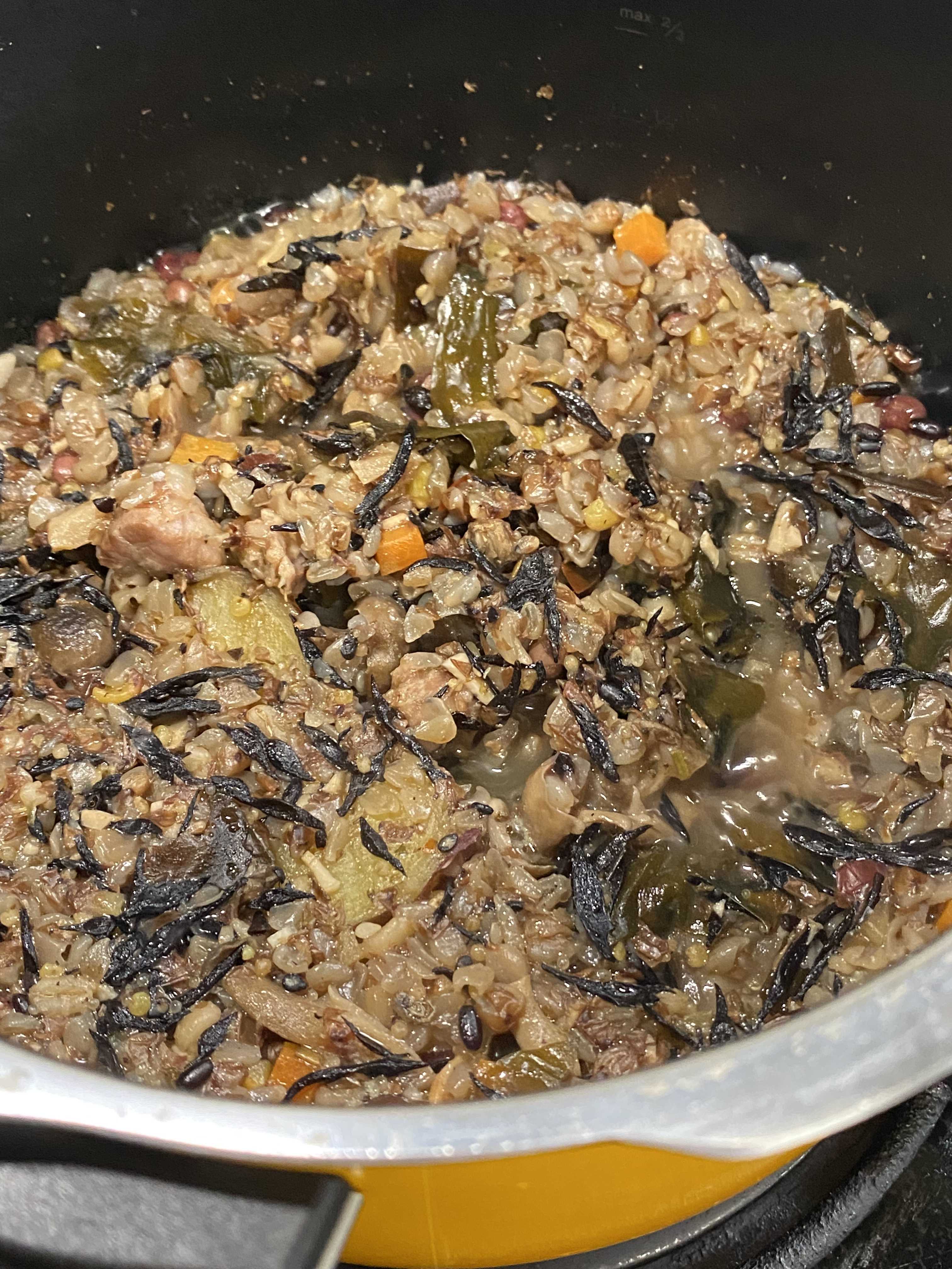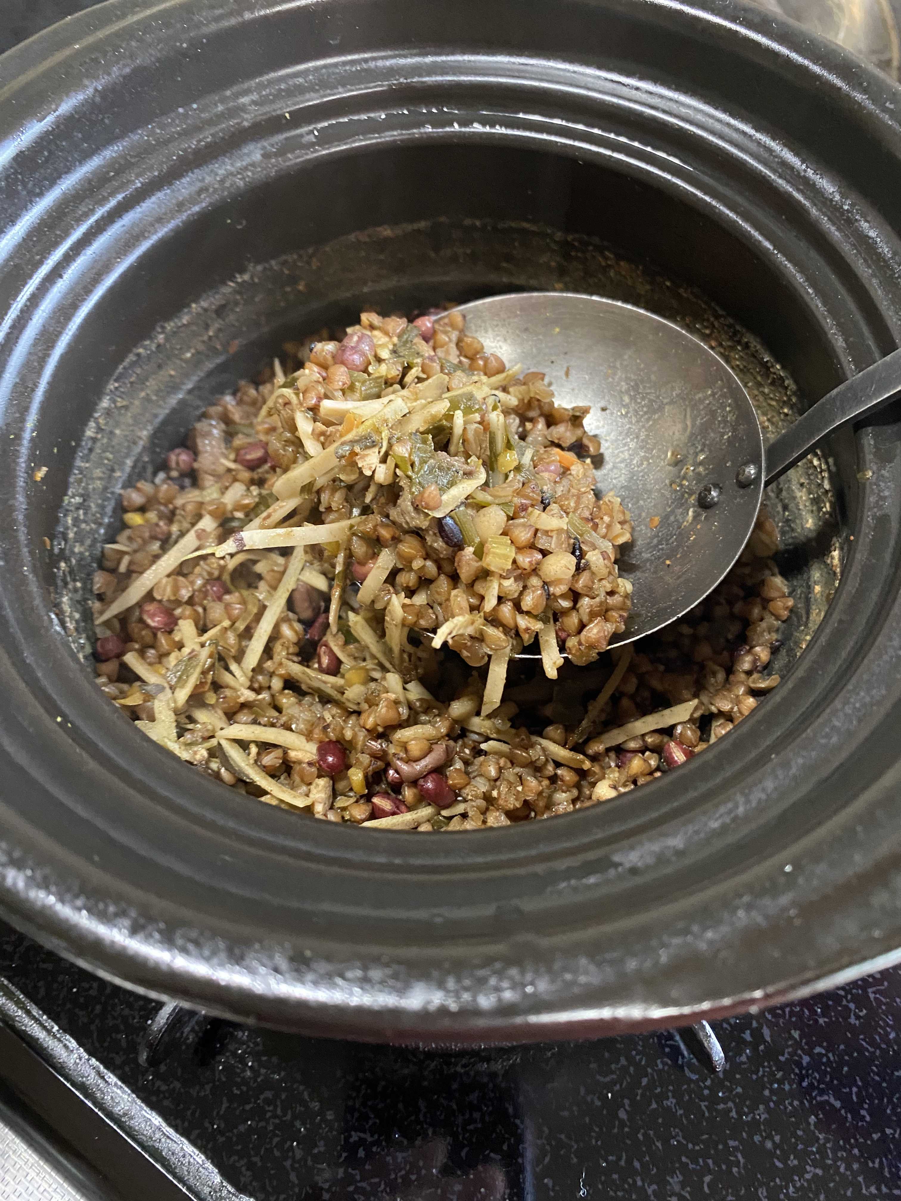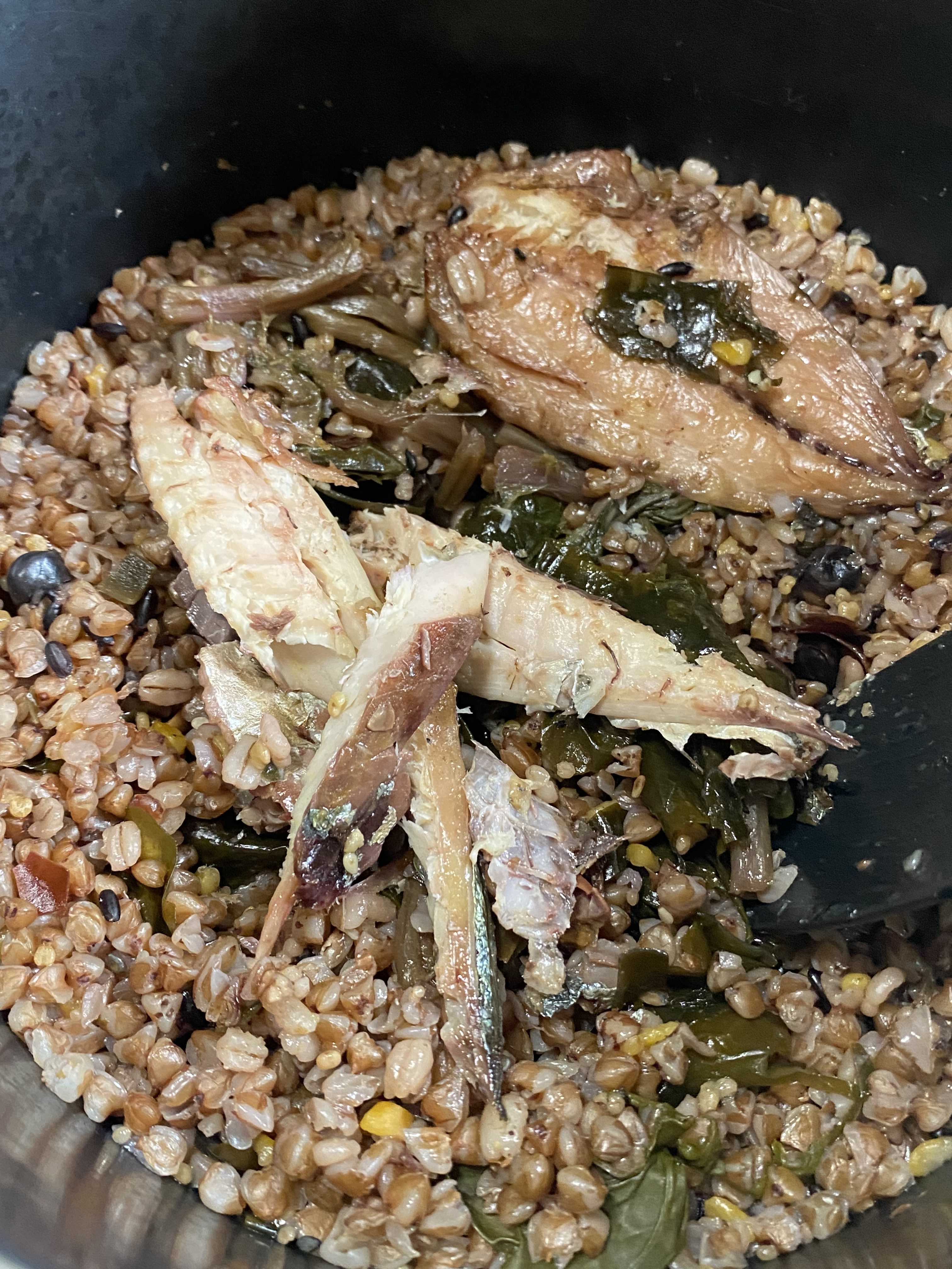 やってみました、昨夜の「+ひと手間の鯵めし」で作った出汁が少し残してあったので、改めて白ごはんでなく「十六穀と蕎麦の実の炊き込み」とお吸い物を作りました。相変わらずどちらも昆布がいっぱいです。昨夜は土鍋で炊きましたがロースト蕎麦の実は土鍋だと食べやすくするには時間がかかるため、、、圧力鍋です。❶圧力鍋に少量のお湯を沸かして、沸騰しているところへバサっと蕎麦の実を入れます。❷十六穀も入れます、昨夜のダシも入れます。<最近これの水分量は計らないですねテキトー。>❸開いて焼いた鯵を埋めますw 沸騰しています。❹蓋を閉める、蒸気が出ていますね、加圧スイッチを最高圧でON。ここは中強火です。❺圧力弁から蒸気が出てきたら、弱火にして7分加圧したら火を止めて放置します、15分くらいですね、蒸らしが終われば完成です。サツマイモ🍠の葉っぱと茎も入れてましたw鯵を取り出して骨を取って身を崩して、、、 ここが面倒、、混ぜたらこんな感じお吸い物とゴーヤーピーマン炒めも友情出演。ぃやぁ~~~鯵めし炊き込み。「+ひと手間」やっぱりメチャ美味いです😋白米でなく蕎麦16穀を食べる機会が多くなっているのでこれは当然な流れです、じつは最初からこっちが試したかったお試しを!