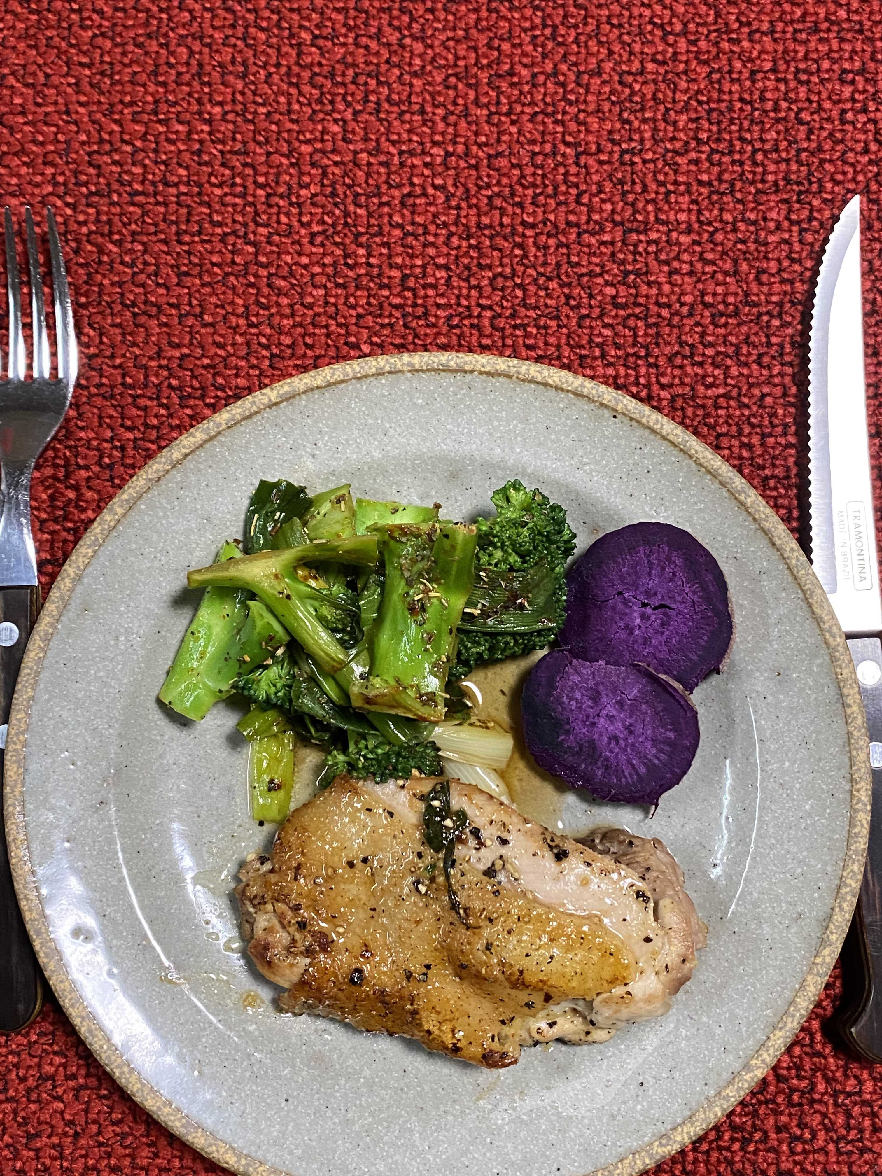 「天草大王」という熊本の地鶏、、初めて知りましたが結構なお値段でびっくりさ。柿安本店の特別セールで半額だったけど100g/300円ってさ、ホントは600円するってかっ!←モモ肉ね。気軽に手が出る価格帯ではない💦ですなwまぁ、そんなわけで期待して買ってきました。普通にソテーです。紫芋さんが彩りを添えてくれました💕大王様の付き添いには、ヘルシーkingさんたちw身も皮も結構な噛み応えです、ソテーにしてしまいましたが、煮込んだ方がいいダシが出てありがたそうですね♪ナイフフォーク・マークでお元気に♪刻んで、ヨーグルトを塗ったフランスパンにのっけ、EXVオリーブ💕これをやり始めると止まりませんw プロヴァンスハーブもかけてみた。べつに、大王じゃなくても、美味しいでしょう。そういえば、これと一緒に阿波尾鶏のむね肉も買ってきました、何にしようかな。。陶板でソテーすると、遠赤効果で普通の若鶏モモ肉も3倍くらい旨くなります、お試しをっ。