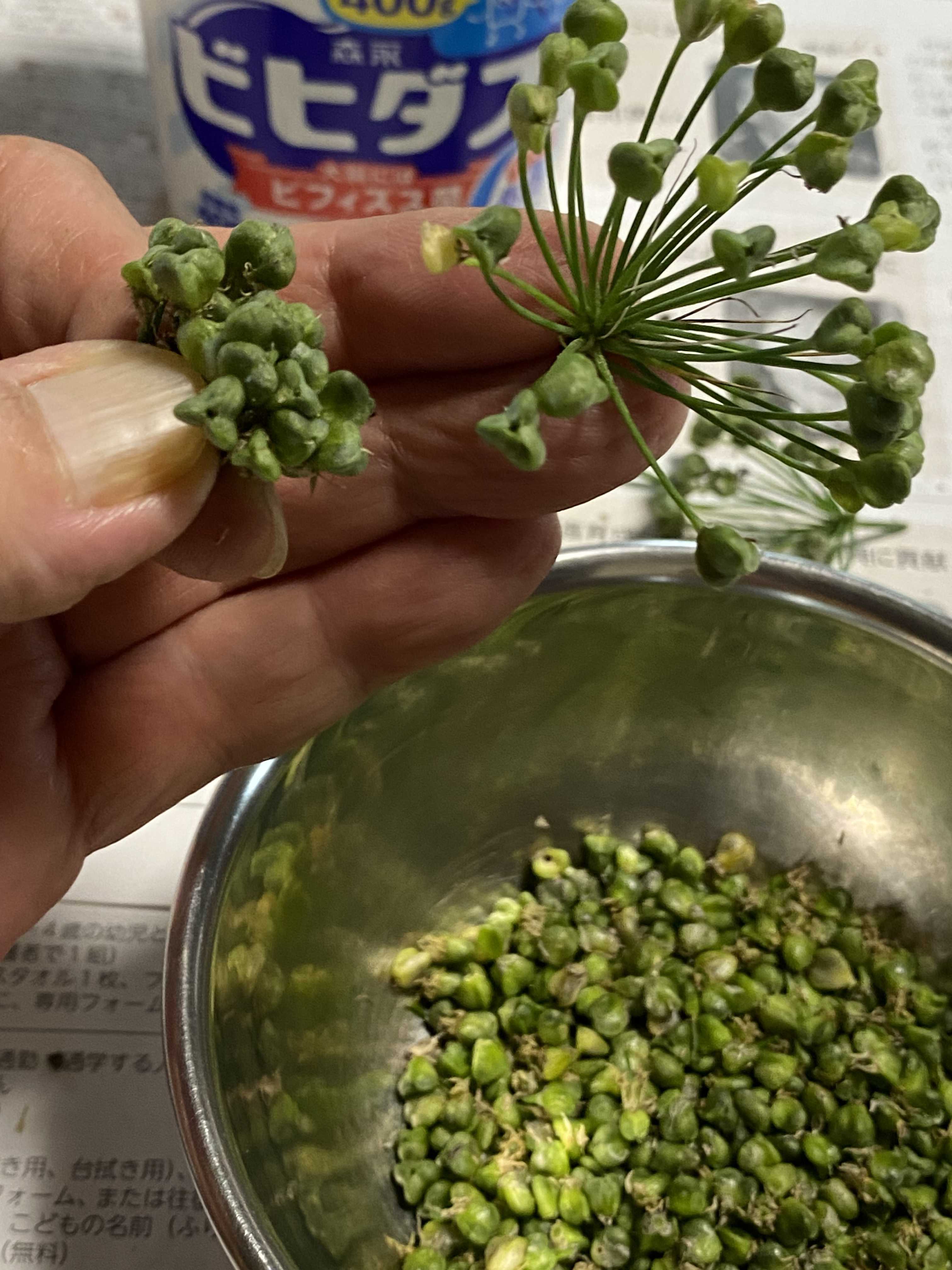 毎年、庭先に生えている野生の韮(ニラ)に花芽が結実すると、打ち上げ花火みたいなパッと開いたような形になります。先ほどソレを20個くらい摘んできました。茎元から先に向かってしごき上げると、キュッと種芽が一列に揃います、自然って面白いですね!これをそのままムシるようにして種芽を外します。それ、どうするの?コレをやっていたらママ👩ちゃんが来て「すごいニラの匂い」って言いました。そうです、濃厚なニラの香りがスゴいんです。これは葉っぱを刻むよりも強いニオイがしますね、これはニンニクの匂い成分と同じ「アリシン」、ニラの花芽が結実して黒くなる前の生命力のかたまりです。これをオイルで炒ればニンニクの代用になるかな?という企みです。🔶ヨーグルトの容器は何かと重宝します💕摘んだ花芽をこれに入れて持ってきました♪種芽を外したゴミ入れにもなりますwペン立てにもなるし、で私にとってなかなか捨てられないブラゴミのひとつです🤣パンチメタル・ストレーナーでゴミを落としてまあまあ落ちてきましたねゴミw、やっぱりか。洗うとまた後がまた面倒です、このままでいいや!そうだアヒージョっぽくいこう♪極小の土鍋10cmほどです、←文字も小さくwオイルに泳がせて混ぜて馴染ませてから弱火🔥着火 ←ニンニク油と同じ。オイルはCGCのPB、スペイン産。ふつふつしてきました、少しだけこのまま我慢して、、弱火のままです、いい感じですね。揚げ物じゃないですから、ここで火を止めました。香味オイル作りならば、火を止めたら油を濾した方が良いと思いますが、種実とオイルもそのまま使いますからこのまま冷めるまで放置して全量を別容器に取ります♪火を入れたオリーブオイルです、できるだけ早く使い切ります💦例の豚こまダンゴでも炒め焼きにしようかなー😘ってわけで記事を書いているうちに、夕食の支度をする時間になりましたw終始弱火です、この陶板は菰野町の三鈴陶器さん灰釉陶板。豚こまダンゴが焼けてきました、ホエイを纏っているだけです、味付けはしていません。なのでまだ、何になるのかは正体不明。甘酢のとろみで食べたいけど何もしなくてもいいです、ハーブソルトにレモン果汁とか、ねちねちヨーグルトを添えるとか、←またかっ!?何にもなしで食べてみました問題なしです😘青パパイヤ茶が振りかけてあります🫠お試しを。