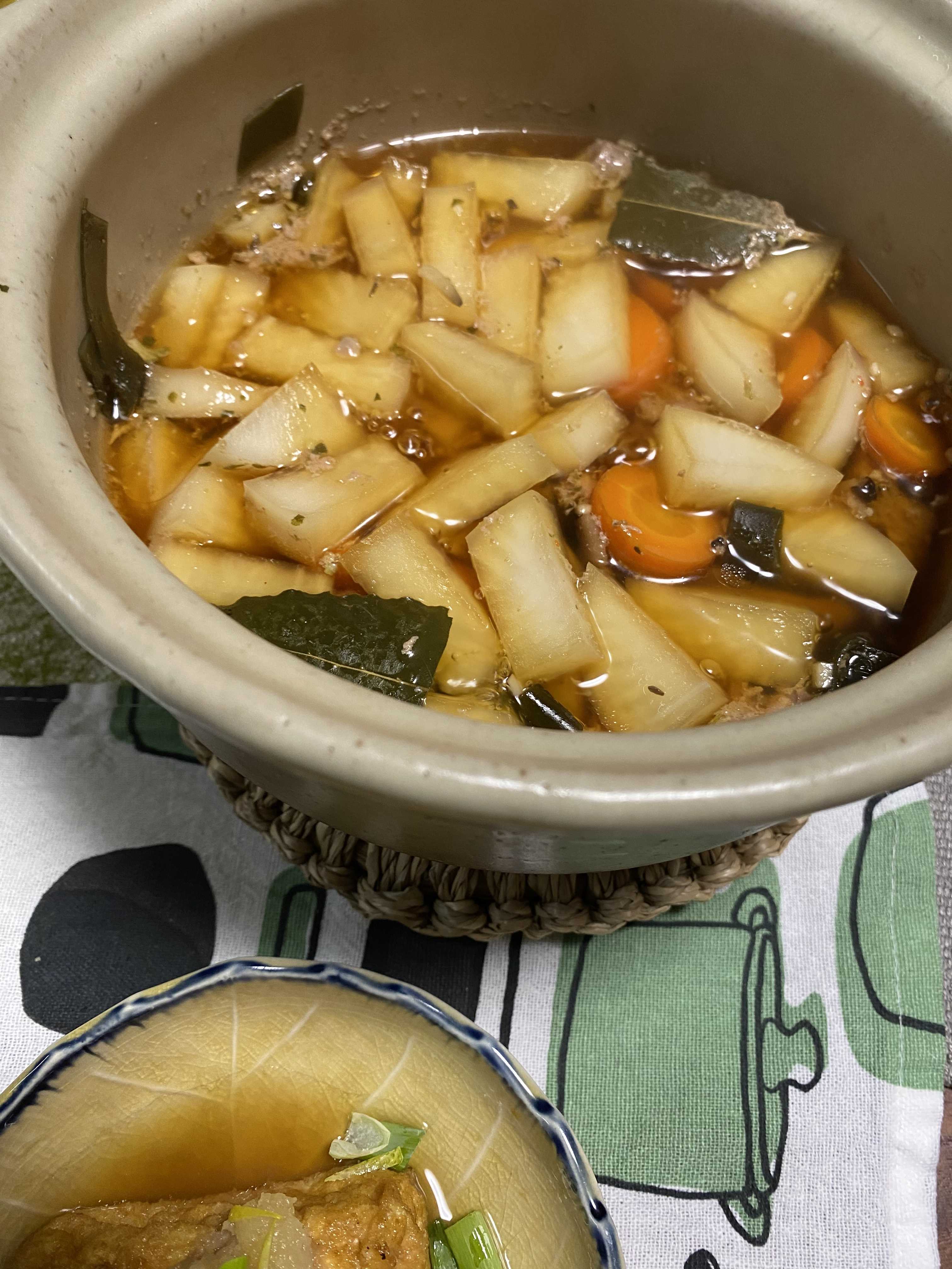 今日はストーブの上に載せた土鍋で1時間コトコトやりました。🔸今回は、全部仕込んだ土鍋をストーブに載せたらそれで終わり、というチョー簡単な手法。土鍋にカップ1ほどの水を入れたら、ニンニク🧄生姜🫚と多めの昆布を切って入れ、みりん醤油に塩少々。グルト漬けの肉は2-3cmに切って大根ニンジン、適当に切って、冷凍してあったシメジを入れたら、適宜 混ぜ合わせてならして、最後にローリエを載せて、蓋をしてストーブの上に載せた、それだけ。🔸ママちゃん、横で見ていて「お醤油もみんな最初に入れちゃうの?」と不安そうでした。あとは放置です、小一時間もしたら、なんかいい匂いがしてきて、、もう出来上がりですwストーブから下ろして、蓋を開けたらこんな感じ。えーっ、ダイジョブか??💦蓋を開けたらこんなでしたが、ざっくり混ぜたら、お肉も見えて お料理らしくなりましたw緑色のなにか、欲しかったな、、サツマイモの葉っぱでも入れればよかった💦ママ👩ちゃんは、こちらの陶板です シイラのムニエルこれを焼いて、ピーマンも焼いて、炒め物添えてもうひとつ、厚揚げの炊いたん♪も追加、あとお味噌汁。納豆は、、、都納豆、、ーーー小鉢に入れただけだね💦この納豆、今日は粒マスタードで混ぜて食べました、酸味もあって案外いいですよ、パンにマヨネーズを混ぜた納豆を載せるとチーズみたいでしょ?納豆にオイルと酢が入ると少し似たものになります、オイルと酢とタマゴの黄身を混ぜたらマヨネーズですからwまずは並んでいるお皿のなかから、野菜ばっかり集めて食べるベジファースト励行中。お味噌汁を飲んで、、それで最後にでんぷんラスト。フランスパンを、ふた切れだけ、グリルで炙って粒マスタードを塗って、オリーブオイル垂らして、いつものこと。タンパク源と一緒にかじって終了。今夜もごはん粒は、、なしです。スネ肉はもう少しおおきいほうがいいかもな、、、もう、すっかりお馴染みだと思います↓このチミチュリグルト漬け、日持ちも安心だし、おいしくて便利です。お試しをっ。