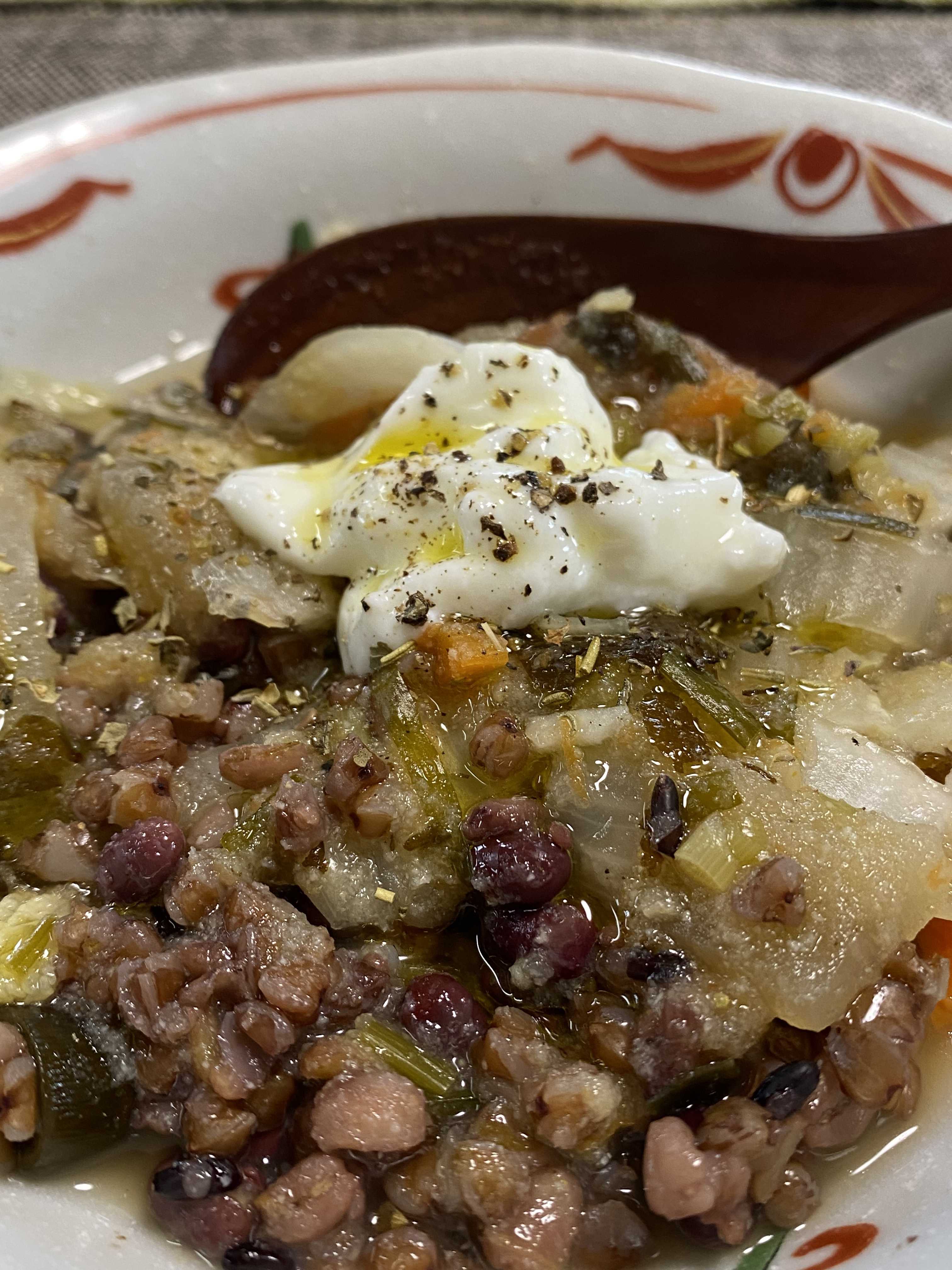 わたし的には今や定番となっているタイトルのコレですが、まるで普通ではないですよね、、、。マネする人もいない であろう特別な趣向💦今回の内容はほぼ、、読むはなし、ですw蕎麦の実は、ニホンジンにとっては意外なことに、、じつは乳製品との相性が良い、オリーブオイルの香りとも合います。それは蕎麦粉で焼くクレープ「フランス・ブルターニュ地方の家庭料理・ガレット」に出逢ってから少しずつ体験したこと、それに、、その後、ロシア圏でカーシャと呼ばれる蕎麦の実の蕎麦粥これの食べ方を知って参考にしています。🔸カーシャは:ロシア語、ウクライナ語で「お粥」を意味する言葉。 そばのほかにイネ科の雑穀や豆類などを水、ブイヨン、牛乳で柔らかく煮た東欧の代表的な家庭料理 つまり、十六穀とか小豆を足すのもありですね。蕎麦というのは世界中多くの国々で食べられていますが、麺つゆで食べているのは日本人だけです。もうひとつ意外だったのは蕎麦の世界一の生産輸出消費国はロシア。そもそも私にとって日本蕎麦は---そのほのかな香りが好きなので、どちらかというと黒っぽく香りあるお蕎麦が好みなだけで更科の繊細さを語るセンスや、噛みごたえだの歯ざわり、喉ごし、というセンスもありません。蕎麦ってさぁ、麺つゆを吟味してるのか?蕎麦を味わっているのか?んーーー、わかんないところあるよね。という人もいますw💦蕎麦粉を練って伸ばして麺として食べるために切ることを「そば切り」といいます。歴史としてはそれほど古くはないようで、蕎麦切り発祥の地といわれるところは信州と甲州にあります。十割とか二八とか、世の中で美味いとされる蕎麦粉の混合比も色々で、その蕎麦の香りとして韃靼と呼ばれる品種はまた別種の強い香りが特徴だとして、蕎麦茶には香りの強い韃靼蕎麦茶のウケが良かったり、その韃靼蕎麦の原産地は大陸だったりそして、、お蕎麦のお店で出てくる蕎麦茶は中国産の韃靼そば茶だったり、、それから出てきた蕎麦の香りが韃靼そば茶のニオイに負ける💦そもそもが蕎麦の原産地は中国の雲南省からヒマラヤあたりにかけてだとか。国産蕎麦粉とか国産小麦粉だとか、これも色々こだわり方はあるとして。信州戸隠と聞いたらもちろん信州の蕎麦粉だろうとか、思うのは勝手ですけど信州で収穫した蕎麦だけで信州蕎麦が作られているの?だとすれば全然収穫は追いつかないらしい、、例えば世界的に有名な京都の宇治茶というのは、これもまた推して知るべし、とおの昔から宇治の生産量ではまるで足りませんから、、、産地偽装とはいいませんけど、県境を南東側にくだった、そう、三重県産のお茶が運ばれてきた、とか随分前からのお話だったりします。ずいぶんと脱線しました。。で、話戻して 蕎麦です。もちろんですが、C国から大量に入ってます。良い悪い、という話ではありません私は自分の判断であえて、ロシア圏のものを選んでいます。リトアニア、ポーランド、ロシア産です 基本的にローストしたもの、日本にはないですね。訊くところによれば、ロシア圏は農薬の使用が少ない、、らしい。←信じたいです。乾燥というよりは焙煎をしたもの。中深煎り?普通に茹でても硬いので私は通常、圧力鍋を使っています。アチラでは普通の鍋で15分とか、硬さはお好みでパラパラしたピラフのようでも、もっと水を足してお粥のように煮込むのもあり。今日も試してみましたが、8分加圧だとまだ少し硬くて食べにくいので今度は10分加圧にしてみます。さて、蕎麦の実と十六穀に小豆合わせ炊き です。今日はこれにも昆布が入っていますお昼に食べたものです。ヨーグルトにEXVオリーブオイル、そして胡椒とプロヴァンスハーブがかかっています。これを美味しいと評価する人が私以外にいらっしゃるかどうかは、、→知らん!w自分で作って自分で満足してる、、まさしく理想的じゃないか!昨夜の残りもの「豚スネ肉のチミチュリグルト漬け野菜煮込み、おからと炊いたん」混ぜながら食べました、昆布いっぱい、ニンニク生姜に味醂醤油味。もうまったく、どこの国の料理か?なんてまるでお構いなしですまだしばらく、私の主食はこれが続きそうです。やってみました!という酔狂な方がいらしたら、ぜひご感想をお聞かせくださいw💕