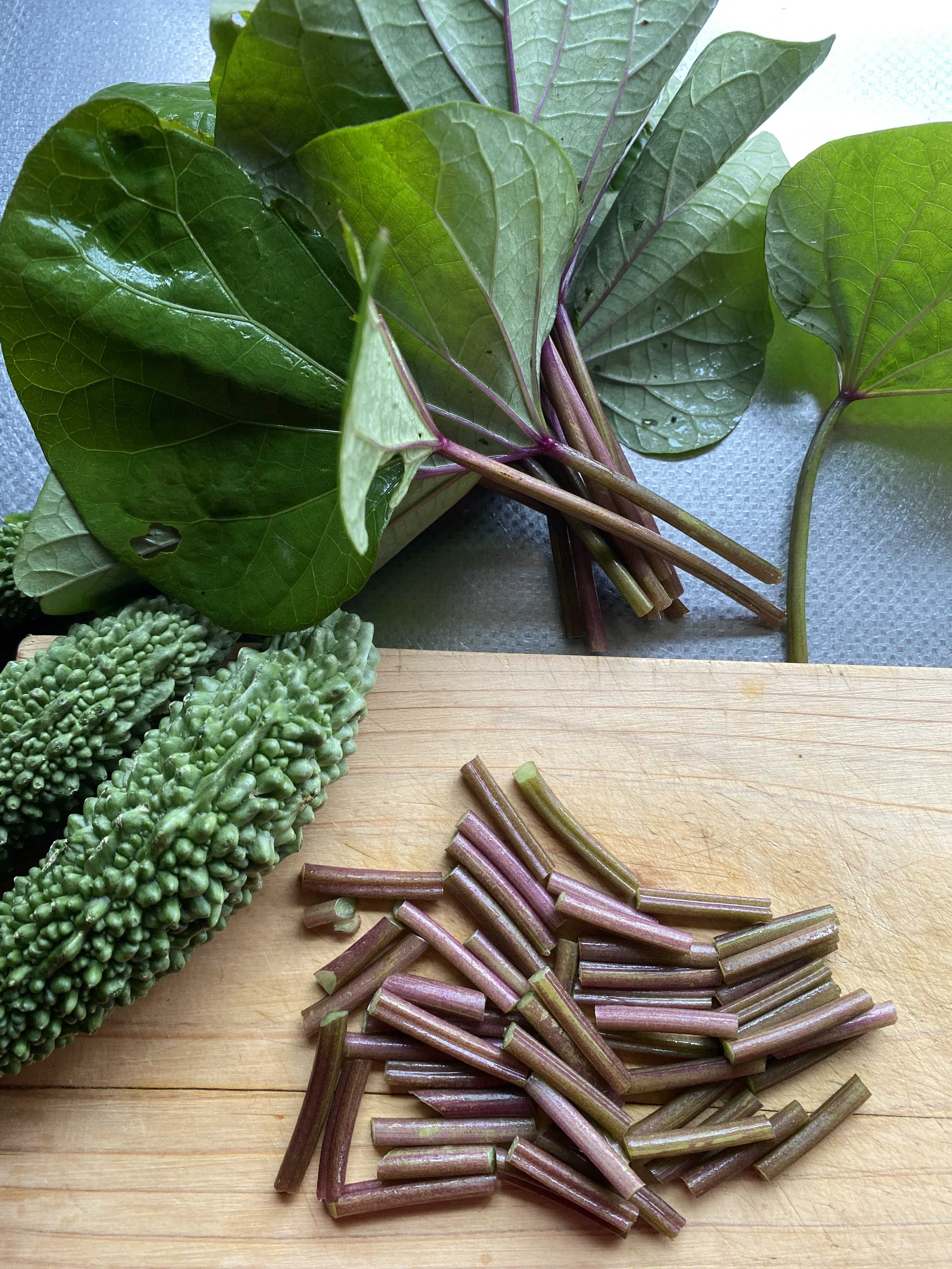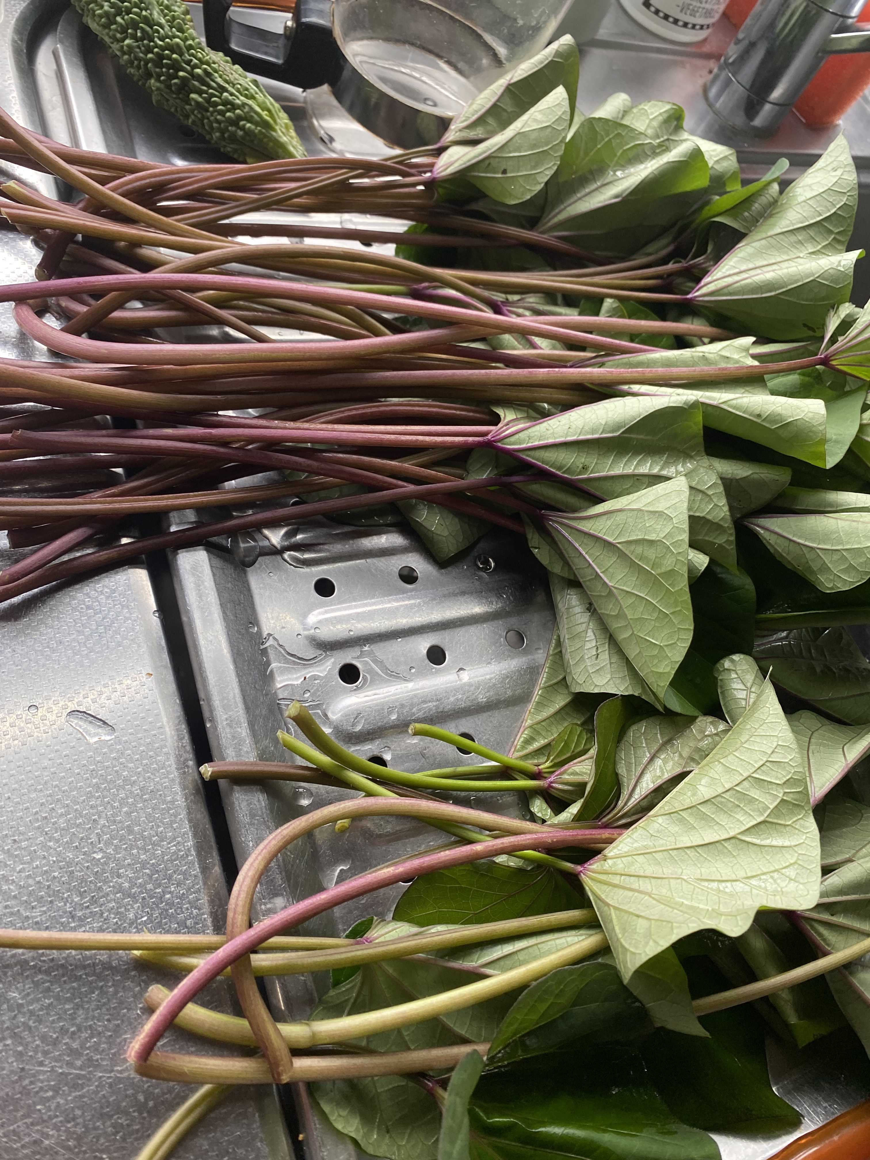 地産地消のコーナーで「サツマイモのツル食べられます」というのを何年か前に初めて知りました。ツルは越冬させれば翌年春の苗になる、というのもその後に知りました。これは菜園ネタなんですけども、その蔓も筋引きをして美味しく食べられるそうです。ところで、今回はそのツルではなくてツルから出ている茎と葉っぱの話です。芋の蔓を選定する感じでカットしてきてツル部分に生えている先端部分とツルから出ている茎と葉をカットして洗いますツルは茎がなくなってツルだけです、これは後日また筋引きをして使ってみますが爪先が真っ黒になりますよ!、ご助言をいただいているのでこれは桶に水を張った中でやってみようかな、、。このまんま、埋めれば苗🌱です。今、このまま土に埋めても冬になって凍死しちゃいます💦越冬法を考えないといけません、、です。で、今回はその葉っぱと茎の料理と食べてみた感想を記しておこうと思います。私としては今回、はじめてサツマイモを栽培してみてわんさか茂っている芋ツルと葉っぱは取らずに放置した方が大きい芋になるかな?という助平な根性があって、ここまでまったく放置で伸び放題でした。菜園をやっているお友達が、芋の葉っぱ美味しいですよ、というので葉っぱも食べられるんですか!これがまだ先週のお話でした。で、その後、散髪みたいにカットしてきては試しています、まだ2回目の散髪ですw炒める、煮る、湯がく、ん?漬物もありかもしれない、、とか、未確認ですが面白そうです。ただ、空芯菜と同様にヒルガオ科でカットすると切り口には早々に木工ボンドみたいな白い樹液が出てきます。空芯菜の場合、夏の時季に白っぽいシャツなんかにこの樹液が付着してしまうと茶色く汚れて、さらにこげ茶色になって、洗っても黒っぽい汚れが何をしても落ちない感じです。サツマイモの木工ボンドはどうかな??さて、今日の料理に3品目、サツマイモ茎葉を使ったのでざっくりとご紹介を。ひとつめお昼ご飯どき、ちょっと寒かったので温かいお蕎麦にしました。味噌仕立てです、栃木風なのかな?少しHOTを狙ってカシミールの唐辛子粉を少々。カシミールは激辛ではないです、いいあんばい。キョーレツなヤツもありますが最近の私にはムリ。そっちはもっぱら娘婿殿に小分けしてプレゼント用になってますwふたつめ焦がしキャベツとサツマイモ茎葉の無塩炒め、黒胡椒だけ。そういえばギョニソ入ってますから、ここに少し塩味はありますね。みっつめ鶏モモは糀で下処理をしたもの、ここもキャベツとサツマイモの茎葉。混合削り節であっさり炒め煮。で、思ったんですが、🔸茎はアレに似てるなと、、あれ、、→わらび。蕨。🔸葉っぱは煮る、湯がくと、小松菜っぽいですが 少し粘りがあるので、やっぱり ツルムラサキが一番似てるかな?ともあれ、サツマイモの茎葉もツルも育てていないと食べられる機会は少ないだろうと思います。雨の多いこの秋、みなさんはいかがお過ごしでしょうか?天高くないのでホニャララ肥えずに済んでいる今日この頃です。明日はまた、豚こまダンゴを使わないといけません、ココナツパウダーまぶし炒めにしたいです💕