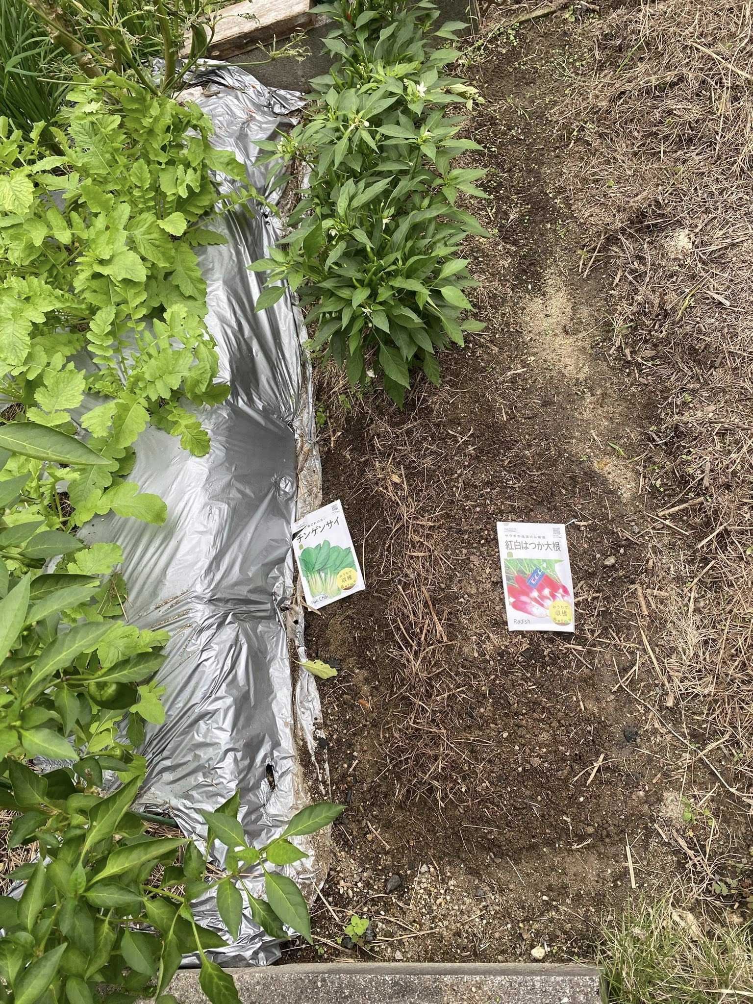 ここは自分用の栽培メモです。令和7年2025/10月21日火曜日昨日から11/6まで秋の土用。今日10/21はいきなりの間日というので、種まきとちょい草刈りしました草刈りはマキタ電動トリマーで、芝エリアに作った菌ちゃん畝3列の南側、猛烈な勢いのチガヤを根元でカットしました、ようやく。植えたのはこれ、ナフコの「おうちで収穫」ってシリーズ、アタリヤ。すでに前回蒔いた大根が大きくなってきましたが、防虫ネットならぬ寒冷紗を被せていたので、やや日照不足で葉色がうすいです。右は東京の在来種「内藤唐辛子」ここから急激に気温が下がってくると結実成長までに寒さに耐えられなくなるかも。左の奥(南側)オクラが見えていますが、この子はこのあとで根元でカットして終了しました、ありがとう!根っこを抜いてみましたが、幸いにもセンチュウ被害はナサゲでした。ここにはチンゲン菜と紅白はつか大根、南北に一筋ずつ。どちらもイタリアの種。こちらはその西側の畝、ここも同じ時に大根の種をおろしています。こっちの方が青々してる。ニンジンを一緒に蒔きましたが、その後例の大雨(9/16頃)があって人参種は流れてしまった、、。で、右側へ流れついて少し生えてますが畝ハズレなので下に伸びることはできないだろうなぁ。その後、畝の両肩に南北に2本筋で人参を蒔きました、これはようやく少し発芽してきました。ミディ、ってのを空いている7-8か所に。これはCNもの。手前に左右方向(東西)に一列、春菊が発芽してきました。銀マルチの空いている穴にも2-3か所にも、紅白はつか大根レイズドベッドの南の畝で、これの北側のはしっこ、ピーマン3本の南側。これはホーリーバジルのKAPOORこぼれ種が勝手に落ちて育つとこんなに元気に繁殖です。菌ちゃん畝の畔にも1-2本生えてきましたが、これの葉っぱは地生えよりも大きくて2倍くらいの大きさがあります、やっぱり環境がダイジなんだね。。。置いてある薪が風通し悪いのでこのKAPOORにはもう終わってもらいます😢薪割りをしないと!!