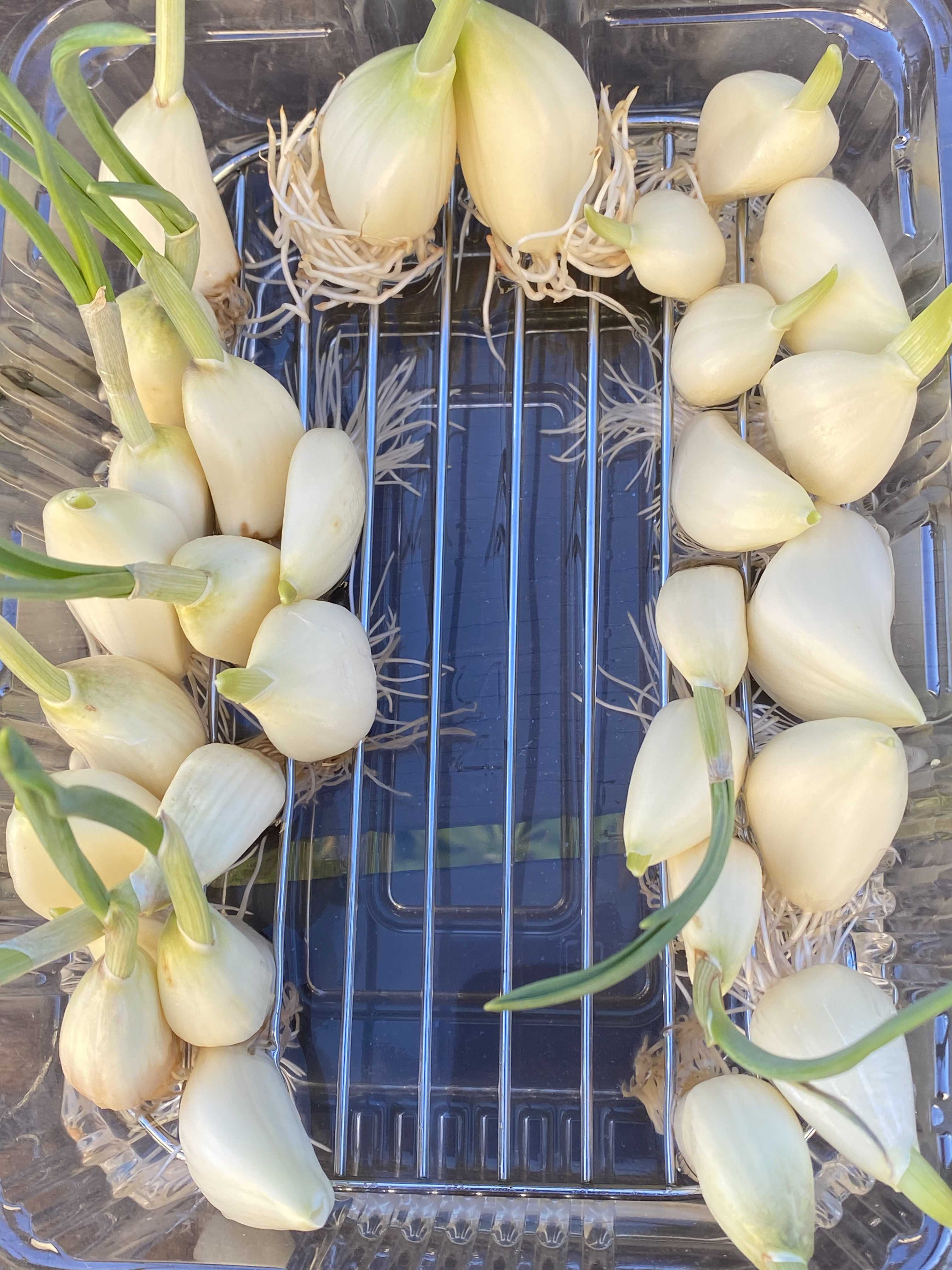 ニンニク、3-4daysも浸せば発根するのね。長い芽のものは、🌱スプラウトとして売られていた水耕もの、本来はそのまま食べるやつ。といっても、他のも普通にタチヤで買った青森の食用、ホワイト六片のはず。一番上の根っこもじゃもじゃの2つは2週間ほど水刺ししていたもの、あとは四日間このトレーで浸水。「きららの里」玉子自販機で出てくる卵のトレー、これがちょうどいい事に気づいたのが4日前だった、という。30個です、目分量で植え始めたら、最初の一列が9になってしまい、焦ったwけど、残りの二列で帳尻合わせ、成功。深さは10cmくらい。🔸真ん中の畝、北側からダメ元で大根ほかの種まき木枯らし??風がすごくて種子の袋も道具も飛ばされる、難儀やね。。11/05追加で、夕方になって同じ畝にあと少し、4穴だけ、、やり始めたらすぐに雨が降ってきた😢続きは明日かな?今日は水曜、しかしまぁ、ほんとに雨が多い秋だなぁ、月曜11/03は初木枯らしで寒かった、11/04の朝は5℃、寒。。夕方は焚火をしましたな。今朝は冷え込みなかったけど、日中も日差しがなくて気温上がらず最高15℃晴れないと気が重いなぁ、、なんて贅沢かな。行楽シーズンっていうこの時季、従来はもう少し天気が安定してますけど暑いと思っていたら急に木枯らし、、まぁ夏が妙に長くてそんなこと予想はしてたけど。。週末はまた雨だってさ。トホホ、、【追記】11/06 真ん中畝の北から5列目に、新しく穴をあけて 春菊、のらぼう、小松菜を植えたはず。