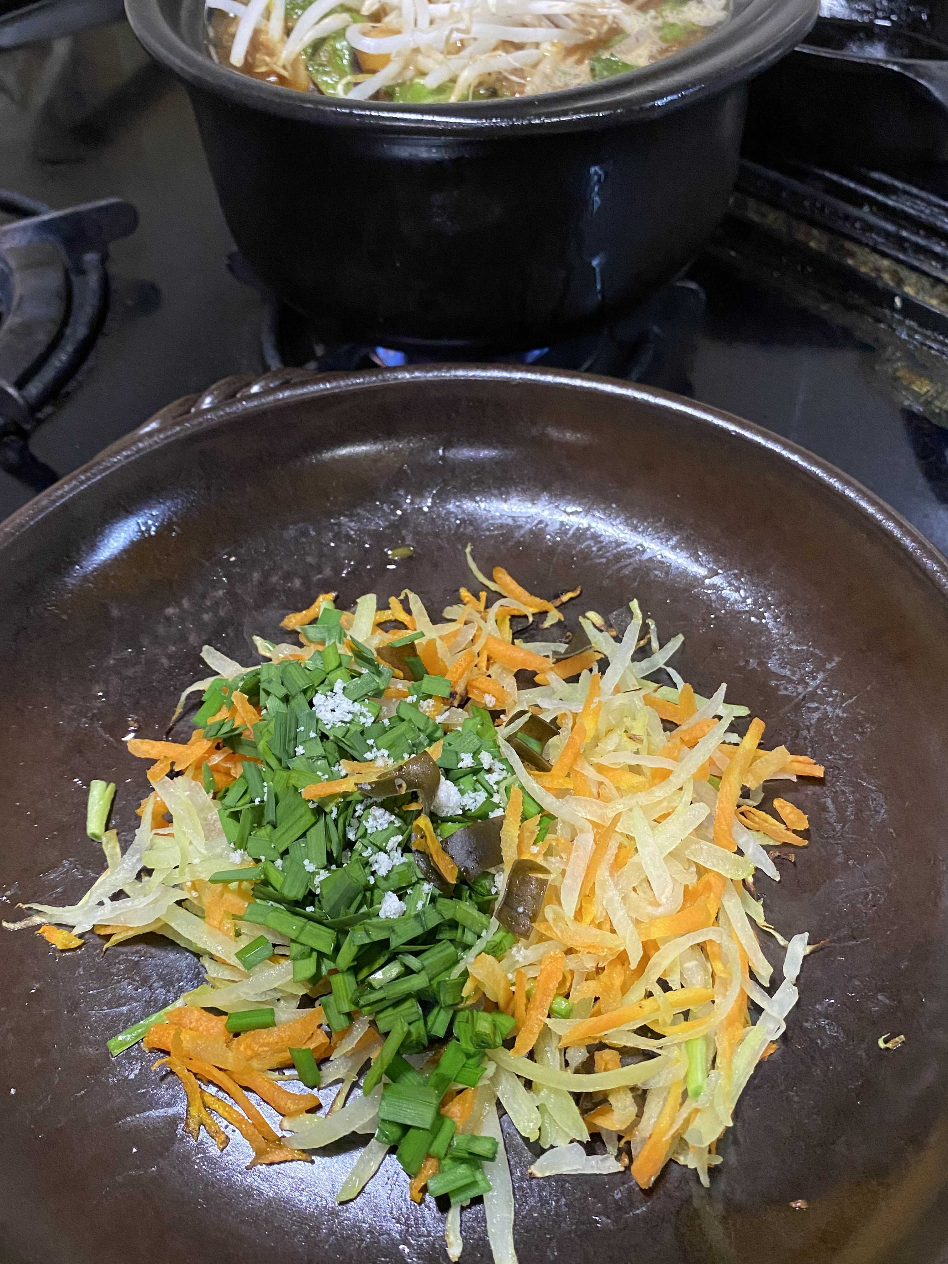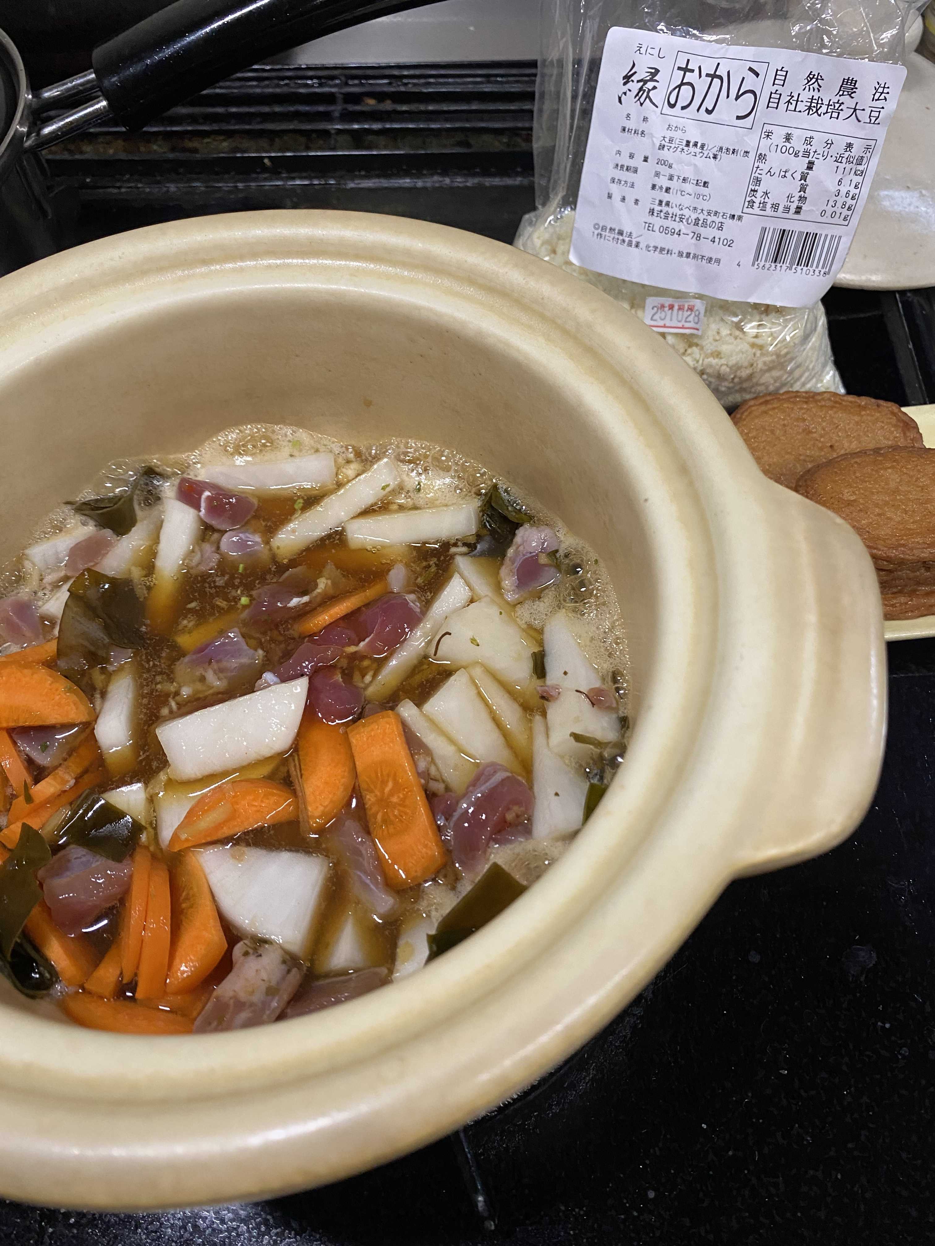 日曜日のお昼に食べたものの、繰り返しですが夕食用は圧力鍋でなく土鍋を使いました。土鍋の煮込みはトロ火で蓋をして25分、というのが基本的な自分ルールです♪鶏の手羽元など、ちょうど軟骨までやわらかくなります💛ニンニク生姜と昆布を刻んで、鍋に水を入れ、火をつけたら、まずみりん。大根と人参を投入して、醤油を少し。 さらに豚スネ肉のチミチュリグルト漬けを小さめに切って投入。おからとさつま揚げも入れたいぞ、と忘れないように準備。沸いてきましたね♪庭のニラが採ってあったので、多めに、8mmアバウト刻み適当、地上部の白いところもすべて。よぉーし、最後にオカラとさつま揚げもいれます。入れたら蓋をしてここから25分トロ火で完成です。トロ火で煮込む、、、遠赤外線でスネ肉の旨みがじわじわ出てきます、出来上がりのスネ肉はトロトロ、ニクの存在感はあんまりないですw柚子の皮を刻んでいい風味💕、、↓切れてないなww最近の私的な捉え方ですが、肉片はホントにダシねたと考えるようになっていて、固形物の「にくにくしい」ものをあんまり摂らない工夫でもあります、健康的?💦バラとかロースよりもスネはダシ要素が多いですね🧡脂の除去は多少ルーズにしていますが、塊の脂分はざっくり削ぎます。沢山削いだときは、別の炒めものの炒め脂に使ったりもしますが、鶏皮も鶏脂も最近は基本的に遠ざけるようになってきました、、年齢なりに?。。。はぃこちら!フエフキダイのムニエル@陶板 ←写真撮るのを忘れて、、調理を終えて皿にあったものをもう一度陶板に載せて写真を撮ったのでちょっとわざとらしい感ありますけど、べつにウソではないですw皮目が綺麗な色ですね、あんまりお目にかかれないオサカナです。いつもの「ぼうずコンニャク」→ フエフキダイ身をほぐしてみると、、身ばなれよく、味もいいです、ウワサ通りです。改めて、全員集合写真w右上は、あれこれオカラと炊いたん♪ご馳走様でした!