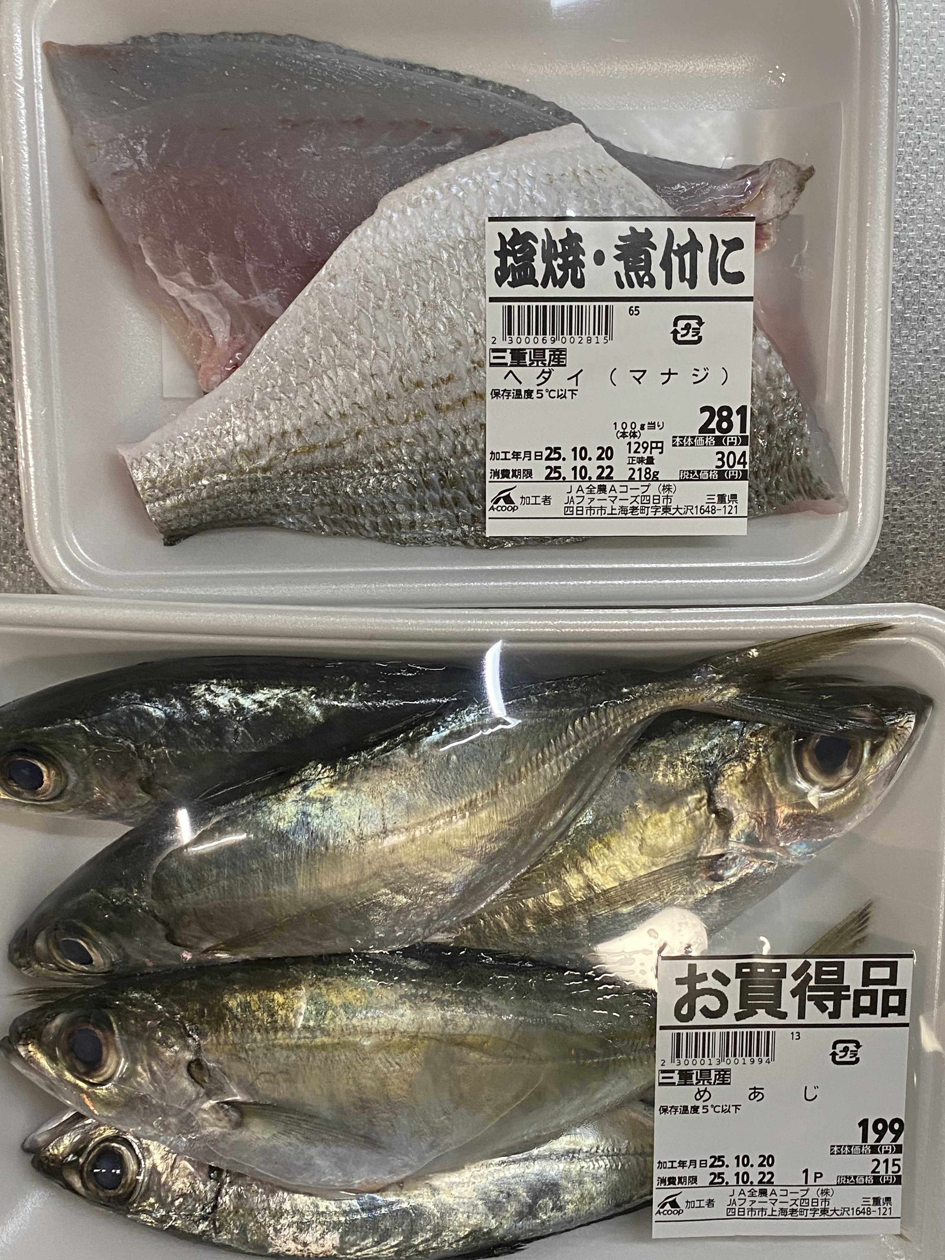 本日の水揚げ♪ヘダイも写っていますが、今日のお料理はメアジです。メアジ、、、びっくリーズナブル!!20cmサイズが5尾ですw しかしこのヘダイもお安いですね、どちらも美味しいオサカナです。詳しい人じゃないと名前を知らない、知らないお魚はみんな買わない。 先日のバショウカジキもそうです、マカジキはよく聞くけど、、な。 興味がないってもったいないですね、、知らない魚を食べてみる、その場で検索👀 美味しくても知名度が低いと売れないのでお安い。 こういう循環です、悲しいような嬉しいようなお話です。わたし的にいえば、マアジでなくてメアジでもおいしい。ムロアジもいいし。「ぼうずコンニャクの市場魚介類図鑑」によると・・・メアジ こちらの記事・青魚特有の風味があるものの、クセや臭いはまったくない。熱を通すとしまり、いいだしが出るので汁ものなどにも向く。じわじわ増えてきているメアジ もう一つの記事・冒頭にある「隣の珍魚」というくだりが面白いです。マアジの隣に置かれても見向きもされないという趣旨内容ですが、 その実、案外なダークホースが多いいわゆる隣の珍魚って、、 そのまんま 私が鮮魚を見て回る時の狙いどころですw ぼうずコンニャクさん、黒鯛の記事も面白かったです沖縄ではガツンというらしいです、三重ではドンパク・フライにすると、マアジのアジフライに負けぬ味なのだ。干ものにしてもいい。意外に汁がうまい。汁ものなどにも向く。意外に汁がうまい。というわけで、ガラ出汁をとって作る+ひと手間の「鯵めし」に決定しました💕題して「+ひと手間の鯵めし」🔸早速食べた感想を先に: うまいっ!鯛めしよりも旨みが濃厚で間違いなく美味しいです。 ひょっとすると鯛よりもはるかに?くらいしっかりした旨みです。 いや、鯛めしの場合も兜割りをしてガラ出汁をとって作っていますから多分ホントですよ^^;いや、アジって、ホントに美味しいオサカナだと思います。🔶先ずは頭を取りますが、小鯵豆鯵で最近覚えた技を初めてこのサイズでやってみました。 頭と胸鰭をもぎ取って、ワタごと引き抜くという豪快でサクッと気持ちいいの手法です。道具は何も使いません、少し大きさの点で少し間取りましたが、頭とワタが取れたらすぐに洗い流すのでカンタン、汚れない、散らからない。三拍子揃ってます😘腹の中、内側の血合部分は爪を立てて削りながら洗い流します。すぐ終わりました😚これに似た解説ページを見つけましたやまでらくみこのレシピ ←私もまたゆっくり他の記事も拝見しようと思います干物用みたいに開きました、軽く塩をして10分ほどで出てきた水分をペーパーで吸い取ったらグリルで焼きです。頭と胸鰭は兜割りしてこちらも同じようにグリル焼きです。天気が良ければ、このまんま干物にしたいところです。今度、ムロアジがあったら干物にしたいなーー!!!しかし今年の秋はホントに雨が多いですね。兜割りをしたガラ焼き。あっ、グリルの焼き網を洗い忘れていることに今気づいた💦こんがりと、メイラード効果を狙ってます💕こちらも、、ホントはもう少しだけ焦がしたいところ、、、っま、、焼けました。兜の焼きに焦げありますからまぁいいですw次はガラで出汁を取ります。塩焼きの2匹分、骨と背ビレ部分やしっぽも兜焼きガラと一緒に土鍋で出汁をとります。今回5匹ありますが、塩焼き済み3匹はラップして保存。しょーがないです5尾入りパックww兜と胸、塩焼きの骨身ガラ、尻尾。酒と味醂にぬちまーす、羅臼昆布に生姜、水を入れてから火にかけて出汁を取ります。🔸出汁をざくっと濾し取って水を足してごはんを炊きます。昆布はだし汁から取って切って散らして、お米の上に塩焼きの身を乗せて中強火で炊きます。ごはん土鍋2合炊き、お米は2合で炊き込みですが入る具材は鯵の塩焼き身2匹分だけですから2合炊きの釜で大丈夫です。五目炊き込みのように具沢山だとワンサイズ大きい3合釜を使わないといけません。【土鍋で炊飯のやり方】:お米は30分浸水してから1合に対して200mlのお水。中火で火にかけて5分。沸いてきました、蓋をして沸騰の蒸気が上がるのを確認したら弱火に、、あと5分弱火で火を止めたら、そのまま15分蒸らせば完成です♪【土鍋で炊飯のやり方】:以上です、どぉ?かんたん?じやーーん!完成です。昆布いっぱい。私の場合ダシをとった昆布そのまま食べますwなにより先に、鯵めし食べてみた、うーーまっ!!やっぱり山椒ほしくなりますwママ👩ちゃんは鶏モモのソテーと付け合わせの炒めものを作ってくれました。炒め物はサツマイモ🍠の葉っぱ❣️・鯵めしは1品で完結しているので、ママちゃんのお料理はフランスパンふた切れに乗っけたりしました。ねちねちヨーグルトも塗ったし、、ごちそうすぎる。ここだけの見た目は今回案外シンプルで、さっぱりしてますねともあれ、「+ひと手間の鯵めし」、お試しを!