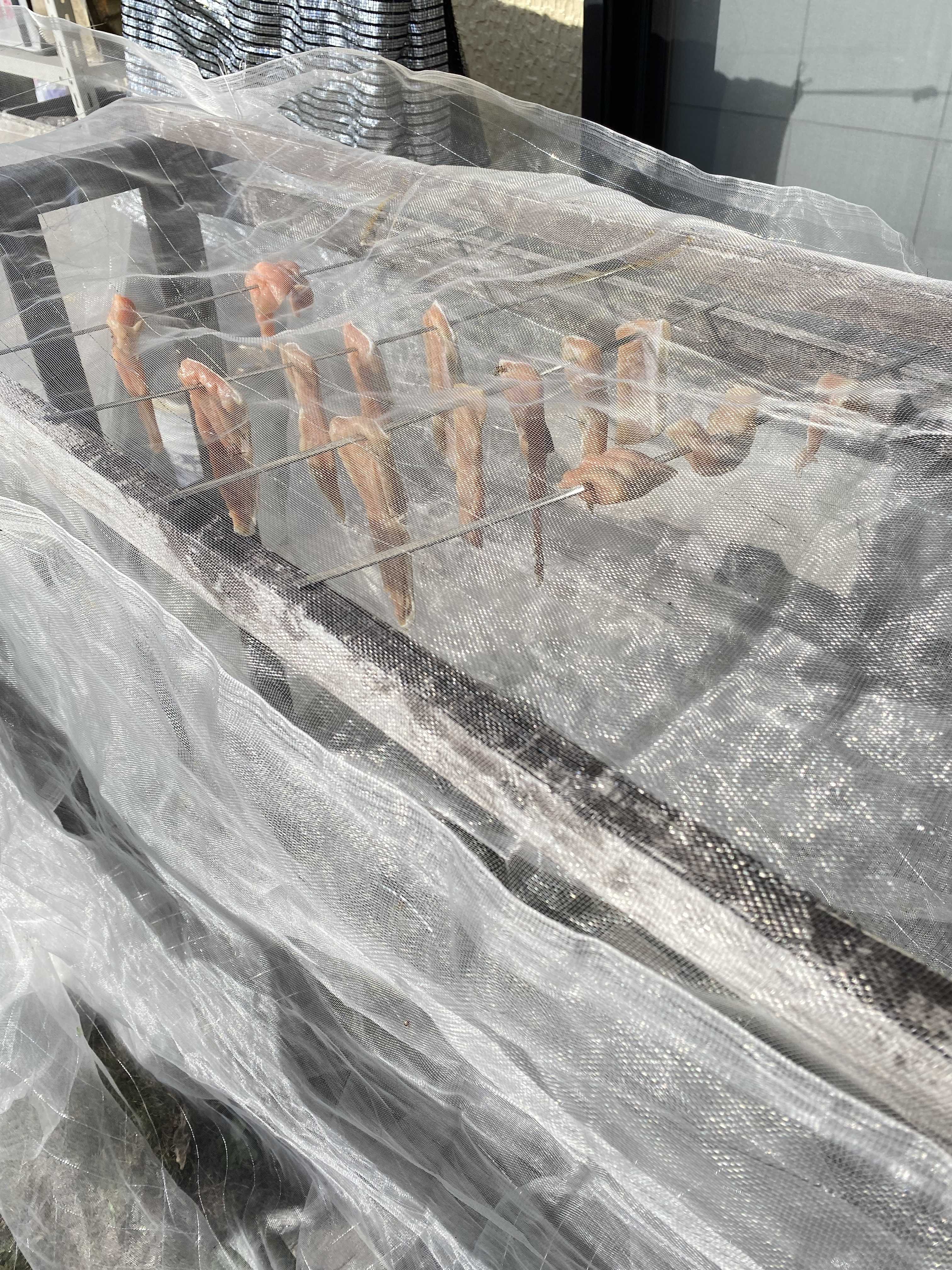 先週いつものAコープで、冷凍品だったんですが北海道産秋鮭のハラスを見つけて見逃さずに買ってきたわたしwもちろん、本当はナマが一番なんですがずーっとリサーチしていてようやく見つけたけど、、冷凍。まぁいいや!手軽にゆきます。ホエイとナムプラーを1:2くらいに混ぜてハラスの切り身に満遍なく馴染ませたら、バットの上でザル上げして、そのままラップして冷蔵。、してありました、丸3日くらい。←すっかり忘れてたw干します。空の薪棚の上に、串に刺したハラスをぶら下げて菜園用の大きな虫除けネット2枚使って 薪棚ごと❶被せる❷巻く上手く行きました、これでハエ除けは完璧👌え?よく見えないですねぇ、、それじゃあもう一枚やっぱり、わかりにくいw午後からの4時間ほどでまぁまぁ干せました、こんなもんでしよう。ちょっと色が白っぽくてダラシなく?なんか締まりが足りない感じです💦最初に塩振って水だしをしないと、ですね。元々、シャケの水抜きは下処理としても常識だったり、、、。冷凍品なので、余計に、、ですね。普通だと塩だけ振ってから冷凍なんでしょう。ともあれ、焼いてみればこんな感じで特に問題はないですね。食べてみたら、問題どころか美味しいと好評でした。塩して水抜きがしてあれば、さらにもっと美味しいはずです🤤で、残りもの。一切れずつ丁寧にラップしました💕迷わず冷凍しちゃいます。今季の北海道産にはもう巡り会えないでしょうね、、一度二度ハラスに出会えたらラッキー✌️いつものことです。お試しを。