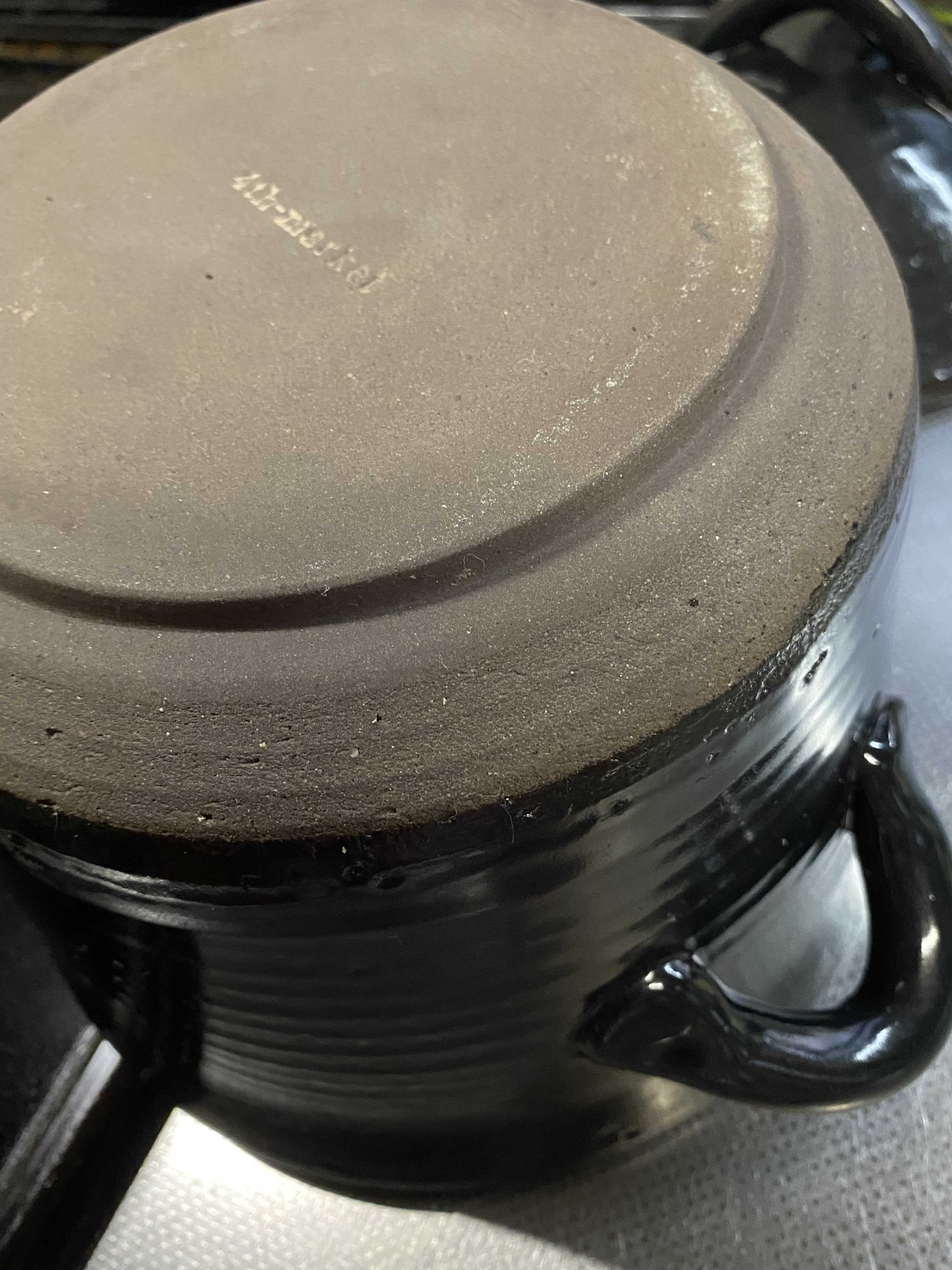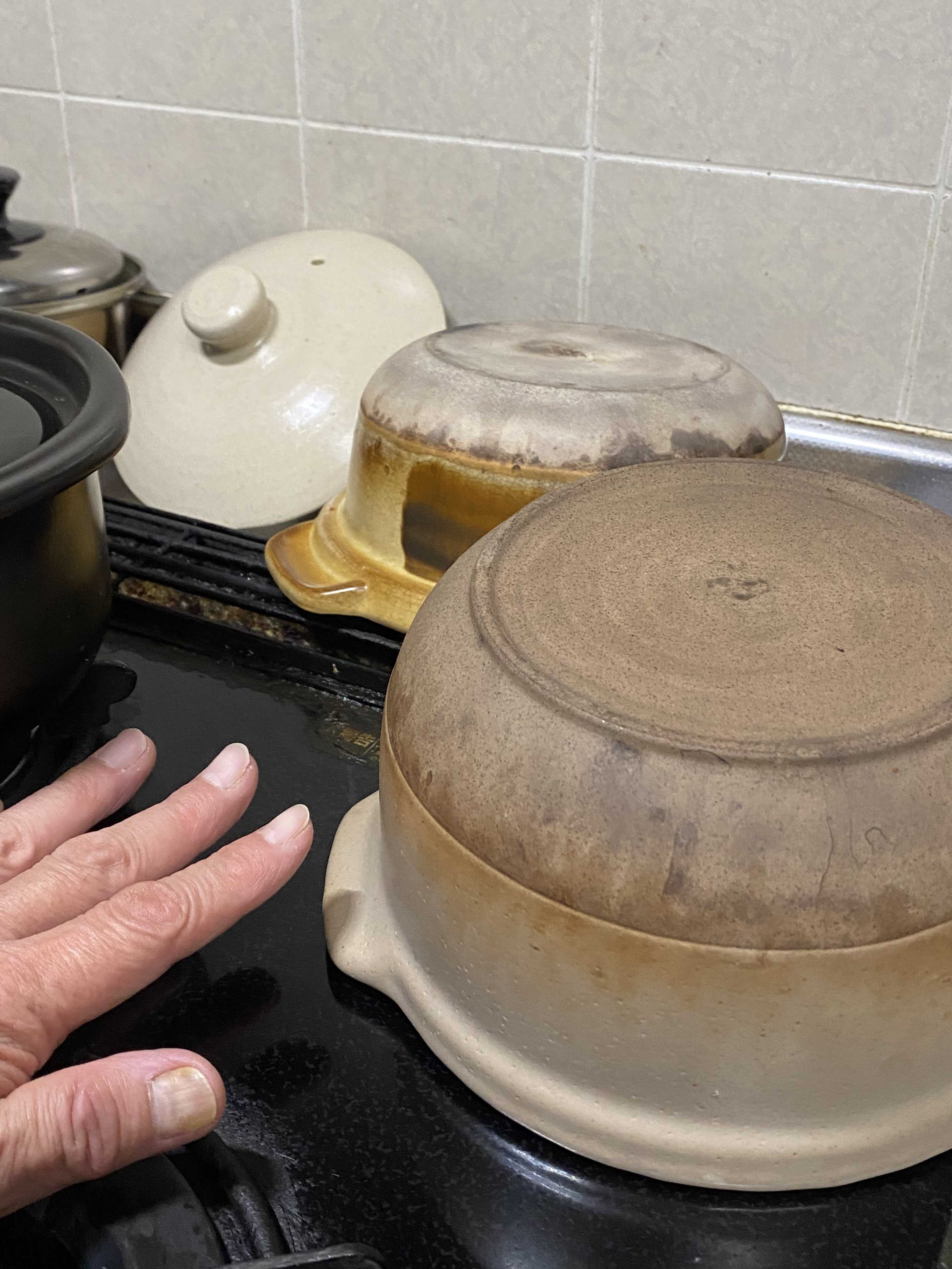 今回はお料理ではなくて、土鍋本体のうんちくw今回も「読む話」っぽいですwと、いうのは、、鍋料理でない土鍋の使い方というかなんでもかんでもほぼ土鍋で調理するようになったのもあって、お気に入りなのが---第1話・キャセロール型の土鍋?写真のこの形状の土鍋が気に入って常用していますけど、実はこの鍋肌が垂直のキャセロールタイプ?気に入っていて、その後もずっと探し続けていますけど、、これがなかなかないんですいや、、ネット上を探し回っても、ほぼ皆無😢C国製とか、たまに見つかりますけど💦これは2つともばんこ焼きの釜元さんと問屋さん小売店さんが多い四日市川原町のとある「問屋さんの蔵ざらえ」で購入したもの。どちらも大黒窯「華月」さん、おそらくは昭和の製品ではなにかと思います。現在の華月さんは6代目社長という、、可愛いらしい😍お嬢さんが↓↓頑張っていやっしゃるので陰ながら応援してます🔸「孤独のグルメ」の松重豊さんのyoutube動画【三重編】至高の土鍋誕生。松重豊、米を炊いて握ります。 2023/5この動画を見つけた時はちょっと嬉しくなっちゃった💛写真の土鍋、特に後ろのはこのお嬢さんがお生まれになる前、おそらくお父様のお若かった頃に製作されたものでしょう。これね。↓ホントにお気に入り、特に手前のもの。底面が白くないものが好き💕大きさわかるように、わたしの手🖐️w絵柄も飾り気もないですけども色合いと肌触り、お気に入りでマジ「土鍋愛」してます💕こちらは平成ものかな?イヤホントに色んな料理に使い倒しているので、これはガステーブルに乗ったままで一度も収納をしたことがないです2023年春に万古焼「土鍋陶板」に目覚めて以降、(そんなに長くない)ちょうどその頃そのタイミングでジンバブエ産のペタライト鉱山がC国に買収されてしまった事件のことを「ばんこの里会館」でいち早く聞きつけたこともあって、こりゃヤバぃ、今後新しい耐熱陶器の製造が危機的状況になりそうじゃない??窯元さんは新しいものを作れなくなっちゃわない??というわけで市内のあちこちで集めた土鍋陶板は40個以上💦そして色んな方法を試す実験と検証をやってきました。🔸遠赤加熱効果は、昭和時代の古いものであっても 釉薬の違いで沁みつきなどの差はあったとして、、食材の出来上がりは 基本的に、、違わないです。。 銀峯さんのBLISSIOはマジで無水調理が完璧なので、別格だとして、、。 基本的に土鍋というのは何にでも使えるので、土鍋を寒い時期の鍋料理にしか使わないのは もったいない! ここを声を大にして皆さんにお伝えしたいところです。このタイプの製造時期は、たぶん一瞬くらいだったのかな?と思えるほどにネット情報を漁ってもまるで類似したものは出て来ません💦私にとってはいわば「秘宝」というか、そのレベル。左手前に銀峯さんの黒い「ごはん土鍋菊花・2合」があります、これは似たようなキャセロール形状で大きさも似たような大きさなので、似たようなサイズの土鍋がいつも3つガス台の上にありますw一般的な土鍋の形状イメージはお椀型かな?と思います、銀峯さんの菊花と花三島は鍋肌が垂直な形状ですが、深さはないので容量を求めると大型になってしまいます。ごはん土鍋は火を止めて余熱調理がダイジなために胴が少し厚めで少し重い。我が家では「ごはん土鍋2合」はお味噌汁用になってますwコレはホントにいい鍋です、お味噌汁だけではもったいないけど、お味噌汁も、土鍋で出汁をとると、、美味しいです。おいしいはず。。ちょとデザインと釉薬の処理が違います、改めて高さを比べてみたら8cmと9cmとか、ほとんど違わないですが、右の方が少し胴が分厚いかな?この容量の違いって、意外に大きいです。鍋の口径は同じ、蓋は同じですから。どちらも同じで16cmくらい。いわゆる6号サイズのはず。第2話・土鍋を使ってナンボ。BLISSIOを使ったレシピ集 とても参考になります。高機密のトンデモほどに高品質な製品じゃなくても、どんな土鍋でも似たような事を真似してみると面白いです、、よっ!🔸鍋蓋の孔に枝を挿しこんで封じてやるとか、そんなこともします。茨城笠間のR工房 仲本律子さんのページでいただいたアイデアです♪陶芸家さんでお料理もされる、仲本さんの作品集はどれもステキです。ただ、ペタライトの入手難で耐熱陶器の製作を断念されてしまいました。こちらのレシピ集もとても参考になります:「土鍋料理・基礎編」「土鍋料理・応用編」Facebook「R工房・土鍋クラブ」鍋料理の恋しい季節になってきました。お鍋を出されましたら、、「鍋料理でない土鍋の使い方」あなたもぜひチャレンジしてみて下さい!🧡🔸この先は蛇足? というか逆にもっと重要な情報かもです::2023年4月、土鍋陶板のマイブームが始まって、5月のばんこ祭りの頃からドはまり全盛期に入りましたが、その当初は「これで全部」でした❶手前のごくごく普通の土鍋2つは、これがまた奇遇にも底面に