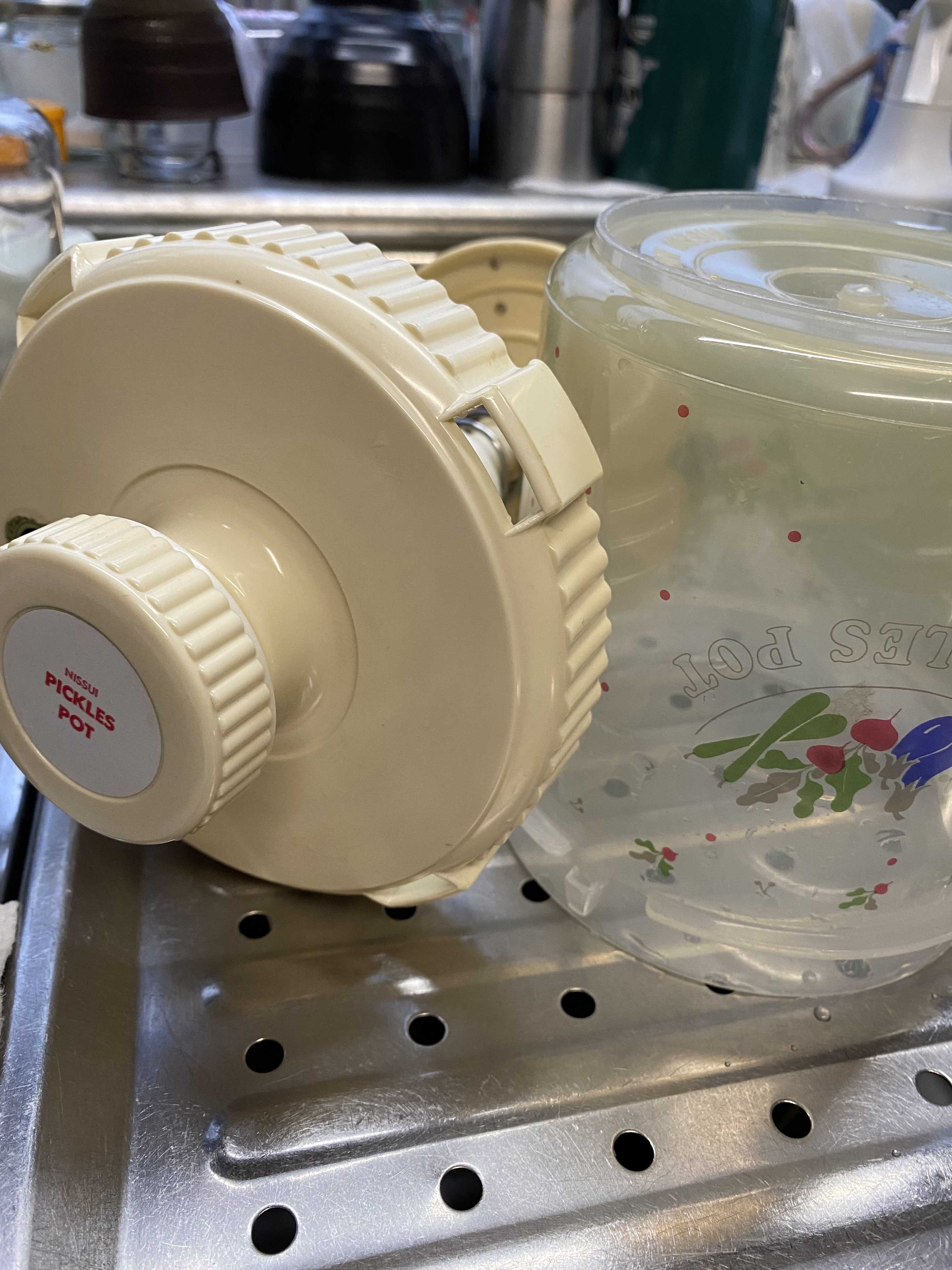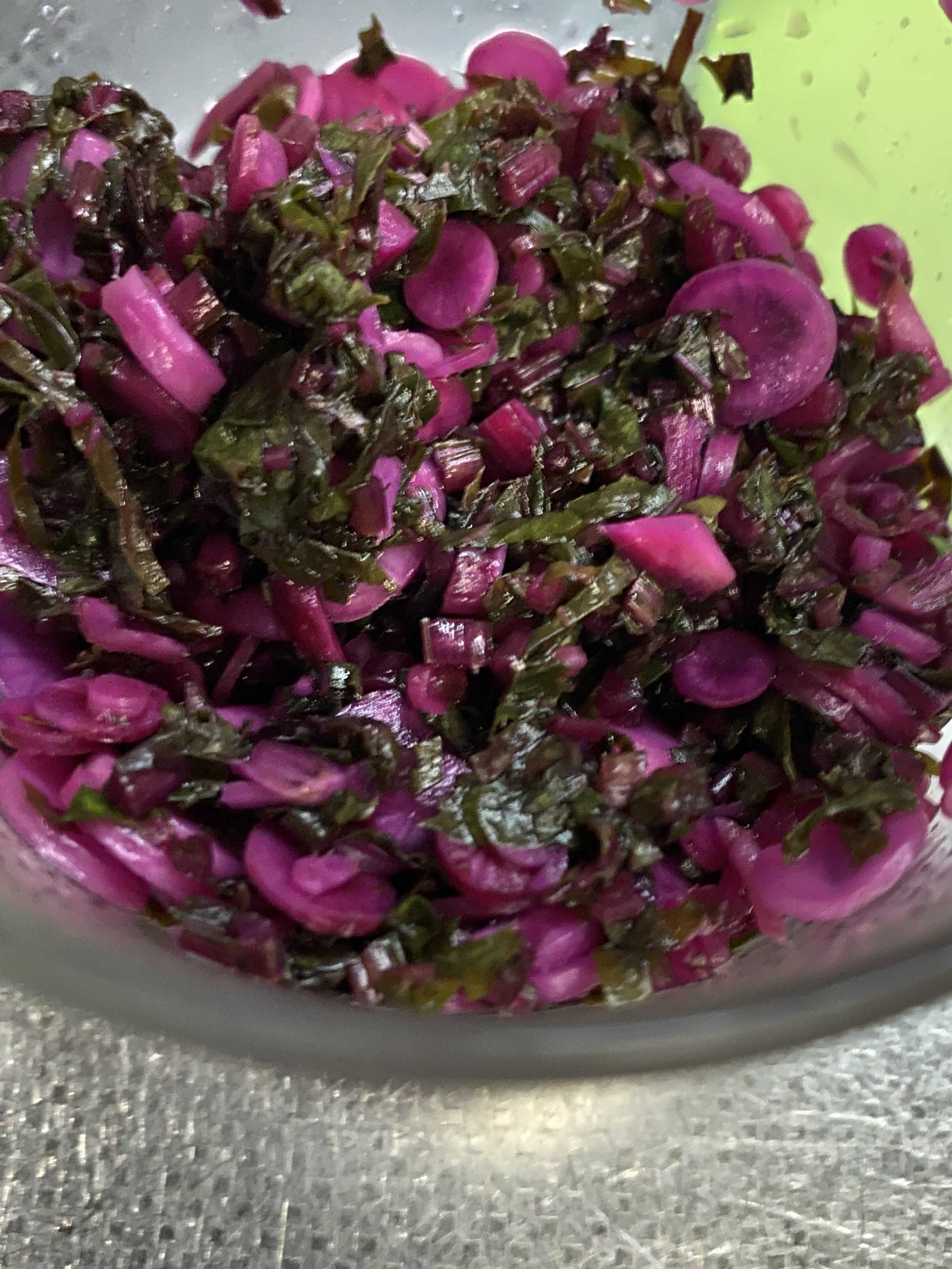 日野菜というと、まあお漬け物。美味しいです。昨年この時期に「日野菜漬け物以外」という検索をしてみた記憶ですが、やっぱりお漬け物かなぁw今季初の日野菜を見つけて買って来たら、いきなり雨模様が続いて3日ほど屋外に吊るしてありました。昨日、夕方に思い出して確認したら いい具合にくったりしていたので❶まず3mm幅に刻んで軽く塩して、袋に入れてもみもみ。❷茎葉は5mm幅に刻んで袋に足したら、また少し塩を足して全体を混ぜる感じにもみもみ。❸あとは漬物器の出番です、独身時代に買ったコレwいまだに現役、漬物器は昔からこれひとつしか持っていません。大活躍してる昭和の道具。❹12時間経過で混ぜてみました❺漬物器の底に搾り汁が少しあります、右の方に米酢を垂らしてその様子を観察すると、、ほーらねーー💑右側がピンク色に変色していますね💛❻もう一度、漬物器に全量を戻し入れて、米酢を適当に振りかけてよーく混ぜ合わせて漬け再開。❼あと6時間ほど経過したのがこれです、全体が 鮮やかなピンク色!できあがり♪おいしい~💛日野菜を見つけたらやってみてください、ごはんがススム系はアカンのですけどね💦 ごはんは控えめですが、、大好きです。お試しをっ。