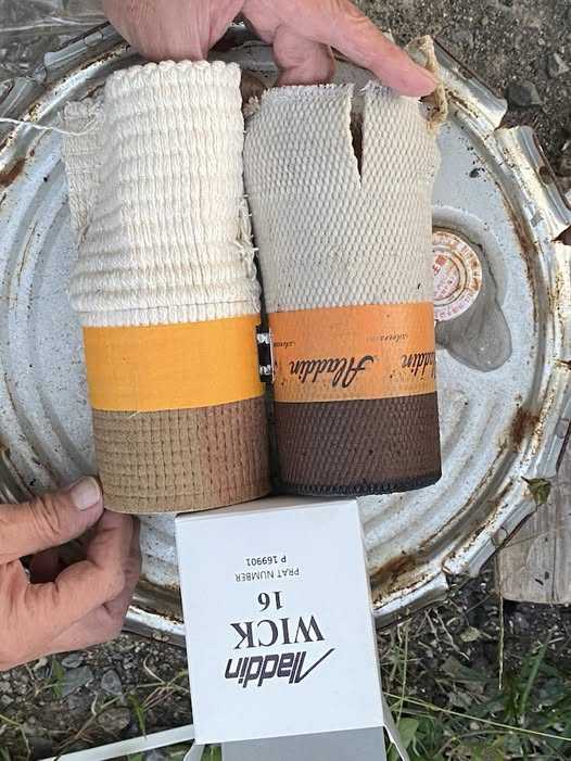 Aladdin39の16LP純正スペア芯の不良品感。あなたも感じていませんか?アラジン39モデル、といえばママちゃんの実家で使っていた古い古い一台をガレージから発掘してきて、---ちょっと苦労してオーバーホールして使ってみたところ---🔸灯油ストーブとしては異次元レベルで素晴らしい発明品だったことを知りました。点火消火時の灯油臭さがほとんどない(びっくり)昭和時代から延々とモデルチェンジもなく続投され、愛用され続けている事実。独特な意匠デザインも人気の理由と思いますが、なにしろ灯油臭さがない、というのは私として本当にありがたくてこれにはじまり、一時的に3台を所有していましたが5年ほど前に一番古いのを1台、知人にプレゼントして、その後も2台は現在稼働中です。ところで、今回はその「純正芯」の話です。これに不信感をお持ちでない方が多いのも私としては意外なんですが💦どこが?なになに?何の話?こちらの写真。純正16LPと社外の比較コットン芯部分はもちろんモノが違います、けどひと目でわかる、決定的な違いがあります。純正はミニ・スカート!そうです、コットン芯の下の白いスカートが明かに短いですよね?純正品と比較したのはコレです、輸入物の社外品🔸問題なのは【不良品感1】 ❶スカートが短いことによって、燃料の液面が低くなってくると ❷燃料が残っていても芯が灯油を吸い上げられなくなり ❸芯先の灯油が燃え切ると、燃料切れと同じように芯先自体が燃えてしまい ❹それによって芯先が消耗してしまいますこれは芯先に燃料切れが起こらないように注意をしていればよい、のですが【不良品感2】 ❶燃料残量「0」ラインであっても燃料からっぽではないです ❷シーズンラストに燃料を燃やし切ろうと思っても ❸スカートが短いことによって、燃料がかなり残っていても芯先がガス欠となり ❹それ以上は燃やせないですが、タンク内の灯油はかなり残っているということになります。長年使っていて、何かおかしいなー??と思っていたんですよね、シーズンのラストで燃料を燃やし切ったつもりでも、かなり灯油が残っている。。頻繁な芯先の燃料切れで芯の寿命が早まっていたのでしょうか?それもあるとして、例年、純正芯の寿命が春まで持たない、、とか。それはガス欠させることが多ければ、仕方がないといえばそれまでですけども。燃料があるのにガス欠になるというのは、構造的な欠陥部分といえないのか??です。で、あるときイギリス純正とか外国社外なんかを試そうと思ったんです。この写真はどこ製かよくわかりません、アマゾンで買いました。イギリス純正はさぞかし燃焼状態も最高かも!と期待しましたがなんか始終灯油臭くて嫌いでした。少なくとも、気になっていたスカートの長さは日本の純正品だけがダントツ短いんです。で、苦肉の策でこんなことをしてみたこともあります灯油ランタンの芯をスカートの裾に縫い付けて、しっぽを垂らす。浸透圧で引いてくれればよいだけですから、これでも良かったです。その後、ひところ、、国産ストーブ用のガラス芯を加工して3季ほど使用したこともありました。ガラス芯仕様にしていた古い古い39モデルをあまりに欲しがった人がいたのでもう、、プレゼントしちゃったという、、ね。その後は知りません、音信不通です、そんな人のはなし、やめましょうwwさて、その後、、今季もすでにストーブ稼働時期になりましたが現状で使用開始をしている2台の芯は、今季で3シーズン目です。例年、春まで持たせるために懸命な工夫をしていたとか今思えば、何だったんでしょうね、ほんとに。白い1台には上記の写真にある 輸入社外品AladdinWICK16私の事務室緑のもう1台には上記の写真で逆立ちしている白い箱「日本製16LP互換品」自宅リビング現状の私のおすすめ、お気に入りは後者です。私の印象では点火時消火時ともに純正16LPよりも匂いがない、かも。三信製織(株)毎年シーズンINNすると品切れになるようです。生産量が少ないみたい。↓↓純正芯をご使用の場合は、スカートのすそに灯油ランタン芯を縫い付けてしっぽ垂らす。。やってみて下さい。くれぐれも、火の用心🔥