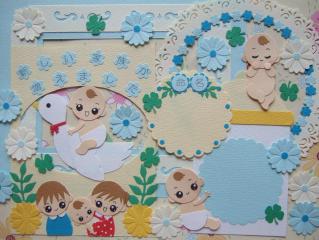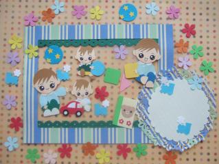 健診カード完成しました~男の子用と女の子用、5枚づつの縦9cm・横11cmになりますカードの文字は『○年○月○日・身長○cm・体重○g・頭囲○cm・胸囲○cm・memo』です。赤ちゃんの頭あたりに『○ヶ月健診』のカードを貼り付けてます。左側の赤ちゃんはお医者さんの真似しとりますくまさんに白衣を着せてみました私としてはナースくまの予定だったけど、男の看護師さんみたいですね気を取り直して、右側の赤ちゃんはカルテ抱きしめてます大事なのねな~んて思いながら作成してましたよく見ると周りの花の中の●が微妙に色違うの分かりますか男の子がクリーム色で女の子がピンクなんですよの左側の赤ちゃんはですね~。ひよこさんの重さを測ってます本当にこんなことはしないでね今度は真ん中の赤ちゃんの胸囲をひよこさんが測ってくれてるんですよお返しですなんて仲が良いのかしら右側の赤ちゃんは身長計からこっちを覘いてます「ママ~」ってしてるイメージのつもりですでですね、なんとなくさくらんぼ付けてみましたそうそう、分かりますか実は台紙に水玉のペーパー使ってるんですいろいろ貼り付けちゃったんで分かりにくくなっちゃいましたね台紙はこちらを使用してますお値段も安くてとっても可愛いんですよクリックすると、ピンクの台紙も一緒に表示されます。作成中に違うパターンの健診カードも思いついたので、後日作成したいと思いますいつになるやら…ちなみに只今動物園編作成中ですが、今回はキャラをぜ~んぶ着ぐるみBABYにしちゃいました後日アップしますね