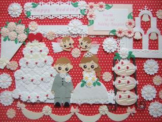 初めてウェディング編に挑戦してみました結構時間かかっちゃった今回は小物が多いですね結婚式の華やかさをだしたくって、お花メインですフレームは2重にレースをしてるんですよこれだけで雰囲気でますよね新郎・新婦と天使ちゃんが2人です天使ちゃんはお顔の大きさを小さくしてみました以前から小さいお顔に挑戦してみたくってやっと完成ですあっフレームはL版の写真がすっぽり収まる大きさにしてます写真はきらずにそのまま飾りたいですもんね小物は・・・ウェディングケーキタイトルカード・ボードリボン?大きな花束ショートケーキの台協会ですウェディングケーキの一番上にハートをつけてみましたケーキにもイチゴの変わりにハートにしたんです今回は時間もかかり、頑張りましたよ~~脳みそ絞って考えたけど、アイデアが浮かばず、いっぱいいっぱいですあぁ、みそが欲しい確か、ねぎは脳に良いんだよねたくさん食べたらアイデアもっと浮かぶようになるかなあばか食いしちゃおうかしら・・・今回たくさん使用したペーパーはこちらです スクラップブッキング クレタケ カラーペーパーMスノーホワイト・ナチュラル・桜をメインに使用してます