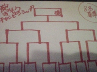 鏡開きは一般に11日で、正月行事の一つ。正月中に重々しく飾られていた鏡もちを割るということは、大正月の終わりと、その年の仕事始めを意味する。武士は、具足櫃(ひつ)開きをし、主家の鏡もちを君臣ともども分け合って主従固めをし、商家では、蔵開きをし、農村では田打ち正月をして、一年の出発とした。だそうです。ストリートアームしにタカノ橋商店街に行って土曜日にやるアーム新年会に使う物を探していたらレジの前にお餅があって、鏡開きなのを知った。本当なら正月前に買っておく物だけどせっかくなので、買ってアーム台に置いておく事にした。ついでに、一緒に置いてあった、おしるこ用のこしあんも買った(笑)センターに置いたら、この上に手を持ってきたら良いので餅レフリー活躍してくれました。今日の参加者は、僕とKAN君、ミヤゾーマさんアキラ&アキオ、Yさん。ミヤゾーマさんとアキラさんが握力鍛えるやつが欲しいらしい。僕もキャプテンズ・オブ・クラッシュグリッパー欲しい。買ったらやらせて下さいね。守りを親指を意識してやりました。もっと、親指を鍛えないといけない。エアロも足の親指を意識してやってるのですがアームもエアロも親指大事ですね。土曜日にあるアーム新年会は17人くらいの参加ですかね。強い外人さんが来たらいいんやけど。右は全員参加で左はやりたい人でトーナメントしよう。忘年会の時にカズさんに作ってもらったトーナメント毎回作って張り合わせてたら作業時間やカラーコピー代もバカに出来ないのでパウチフィルムでやってもらって、次回からも使えるようにしました。練習終わった後、お店にアーム台2台運び終えてジムにサウナ&お風呂入って帰りました。アーム新年会、今から楽しみです。