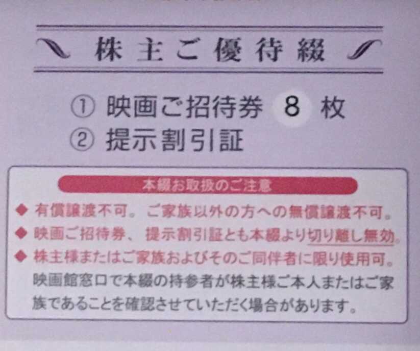 テアトル東京から映画鑑賞券8枚が到着しました。 テアトル東京は、一番最初に購入した株で思い入れがあります。 今思えば会社の知人にテアトル東京の株主優待券がいいとの話があって株券を購入したのが、きっかけで株主優待生活を始めました。 今では120銘柄を保有するまでになりました。 とはいうものの一度テアトル東京の株は、「この世界の片隅に」という映画が爆発的にヒットした時に株価も高騰して一度売却しました。 その後、株価が下落して再度購入し現在に至ります。 また鬼滅の刃みたいにヒット作品を生み出してもらえると嬉しいです。それまでは引き続きホールドしたいと思います。