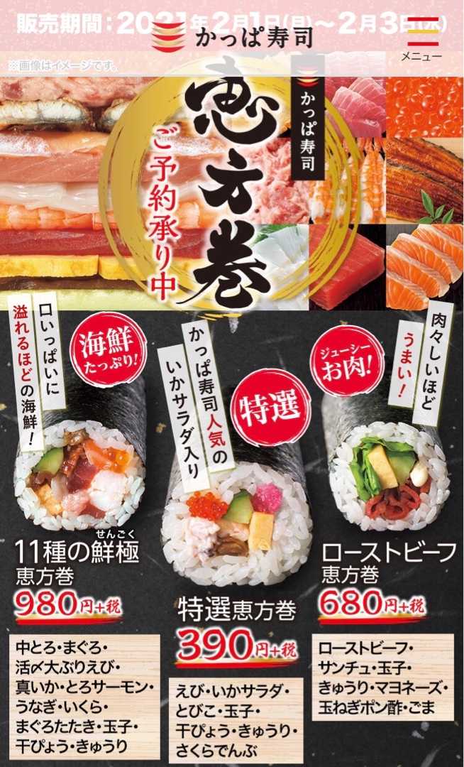 かっぱ寿司で2月2日に恵方巻きを予約しました。 11種の鮮極恵方巻と特選恵方巻の2種を予約しました。 かっぱ寿司の予約サイトで申し込んで、先日食べた寒ぶりが美味しかったので追加注文しました。 会社帰りにかっぱ寿司に寄って恵方巻を買って帰ります。 全て株主優待ポイントでの支払いを予定しています。 【上 太 巻き寿司】関西テレビで紹介されました。明石 米長流 定番商品明石巻き登場!上巻き寿司 1本節分・節分の日・恵方巻きに!鬼もぶっ飛ぶこの旨さ!価格:918円(税込、送料別) (2020/12/21時点)楽天で購入