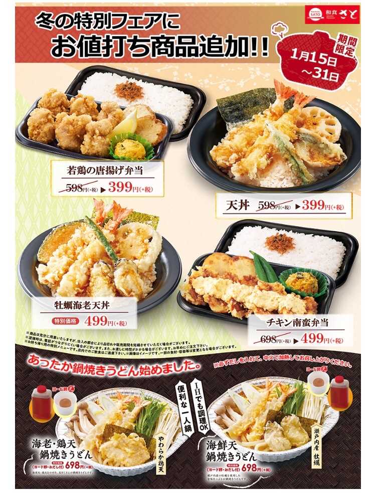 和食さとが1月31日までキャンペーンで唐揚げ弁当と天丼を200円引きの399円で提供するとのことです。他のメニューも200円引きとなりお得です。 以前住んでいたところの近くに和食さとのお店がありましたが、今住んでいるところの近くに和食さとがないので、私はこのキャンペーンの恩恵を受けられません。 お店が近くにあればSRSホールディングスの株主優待券を使って和食さとや他のグループ会社の店舗を楽しめるのですが・・ もっと店舗が増えると株券購入を検討したいと思います。