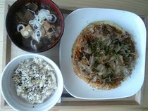 ひとりごはんでないと食べにくいこのメニューお好み焼き定食そばとイカ入りのキャペツたっぷりの広島風お好み焼きに発芽させた玄米と豚汁炭水化物と炭水化物って、邪道でしょとよく言われてた。ラーメンと炒飯、そばと丼は正道なんだろうか。。。