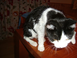 昨日、会社を早退してたぬたんを病院へ連れていった。診察の結果、歯槽膿漏だった。ちょっとひどくなっているらしい…。口の右上のあたりが左に比べて、腫れている。えっと、この写真だと左側のほほが腫れているんだけど、わかるかなぁ。。大きな穴があいてしまっているらしい。。。週2回、消毒と洗浄と薬を塗る治療で通院。家から片道1時間かかるから、だんなと交代で連れていかないと。。。気のせいか、病院から帰ってきたらちょっと元気になったみたい。。今まで痛かったんだよね…ごめんね、たぬたん。ネコさんもデンタルケアは大切だと今回つくづく感じました。。。反省。。。なんだか、最近のママは反省ばかりしてるね。。。ちなみにたぬたんの体重は2.8kgだった。軽いよぉ。。。今日は2つの動画をどうぞ!といっても、1つは別に動画でなくてもよかったんだけど。。えへへ。。むささびルーとじゃれるパセリをどうぞ!