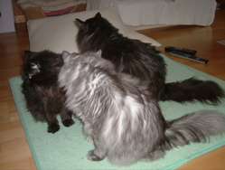 バジルはチンチラとヒマラヤンのハーフ。だから、おっとり性格なんだろうね。ルーにはちょっと困ったことがあるの。。。それはね……『ラフ』が長くて、いつも毛が口の中に入っちゃう。。。『ラフ』ってね、首や胸まわりの毛。 これは、生後3ヶ月ころの写真だけど、みてみて!ねっ?毛を食べているでしょ。。(^o^)どうしても口の中に入っちゃうらしくて最近ではくせ毛になっているの。。。ほらね、今日も毛を食べてる。。。バジル「ママぁ…あたしは好きで毛をくわえているわけじゃないもん!」「どうしても口の中に入っちゃうのよ。。でも邪魔じゃないもん!」『ラフ』…う~ん、ゴルフにもラフってあるよね。ちょっと長めの芝だけど…。ラフに打ち込んじゃうとなかなかボールをだせないんだよねぇ。。。ネコさんの胸まわりの毛の『ラフ』とゴルフの『ラフ』。。。なんとなくわかったような。。。バジルのラフ…ちょっと切ってあげようかなぁ。。。