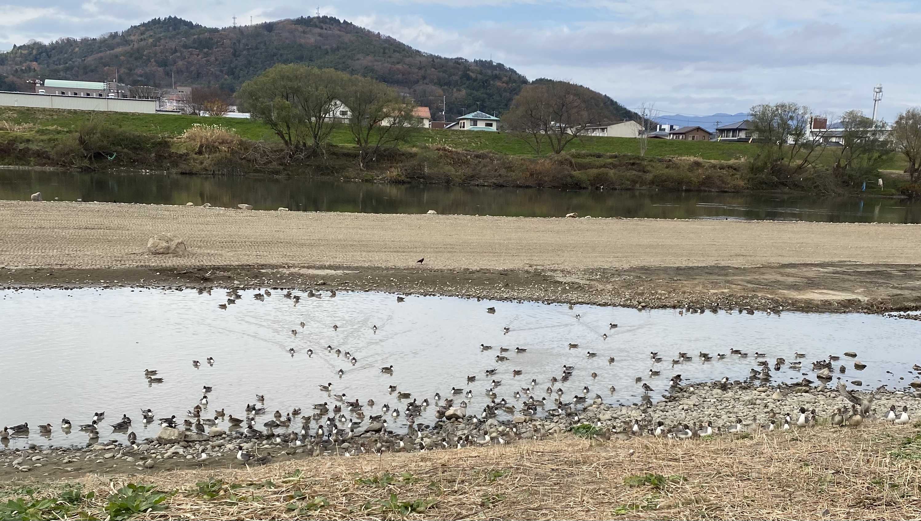 工事の水溜まり?魚がいそうにない水辺にカモがワンサカいる。