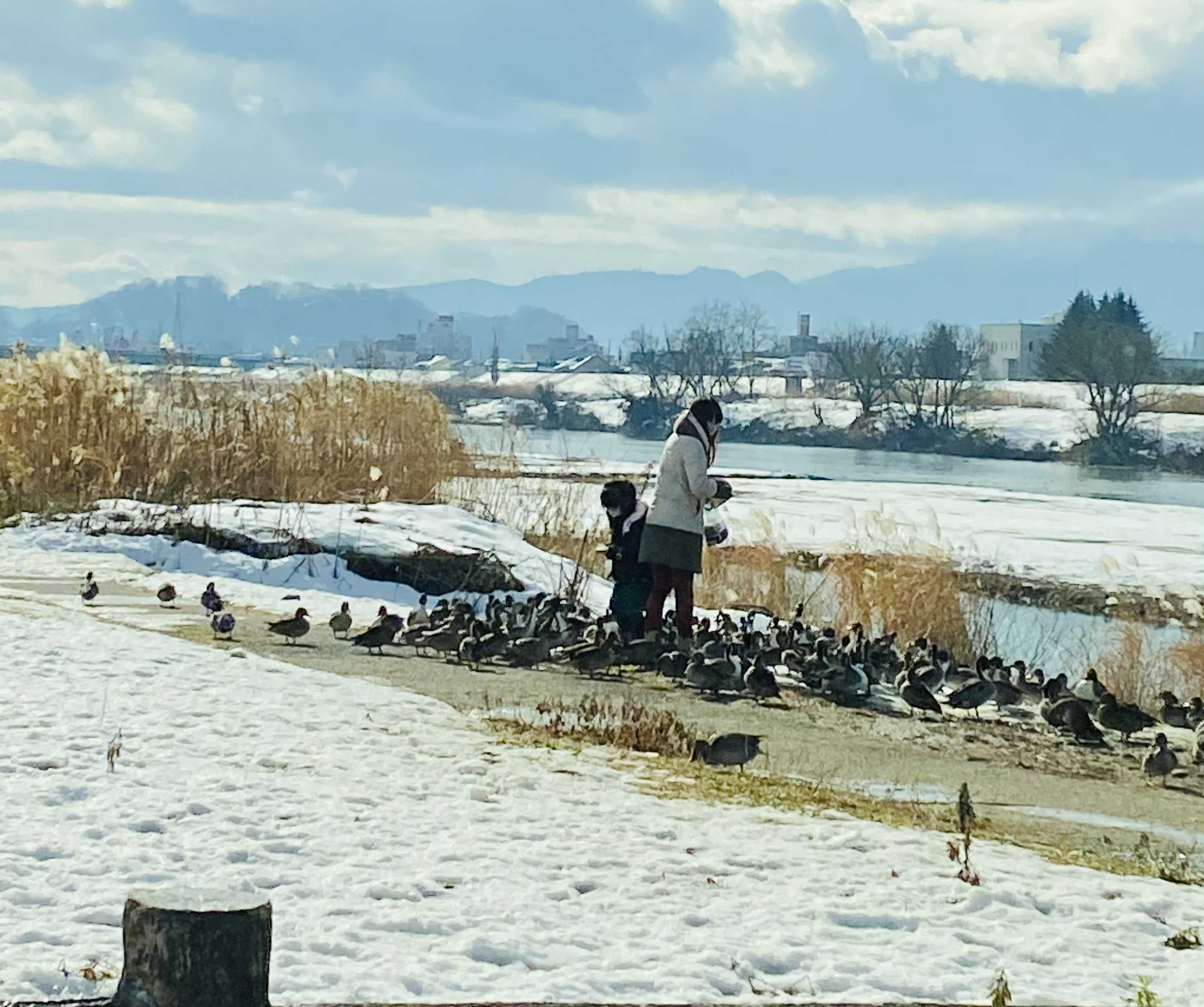 泳いでいる白鳥6~10羽くらい、中州に上がっている白鳥が5羽くらいでした。