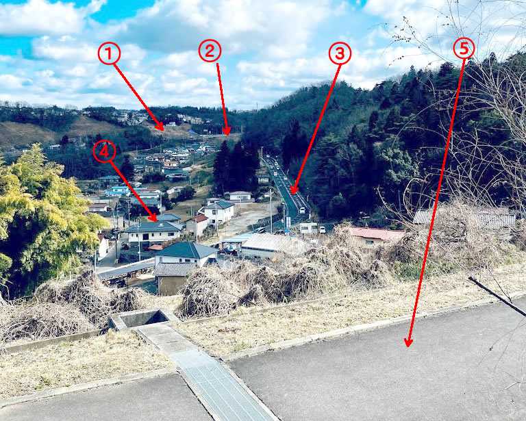 写真⑤の矢印 高台の共楽公園沿い、江戸・明治期の奥州街道あたりです。
