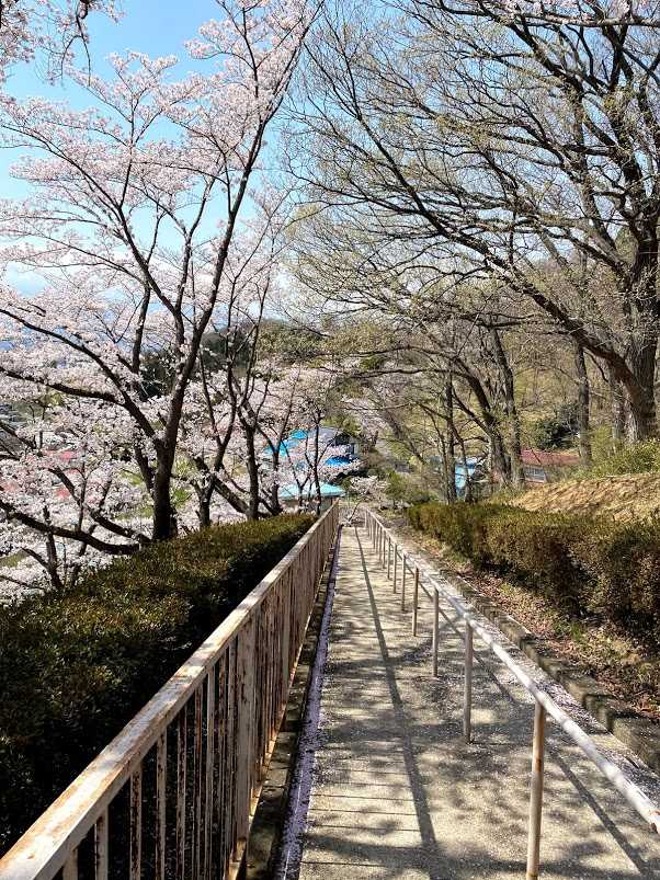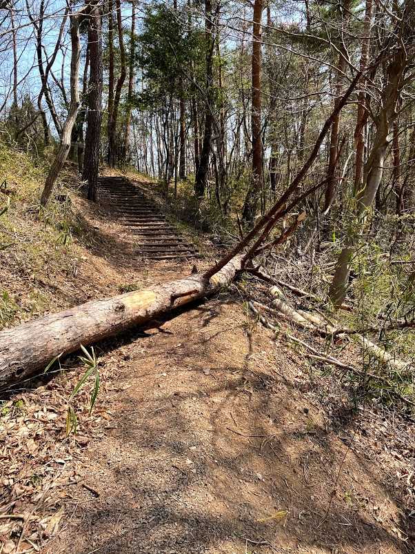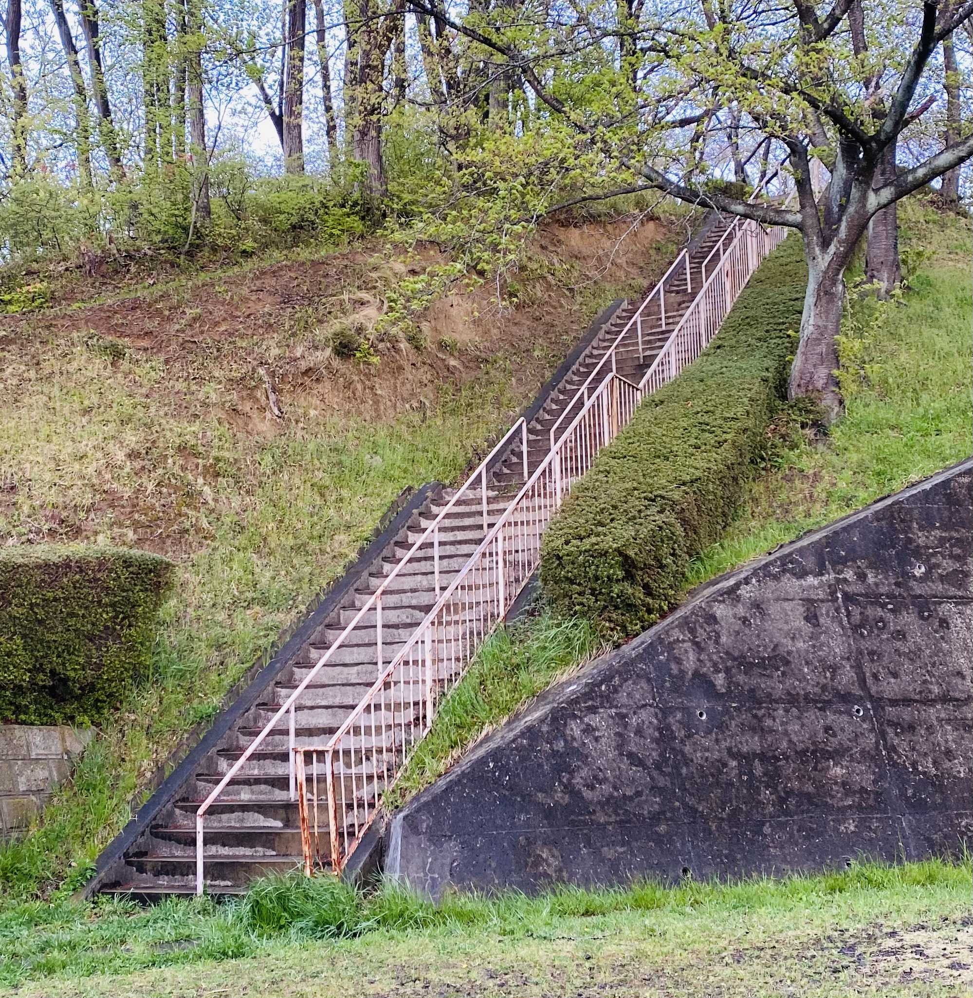 弁天山・椿舘跡地を途中まで下った所の道路を挟んで東に長い登り階段が有ります。