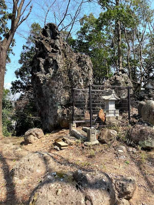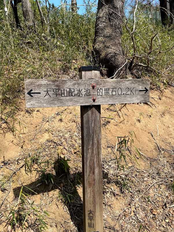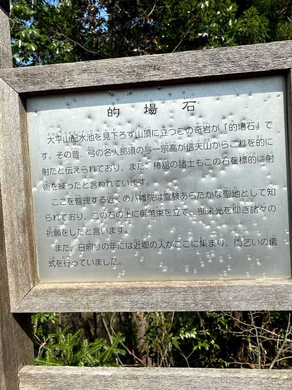 的場石(まといし)大平山配水池を見下ろす山頂に立つこの奇岩が「的場石」です。