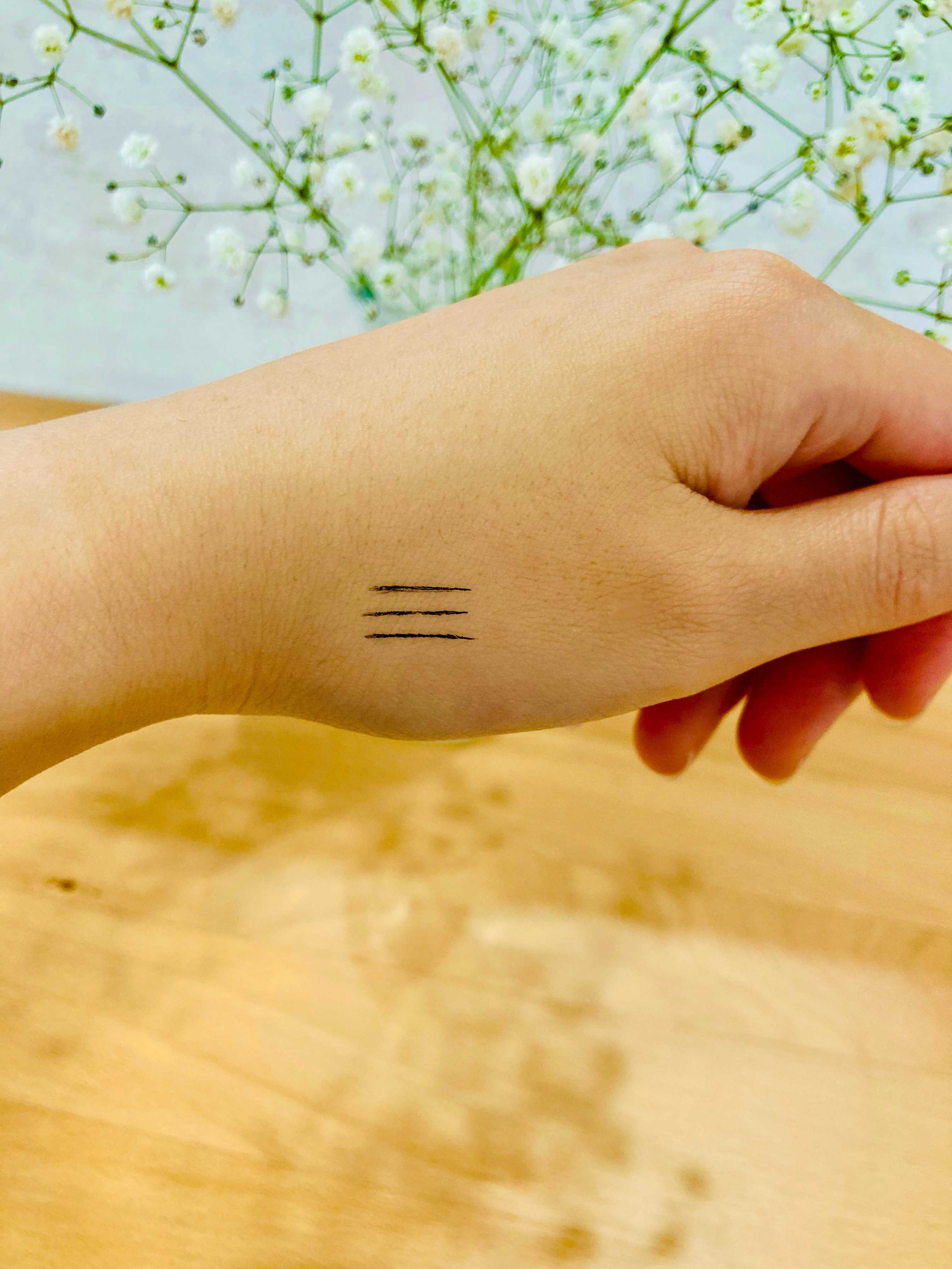 水、(アクリレーツ/アクリル酸エチルヘキシル)コポリマー、グリセリン、BG、(スチレン/アクリレーツ)コポリマーアンモニウム、アクリレーツコポリマーアンモニウム、ペンチレングリコール、ヒアルロン酸Na、セイヨウオトギリソウ花/葉/茎エキス、トウキンセンカ花エキス、カミツレ花エキス、フユボダイジュ花エキス、ヤグルマギク花エキス、ローマカミツレ花エキス、フェノキシエタノール、カーボンブラック