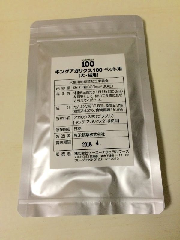 我が家のニャンコ、シェリーちゃんは1歳頃に急に皮膚が赤くなる食物アレルギーを発症しました。動物病院で調べてもらうと、どうやらチキンがダメだとわかり、食物アレルギー用の療法食を与えることになりました。今は2歳になり症状は治まっていますが、たま〜に首あたりにかさぶたができていたりします。痒くてかいたんだと思います。悪化したりしないか不安なためシェリーちゃんにいいものがないか探していました。そしたらアレルギーに良いというペット用のアガリクスを見つけました。キングアガリクス100 1粒300mg×30粒6480円(税込)人工添加物が入っていないキノコ100%なので安心です。いつものフードの中に入れてみました。大きさはあまり変わらない感じ。(同じ色で分かりづらいかな?真ん中にありますよ)与え方は、そのまま口に入れるか、フードに混ぜるかみたい。どれくらい与えるかの目安↓シェリーちゃんは5.5キロなので1粒。そのままだと食べてくれなかったので、砕いてフードと一緒にあげてみました。クンクン匂いを嗅いでます。食べてる(^^)もう全部食べた!美味しかったにゃ!もうにゃいの?お皿がキレイに!ワーイo(^▽^)o食べたー!食べてくれたので1週間試しましたが、今のところとても元気で、皮膚も赤くなったりしていないので、安心しました。アレルギーよくなればいいな〜(^^)気になった方はこちらの↓ホームページを見てみてくださいね!アガリクス犬猫用(ペット用)猫の皮膚病(症状、治療、予防)キングアガリクス100の通販会社ファンサイト参加中ランキングに参加しています。↓応援よろしくにゃ!にほんブログ村