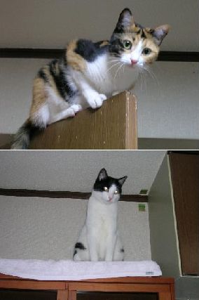 愛猫アイリスの前の飼い主さんから今月のメールが届きました。里子に出して1年が過ぎ、あちらも感慨深いものがおありだった様子。特に、母猫の里親さんとはなかなか連絡が取れないようで、心配というか諦めというか、複雑な心境のようです。2匹を里子に出しても、まだ4匹いて、かなりにぎやかとのこと。姉猫はちょっと神経質。弟猫は泰然自若。遊び好きなところは愛猫含め皆同じです。写真はドアの上に乗る身軽な姉猫と、食器棚の上の弟猫。姉猫と愛猫は本当によく似ています。愛猫の方がちょっぴり太めですかね。弟猫は母猫似です。 父親猫についてはだれも分かりません。母猫が白に黒のぶち。愛猫には茶のトラ模様がありますから、父猫は茶トラだったのかもしれません。