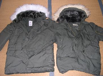 厳寒期用のフライトジャケット(パーカ)のN-3B。やっぱりヤフオクで落札してしまいました。民間品でない、軍に納入された「本物」が欲しいという思いを断ち切れませんでした。落札したのは、1988年製造のデッドストック品。ところが、数日後に届いた品物を手に取って裏地を見てみると、1975年の製造で、メーカーも違います。出品者に問い合わせたら、「梱包時に誤ってしまった」とのこと。製造年こそ違え、確かにこれも「本物」のデッドストック品に偽りはありません。コレクションとしての価値なら、31年前に作られたこちらの方がむしろ上でしょう。シェルもコットン50%、ナイロン50%で、見た目より軽く着やすい感じです。でも、今回は、コレクションとしてではなく、着つぶすつもりで落札したので、落札した商品を送り直してもらいました。同じ軍納入品でも、メーカーや製造年が異なると、どちらが上ということではなく、やはり違います。ジッパーのメーカーにこだわる人もいます(今回は同じジッパーメーカーでした)。比較してみますと、やはり88年製は、シェルやリブ、中綿がしっかりしています。アクリルファーも真っ白です。75年製は、ファーがやや黄ばんでいて、中綿も少し頼りない感じです。 (2枚のフラジャケ。右が75年製、左が88年製)そういう訳で、誤発送されてきた75年製を送り返しました。出品者との交渉次第では、こちらも手に入れることができたのかもしれませんが、予算の都合もありますので…。ちょっぴり(かなり)残念です。