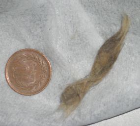 きょうは汚いものなのでご容赦。愛猫アイリスが毛球を吐き出しました。猫です。珍しいことではありません。布団の上に吐きそうになり、とっさに新聞の上に吐かせて、そのまま片付けるのを忘れてしまい、仕事を終えて帰宅すると、いい具合に乾燥していました。そこで、写真を撮ってみました。 こういうものが、小さな胃や食道を逆流してくるのです。吐く方は大変でしょうね。毛球対策として「キャットラキサティブ」や「スッキリン」というジェル状のものを舐めさせ、その結果、うんちに含まれて排出されてはいるようです。でもそれだけで全てを出し切ることはできないのですね。アイは10日か2週間に1回ぐらい「ゲー」します。いつも、朝のごはんの前が多いようです。長毛種でないのがまだ救いです。吐かずに毛球症になられても困ります。なるべく毛球をつくらずに、できてしまったらすぐに排泄(吐き出し)てもらうのが1番です。(毛球除去にキャットラキサティブ)(ラクサスタット)(スッキリン)ブログランキング