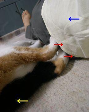 愛猫アイリスと寝る時、「こやつはこやつでそれなりに学習しているんだ」と感じることがあります。私と寝る時、アイは、私の左側に来ます。そして少し時間が経つと、なぜかお尻を私の顔の方に向けます。私はお世辞にも寝相のいい方ではありません。寝返りを打って、アイにのしかかってしまうことも(覚えていませんが)しばしばあるようです。そこで、アイは学んだのでしょう。寝る時に、私の左腰か太ももに後ろ脚を押し付け、つっかえ棒のようにして突っ張るのです。そうすると、私が寝返りを打つなど動きそうになった時に、さすがに脚で押し返すほどの力はないものの、脚を突っ張り続けることによって、その体勢のまま、私との距離を一定に保ったままで、ズズーっと平行移動して、のしかかられるのを防ぐのです。 (つっかえ棒の力学。嘘寝をしてアイをおびき出し、まんまと撮影)※ 「『アイちゃん寝るよー』で必ず」参照そうやって「工夫」しているのが分かった時、「それなりに知恵があるんだなあ」とちょっと感動しました。でも、この「作戦」には欠点もあります。アイが本格的に眠ってしまうと、脚を突っ張ることができなくなってしまうということです。アイもいずれまた、別の方法を考え出すかもしれません。ブログランキング