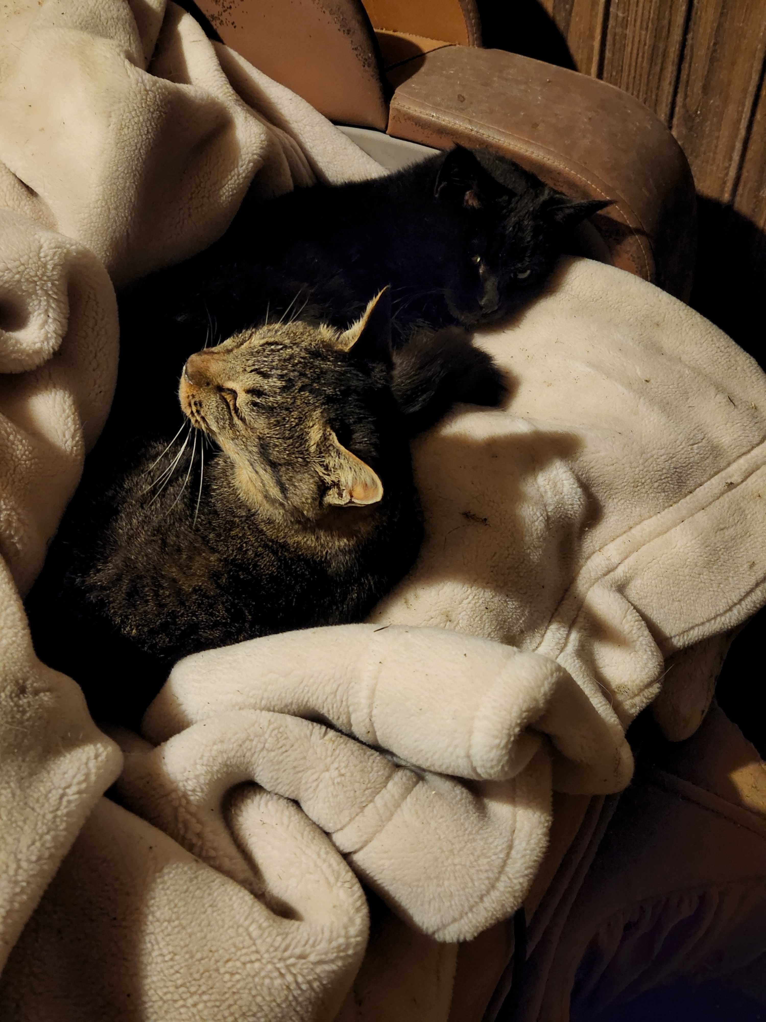 クロ子とちびおばちゃんは、毛布の下の湯たんぽがあることを学習して、毎晩一緒に寝ています