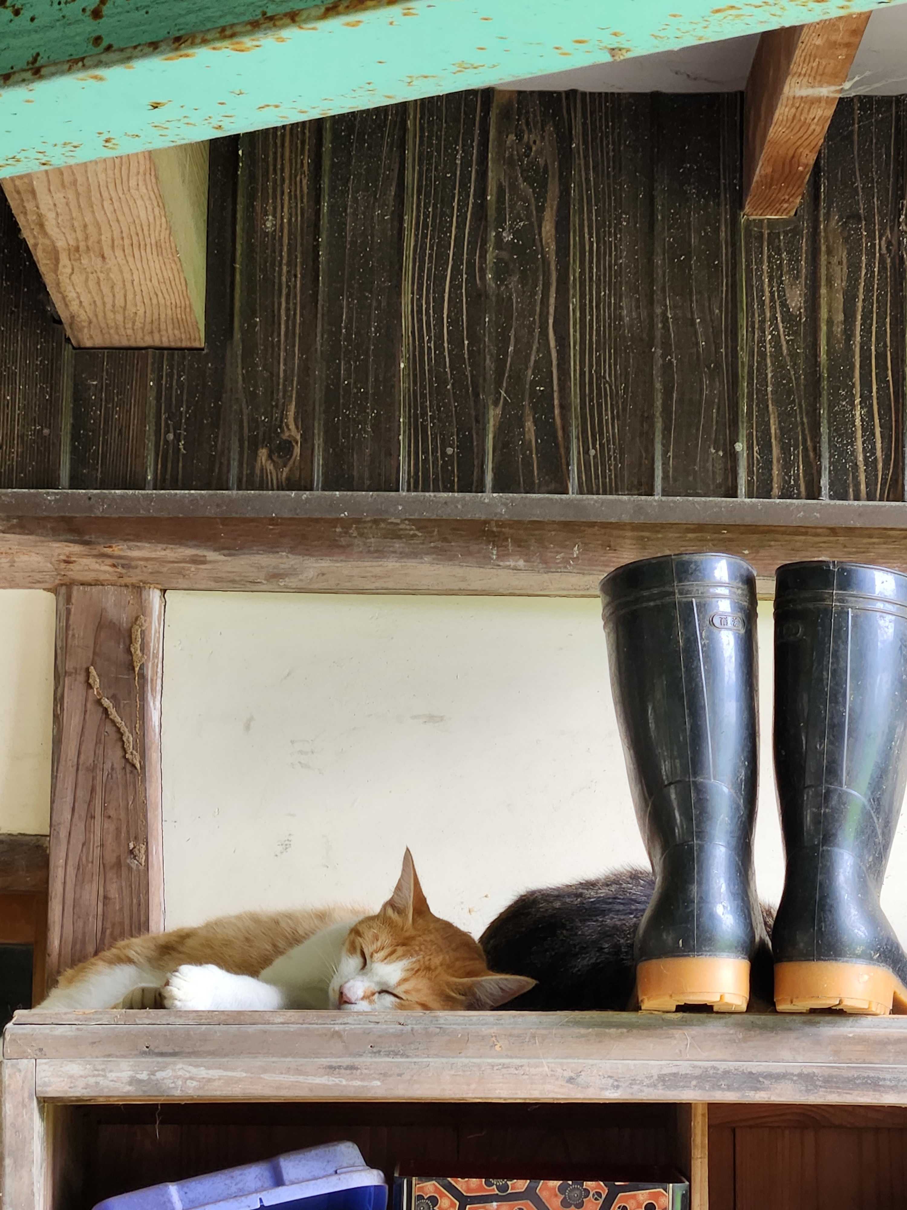 棚の上の長靴置き場は、メイ子と茶々により、次々と落下