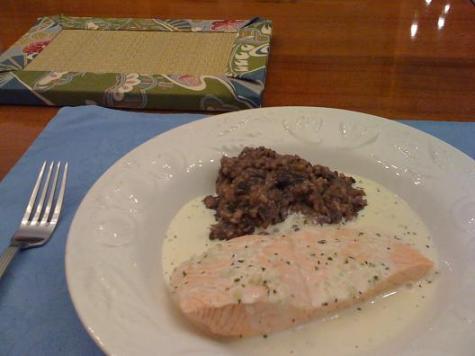 Happy New Year! ハワイの我が家風大晦日レポートはこちらを見てみてください。ポーチド(茹でた)サーモン4人前です。ブイヨンに必要なもの(これでサーモンを茹でます)6カップの水塩 小さじ1/2ベイリーフ 2枚パセリの茎の部分 5~6本レモンスライス 2枚白ワイン 1/2カップこれを沸騰させてから弱火で15分くらい加熱し、ブイヨンを作ります。サーモン 4切れシャロット(または玉ねぎ)みじん切り 大さじ2ガーリック みじん切り 大さじ1白ワイン 2/3カップホイップクリーム 1カップレモンジュース 小さじ1~2白胡椒 少々パセリ みじん切り小さじ1ブイヨンにサーモンを入れて7分くらい茹でます。その間にフライパンに大さじ1の油(またはバター)でシャロットとガーリックを軽く炒めて(茶色にならない程度)ワインとホイップクリームを入れます。半分の量になるまで煮詰めていきます。火を止めて、塩&白コショウで調味し、最後にパセリを散らします。ブイヨンから取り出し盛り付けたサーモンの上にソースをかけて出来上がりです。本日は8種類の雑穀と豆のリゾットを添えて。残りのブイヨンはスープのいいだしになりますよぉ^^。