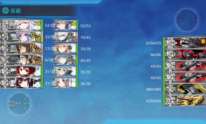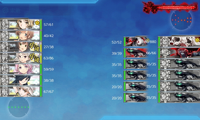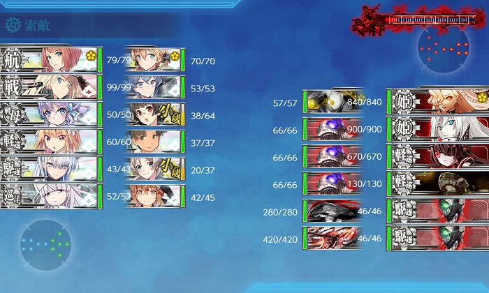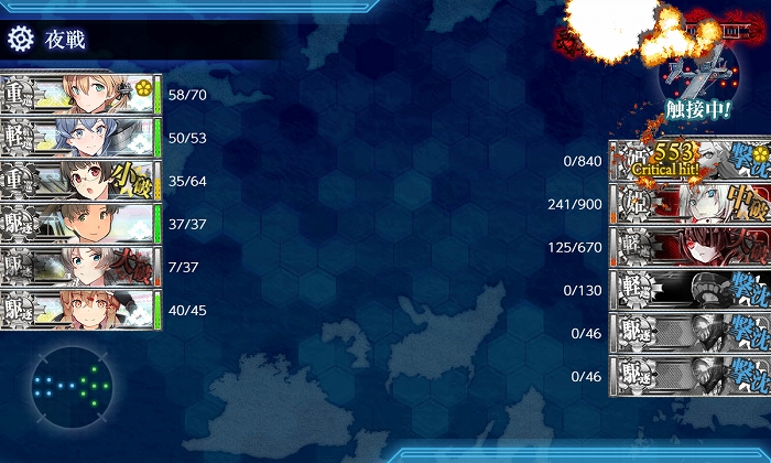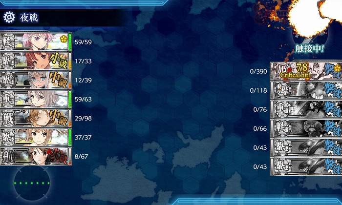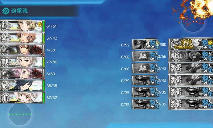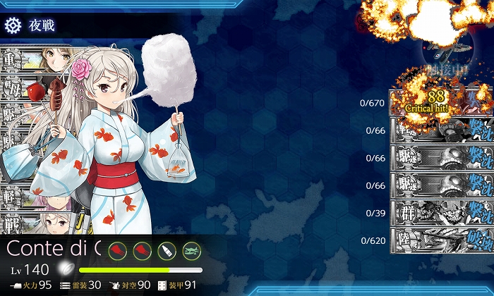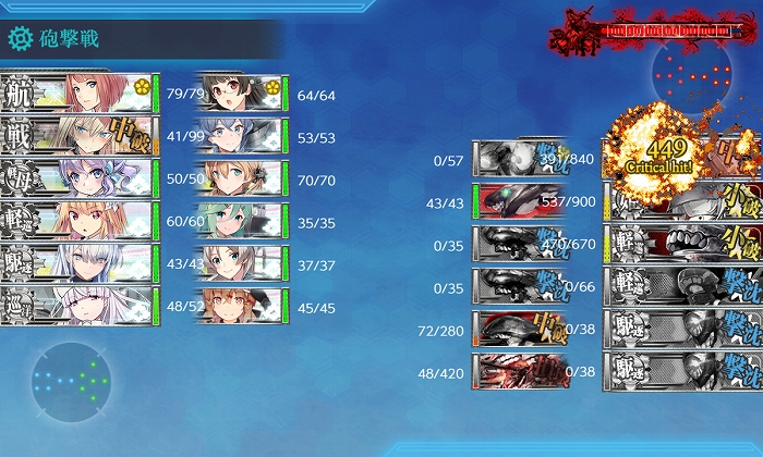 夜戦開始時に3隻残りでしたがPrinzのCIで撃沈! 削りは6出撃中S1、A4、撤退1。破壊は3出撃中S1、A1、撤退1でした。